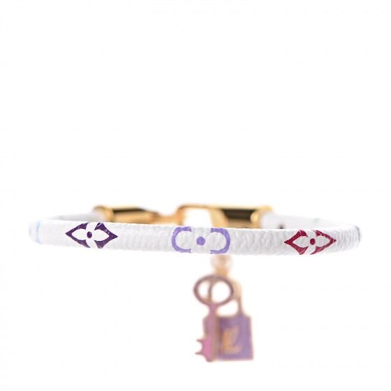 White chic bracelet is created of rolled Louis Vuitton monogram toile canvas in white. It features polished brass D-ring clasp and brass purple and pink lock and key charms with the Louis Vuitton logo.