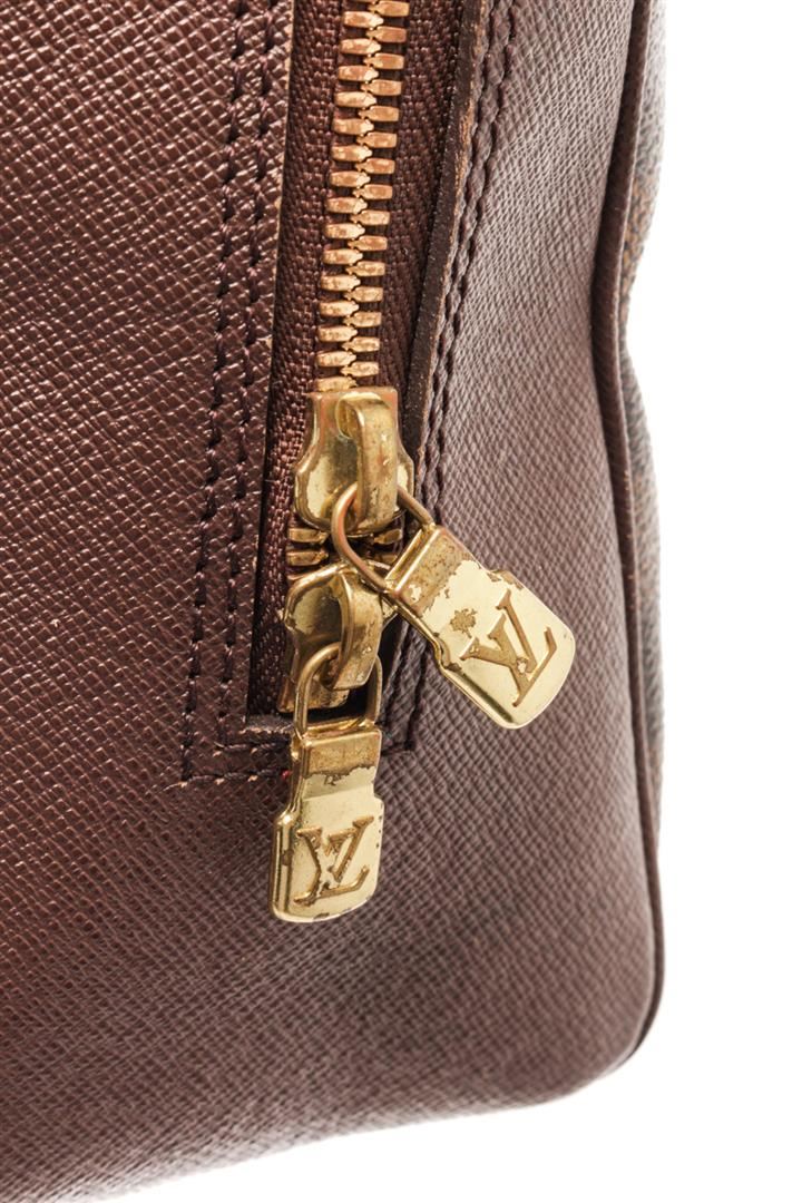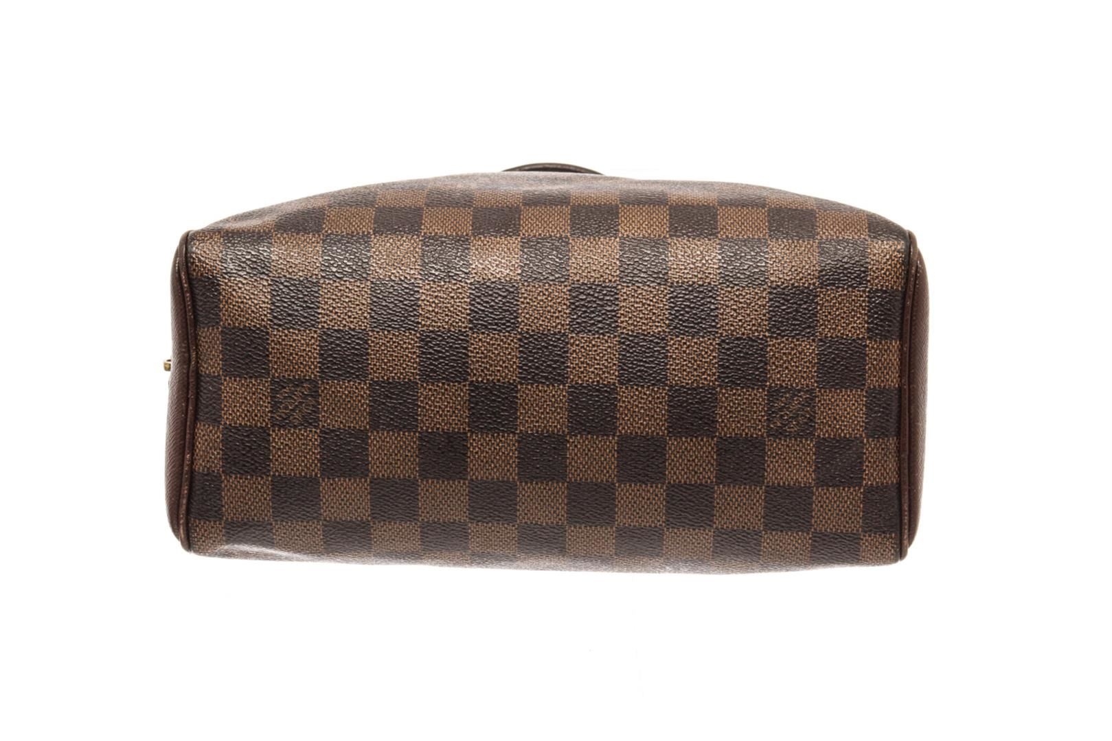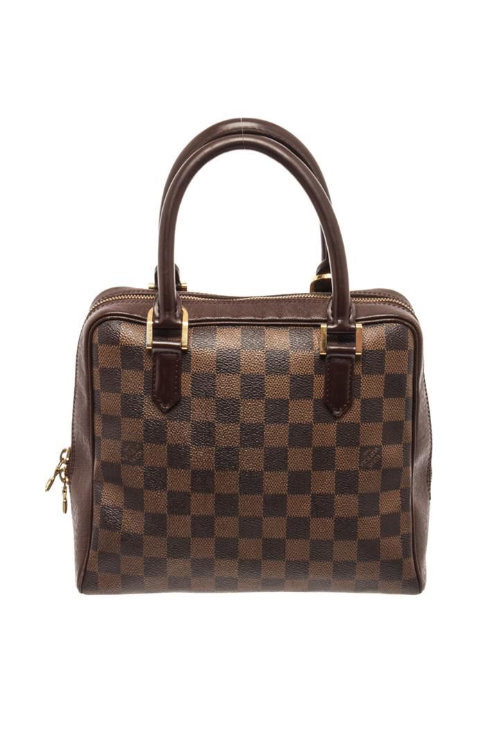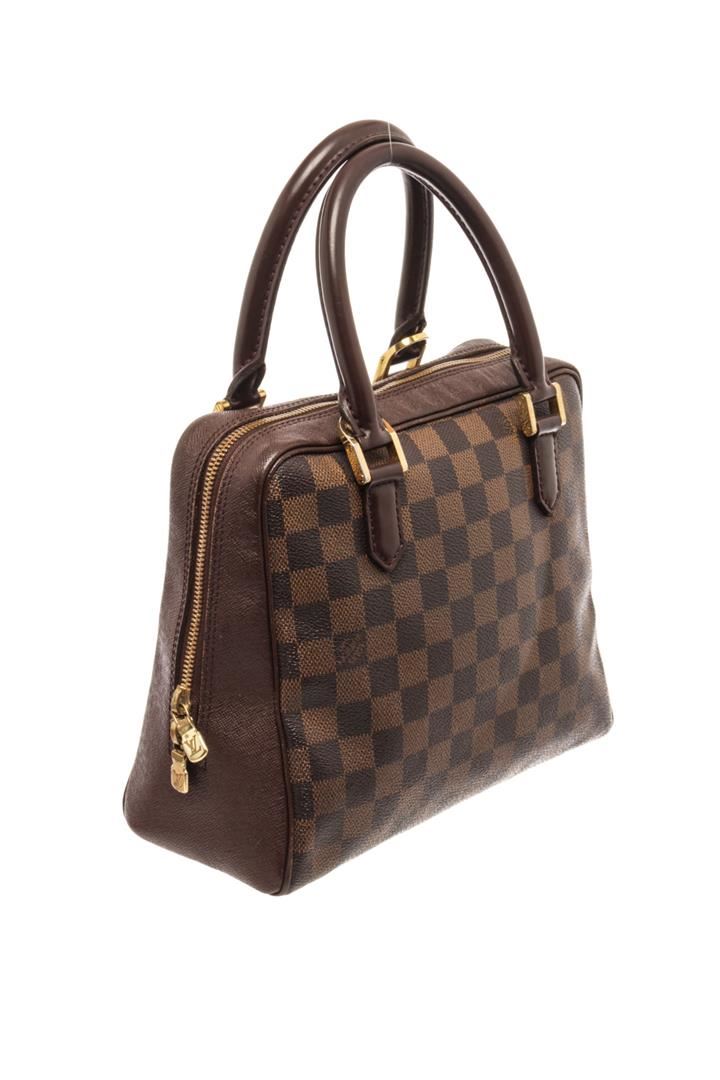 Louis Vuitton Brera handbag Damier Ebene Coated Canvas. Brand: Louis Vuitton, Style: Brera, Type: handbag, Exterior Color: Damier Ebene, Exterior Material: Coated Canvas, Exterior Pockets: none, Interior Color: burnt orange, Interior Material: similar to microfiber, Interior Pockets: one zip, Closure: zip, Handle/Strap Type: dual top handles, Length: 9 1/2, Width: 4 1/4, Height: 8, Handle Drop: 4 1/2. Condition: wear near zipper, on zipper pulls, and handle hardware. Additional Information: wear on hardware probably from a crossbody strap. Item is sold AS-IS and all information pertaining to this lot is available in the photos or this description.