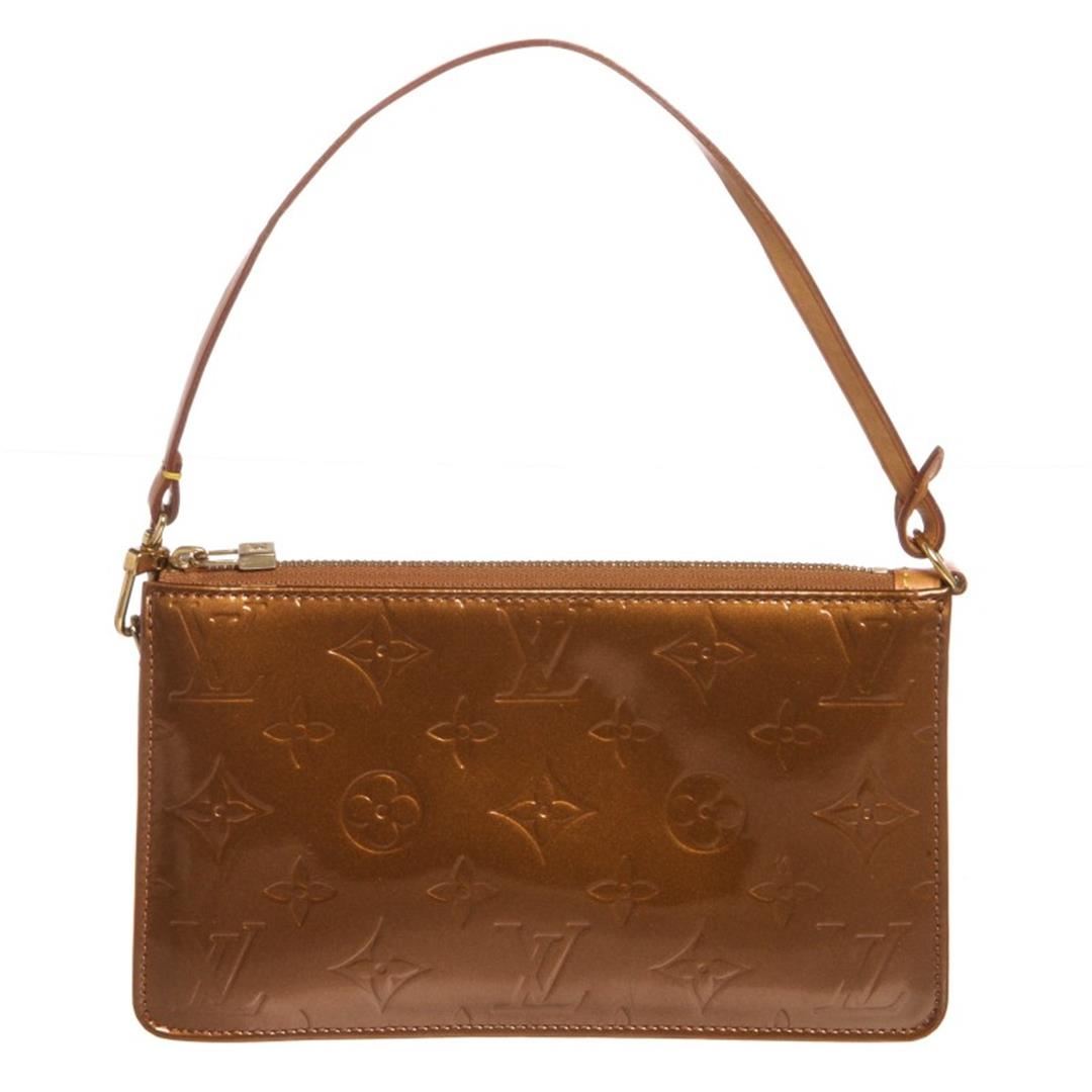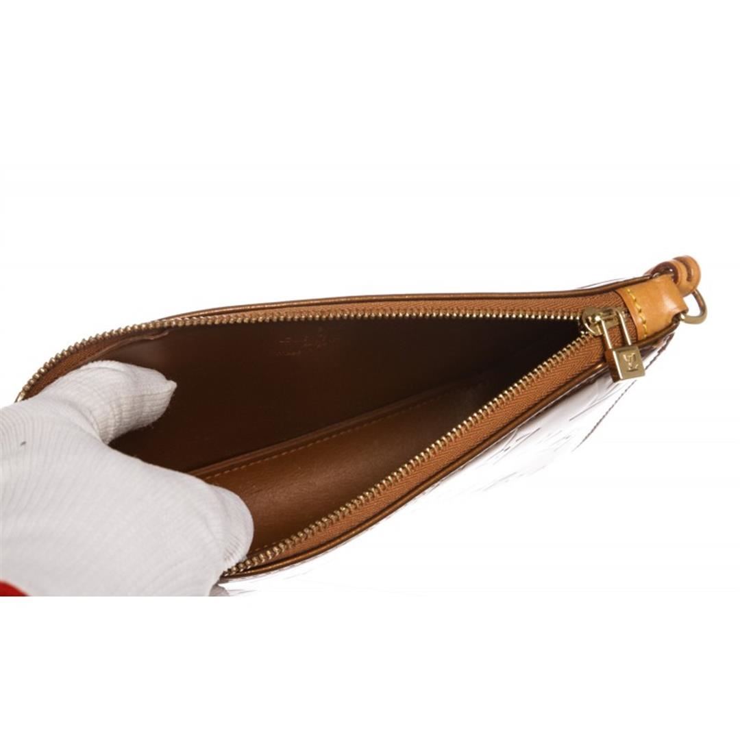 Monogram Vernis leather Louis Vuitton Lexington Pochette with brass hardware, tan vachetta leather trim, single flat top handle, tonal leather lining and zip closure at top. Item is pre-owned.