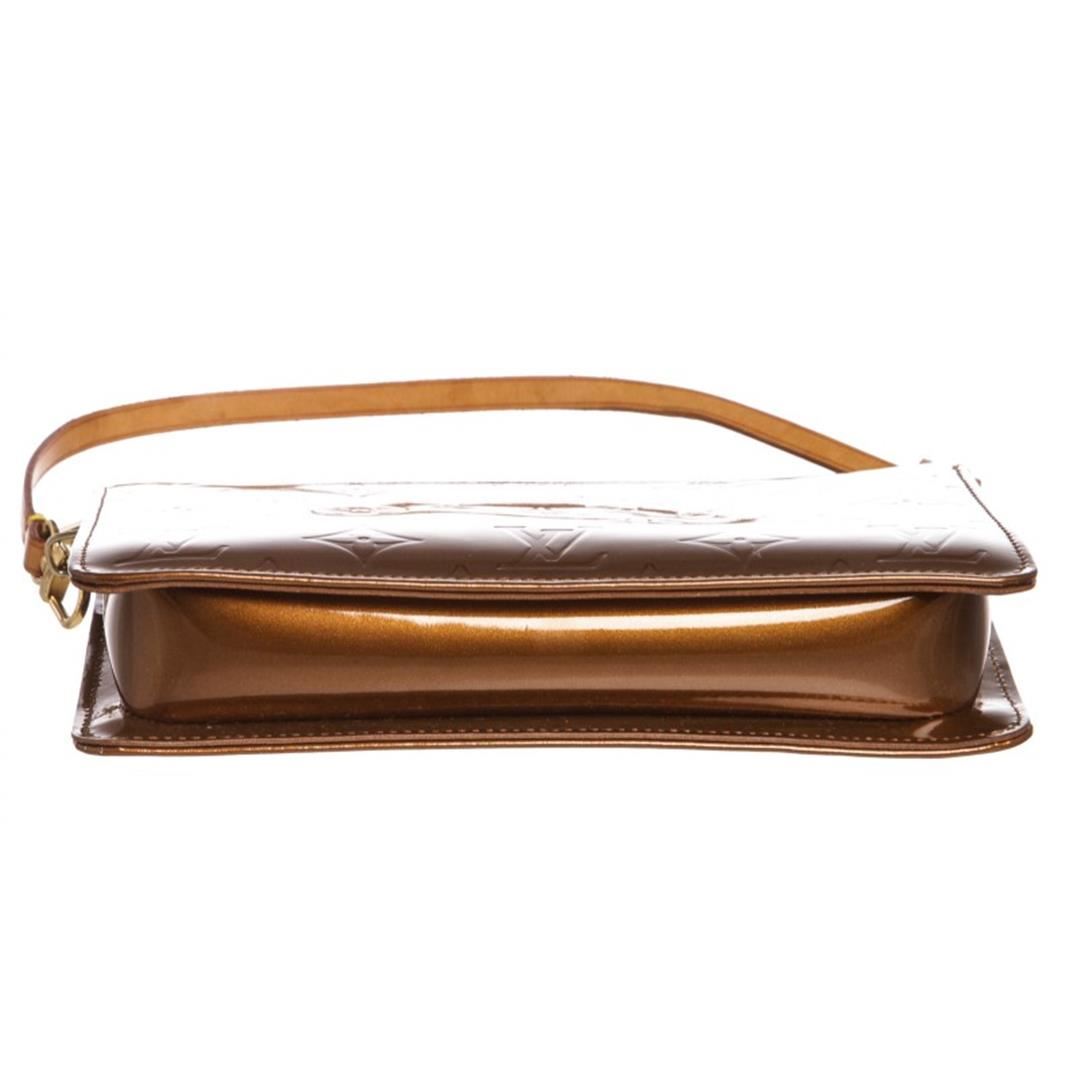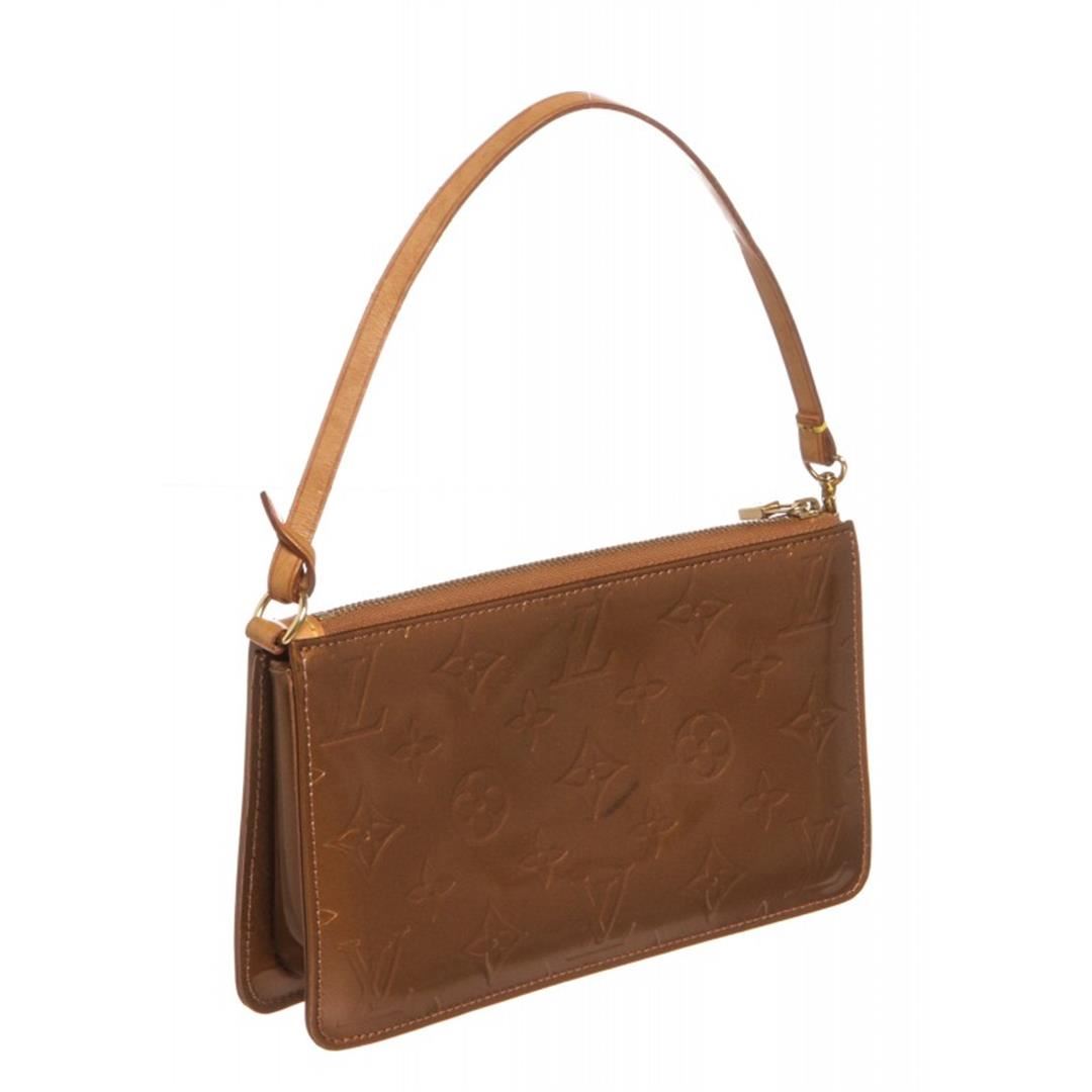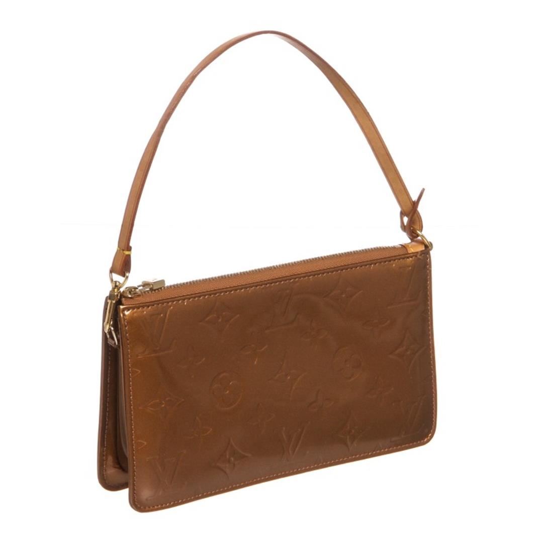 Monogram Vernis leather Louis Vuitton Lexington Pochette with brass hardware, tan vachetta leather trim, single flat top handle, tonal leather lining and zip closure at top. Item is pre-owned.