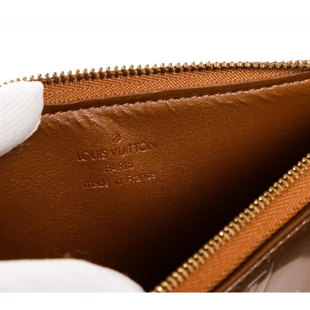 Monogram Vernis leather Louis Vuitton Lexington Pochette with brass hardware, tan vachetta leather trim, single flat top handle, tonal leather lining and zip closure at top. Item is pre-owned.