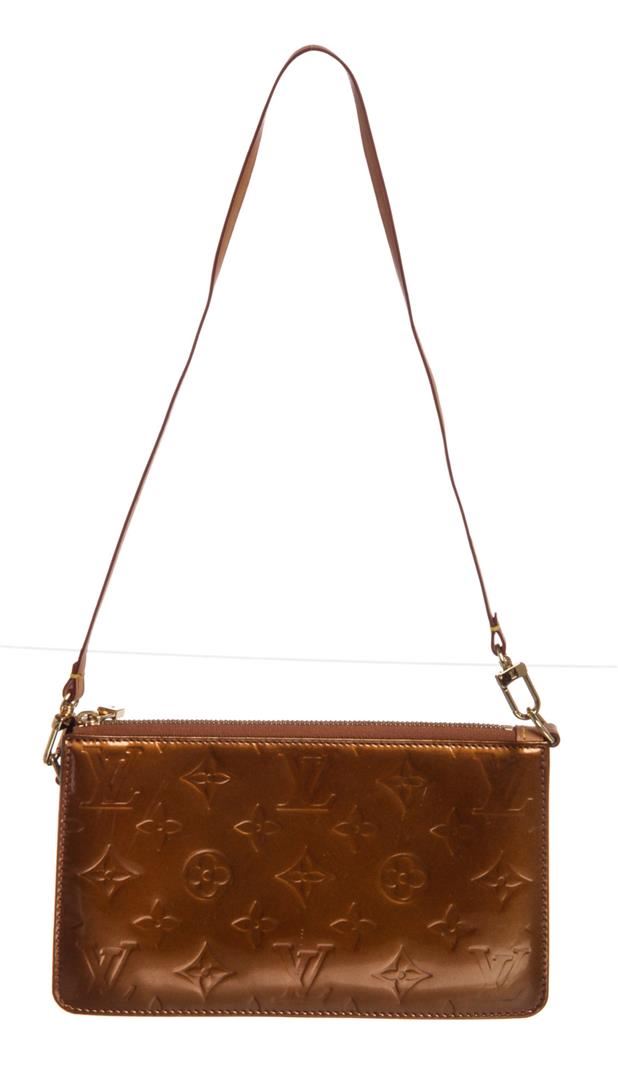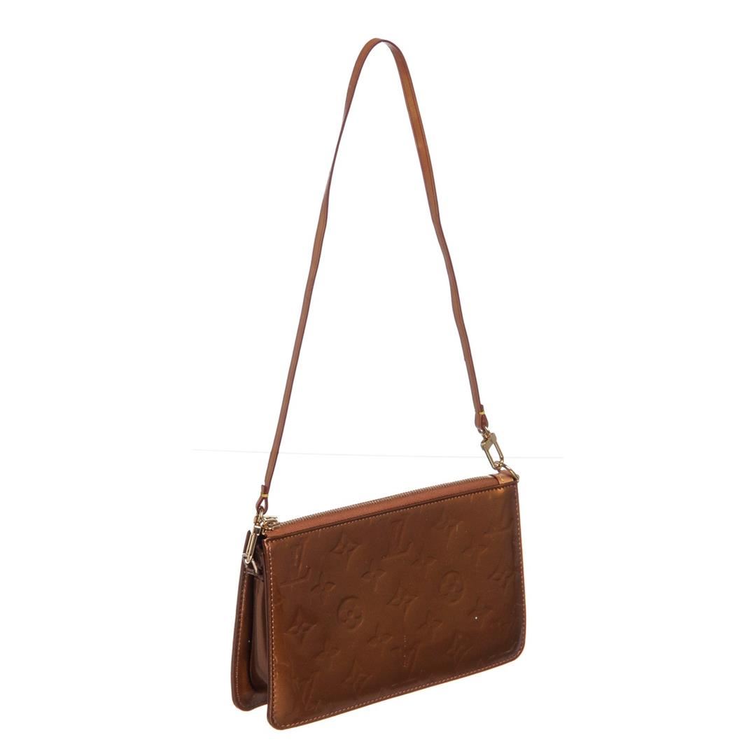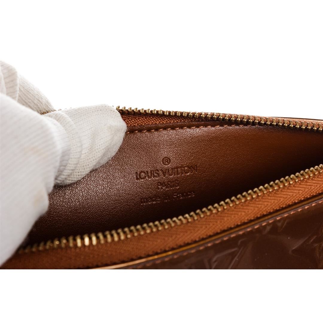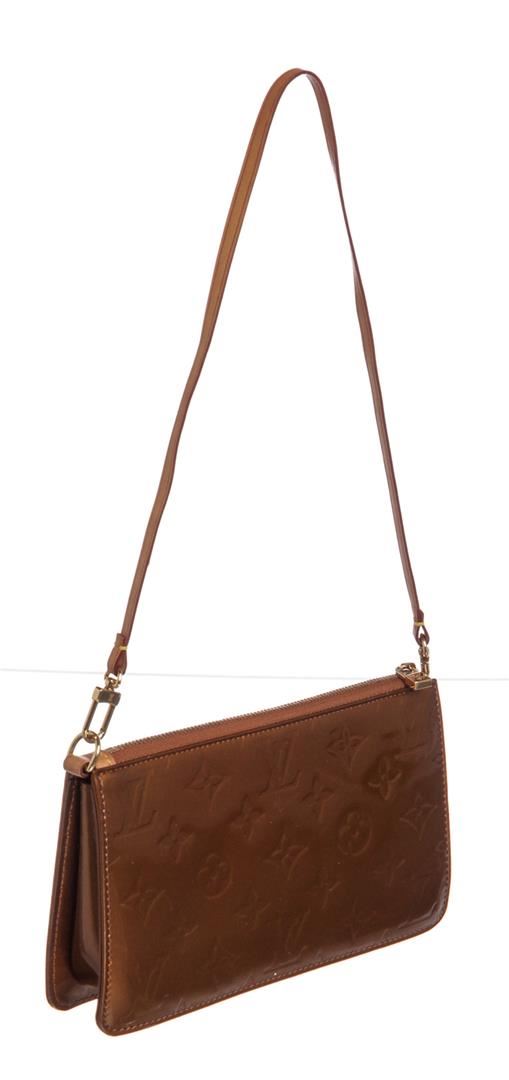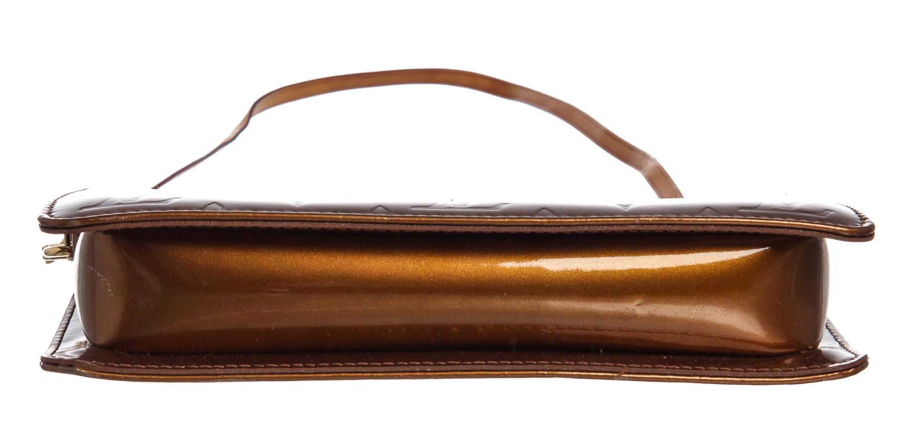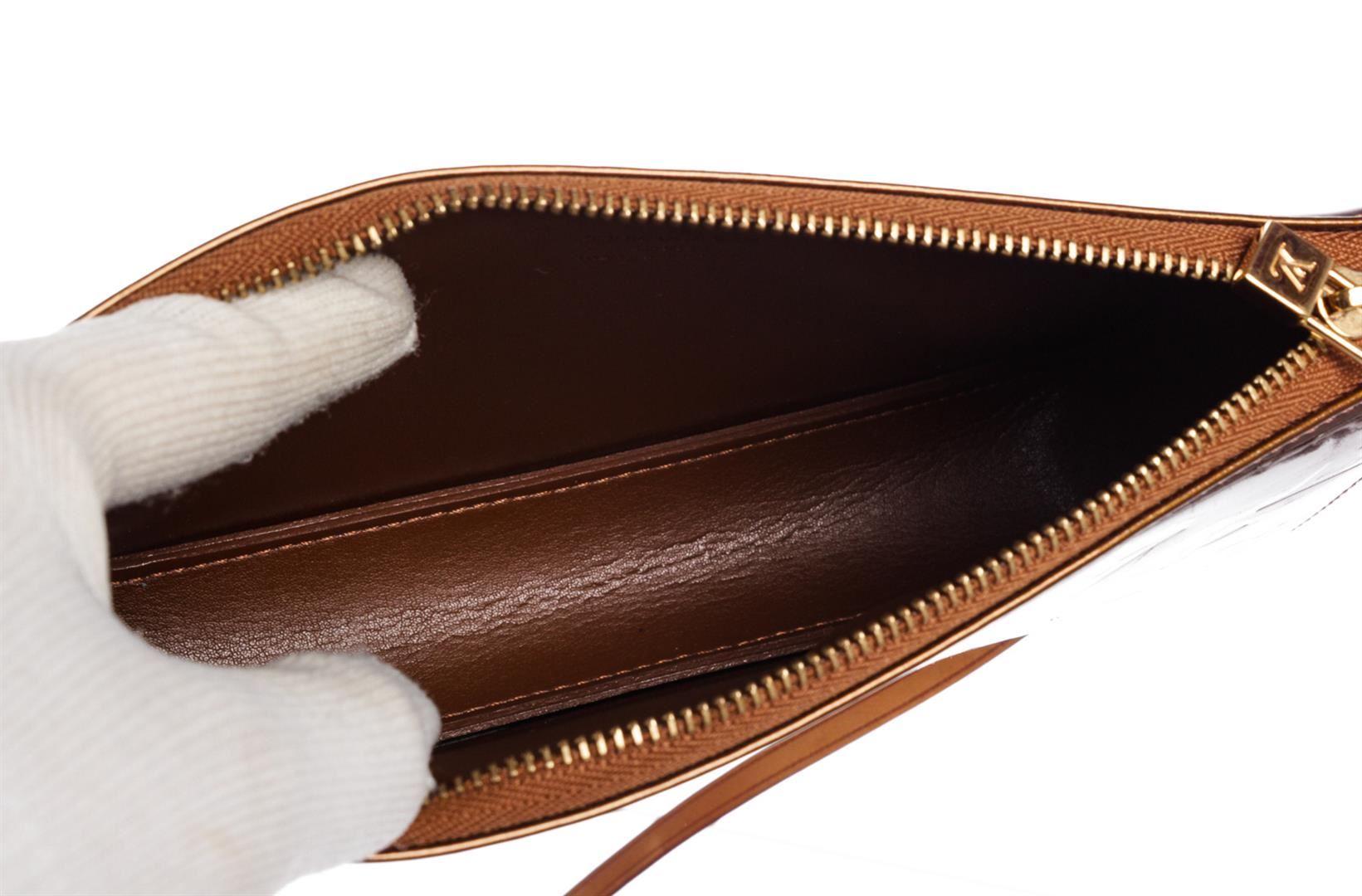 Bronze Monogram Vernis leather Louis Vuitton Lexington Pochette with brass hardware, tan vachetta leather trim, single flat top handle, tonal leather lining and zip closure at top. Authentic.