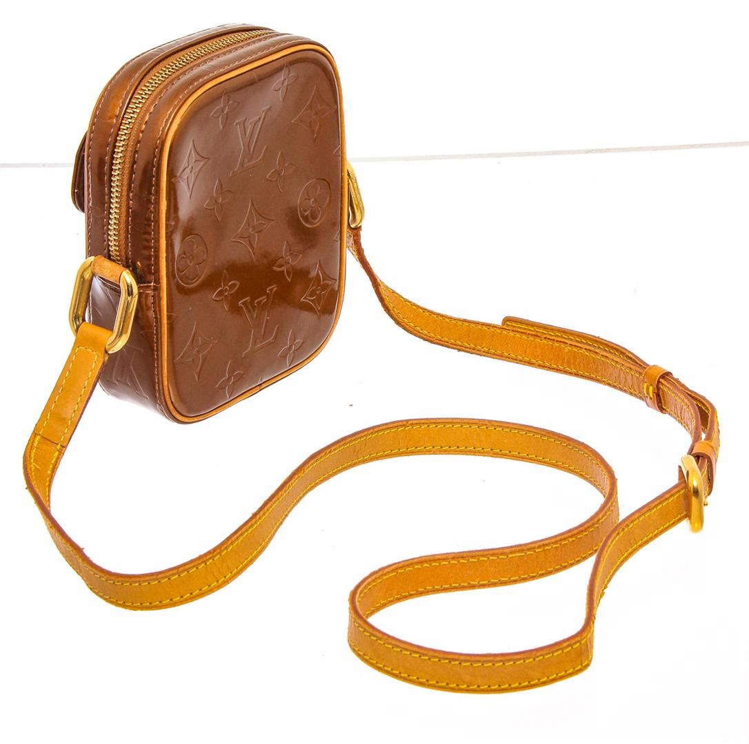Monogram Vernis patent leather Louis Vuitton Christie PM with gold-tone hardware, tan vachetta leather trim, exterior flap pocket with buckle, brown coated canvas lining (some pealing), interior slip pocket,and top zip closure.
