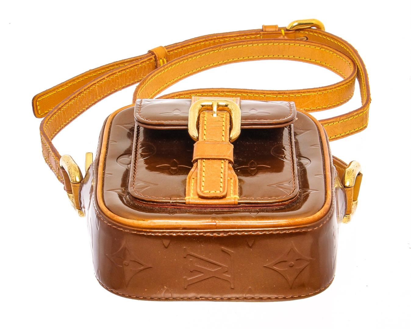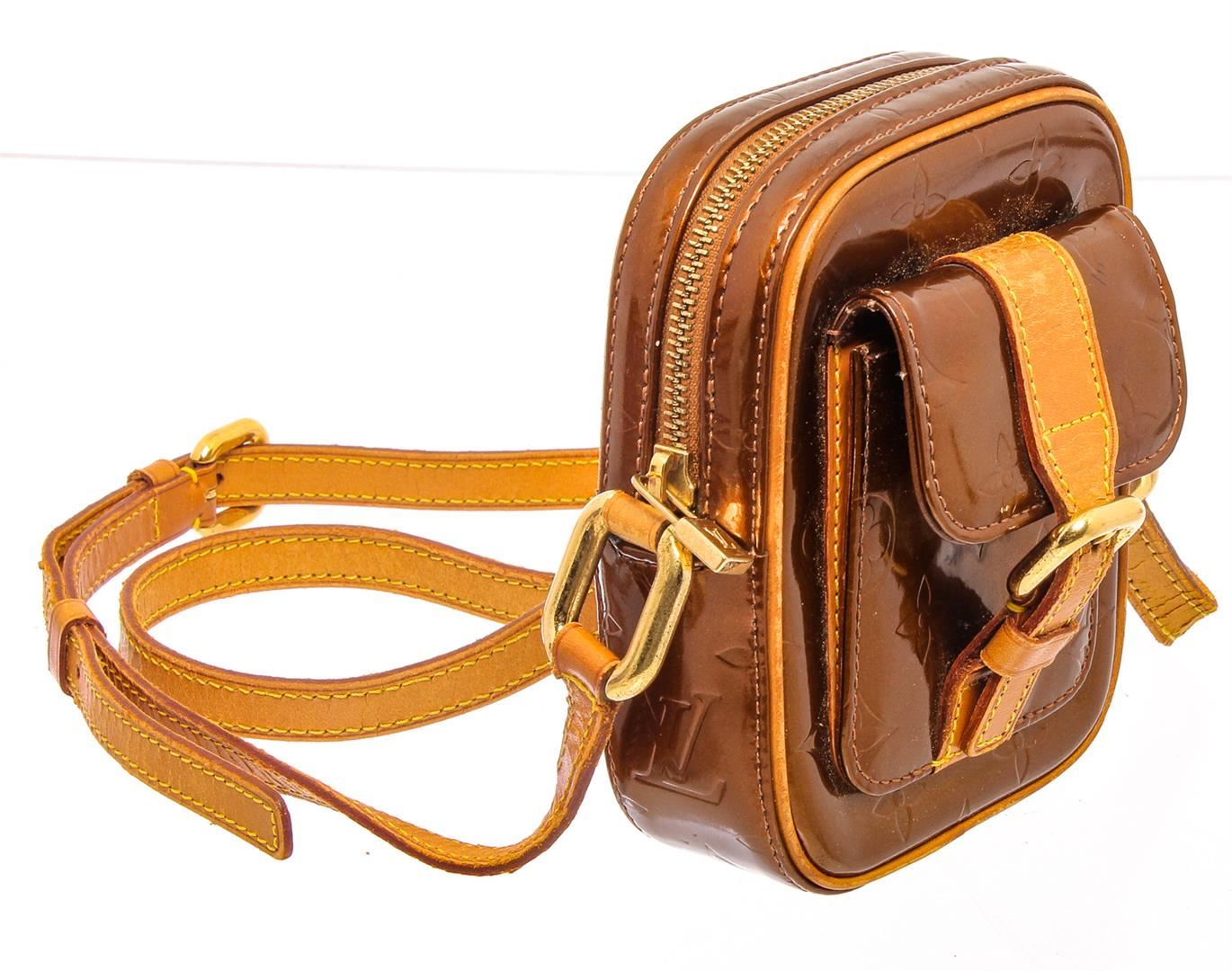 Monogram Vernis patent leather Louis Vuitton Christie PM with gold-tone hardware, tan vachetta leather trim, exterior flap pocket with buckle, brown coated canvas lining (some pealing), interior slip pocket,and top zip closure.