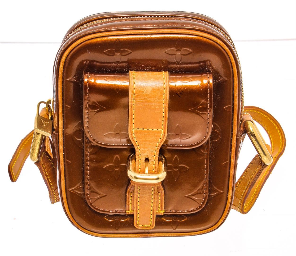 Monogram Vernis patent leather Louis Vuitton Christie PM with gold-tone hardware, tan vachetta leather trim, exterior flap pocket with buckle, brown coated canvas lining (some pealing), interior slip pocket,and top zip closure.