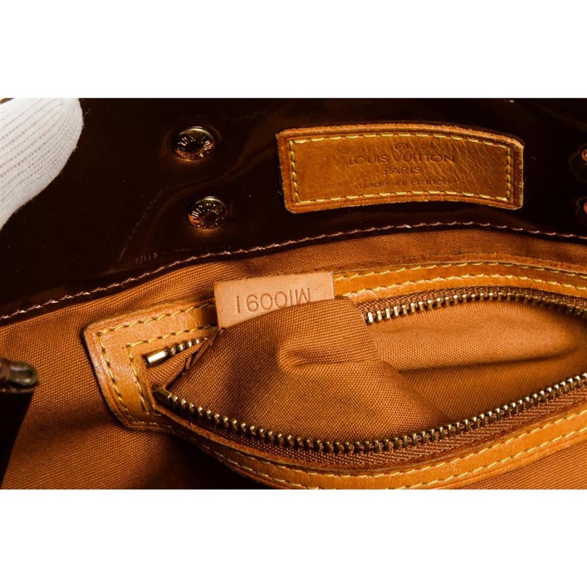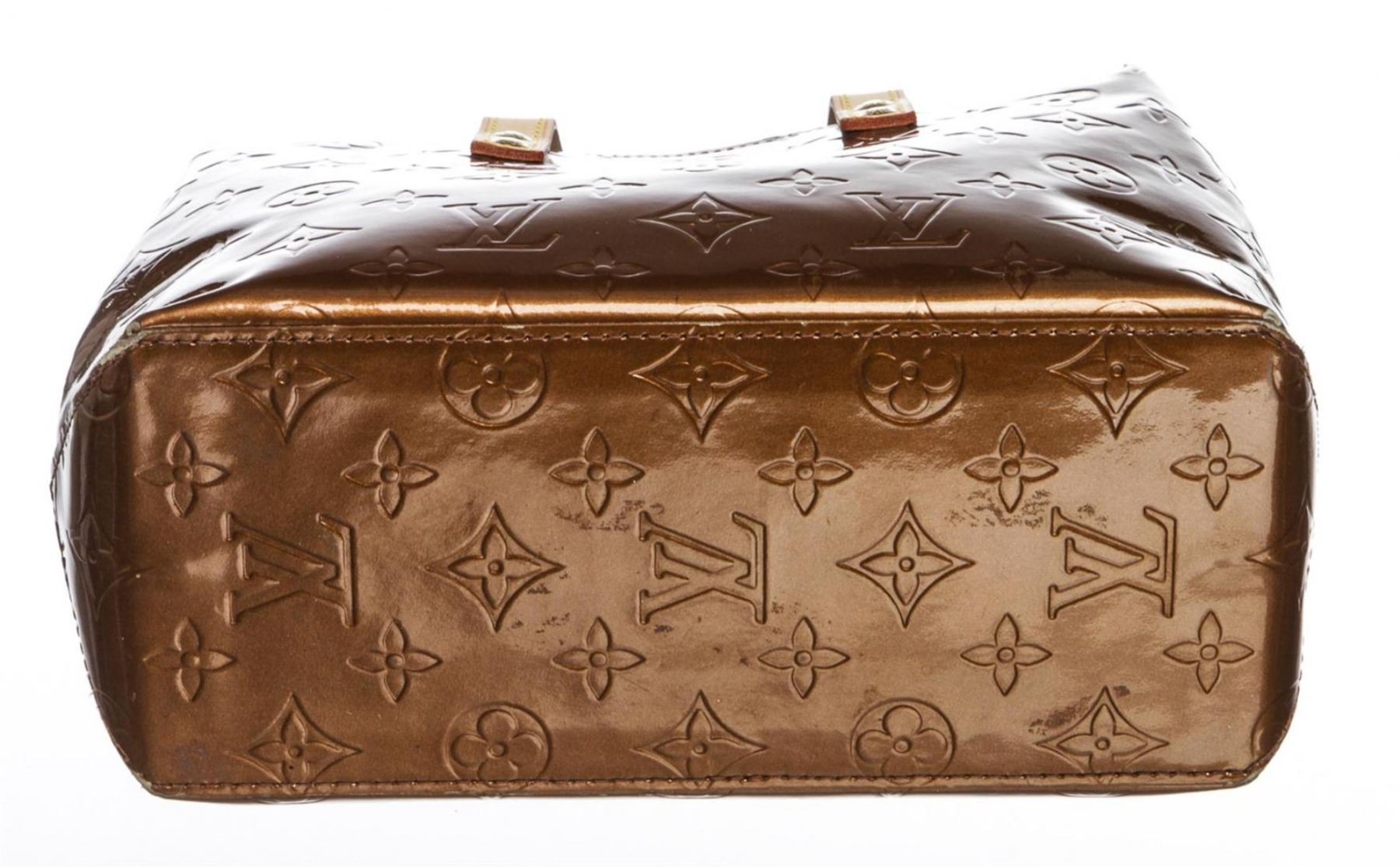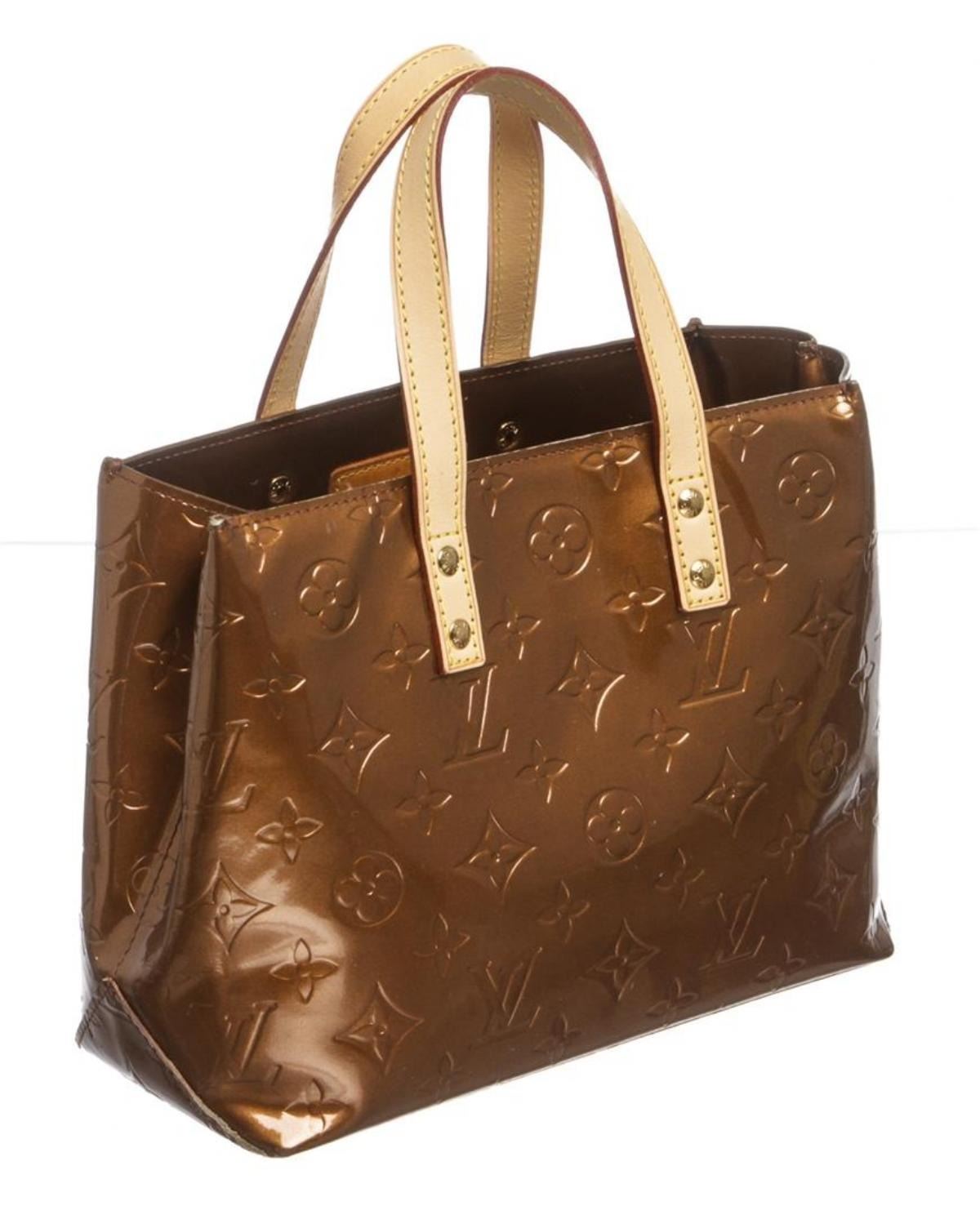 Monogram bronze Vernis leather Louis Vuitton Reade PM with brass hardware, tan vachetta leather trim, dual flat top handles, tonal canvas lining, single zip pocket at interior wall and open top. Authentic.
