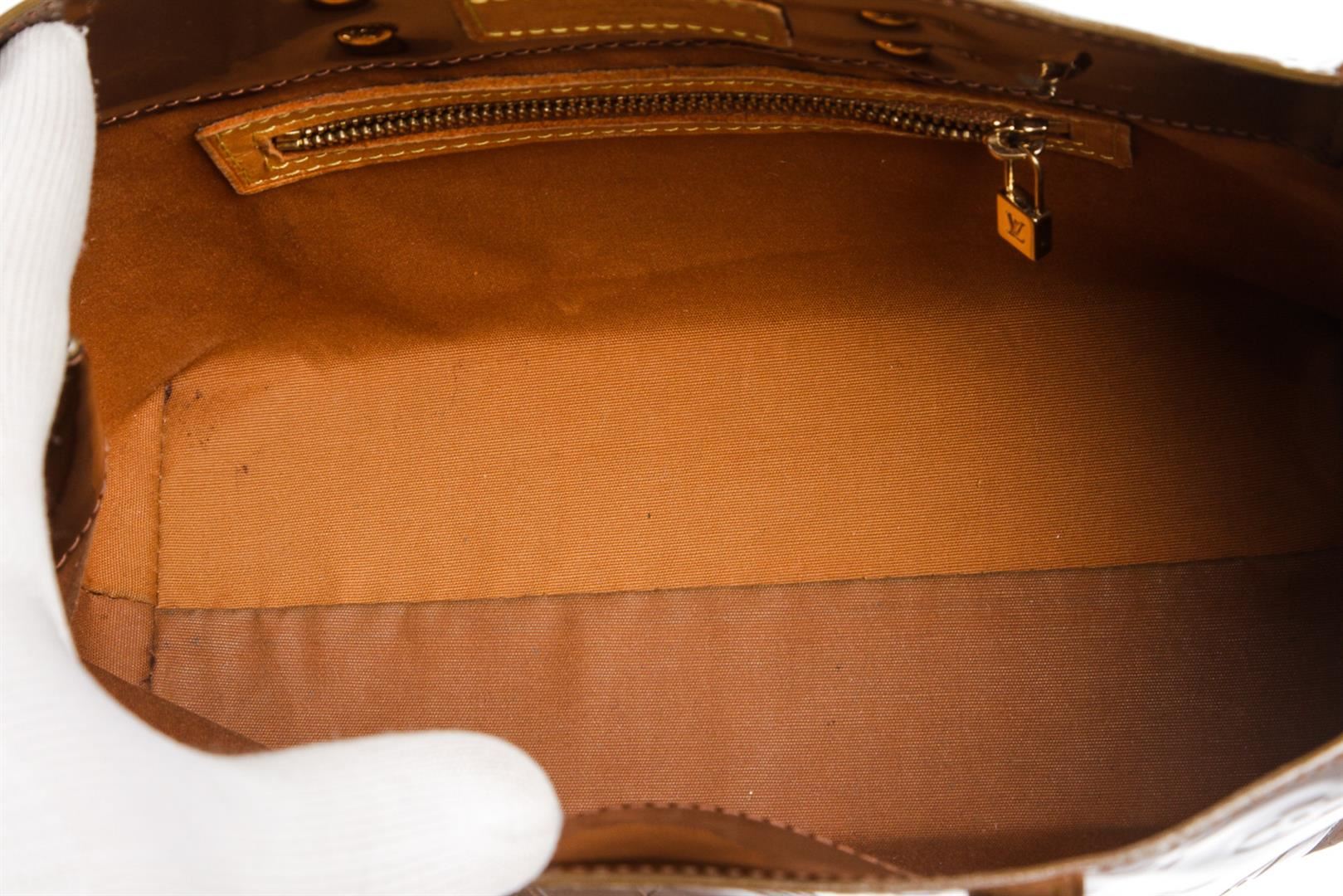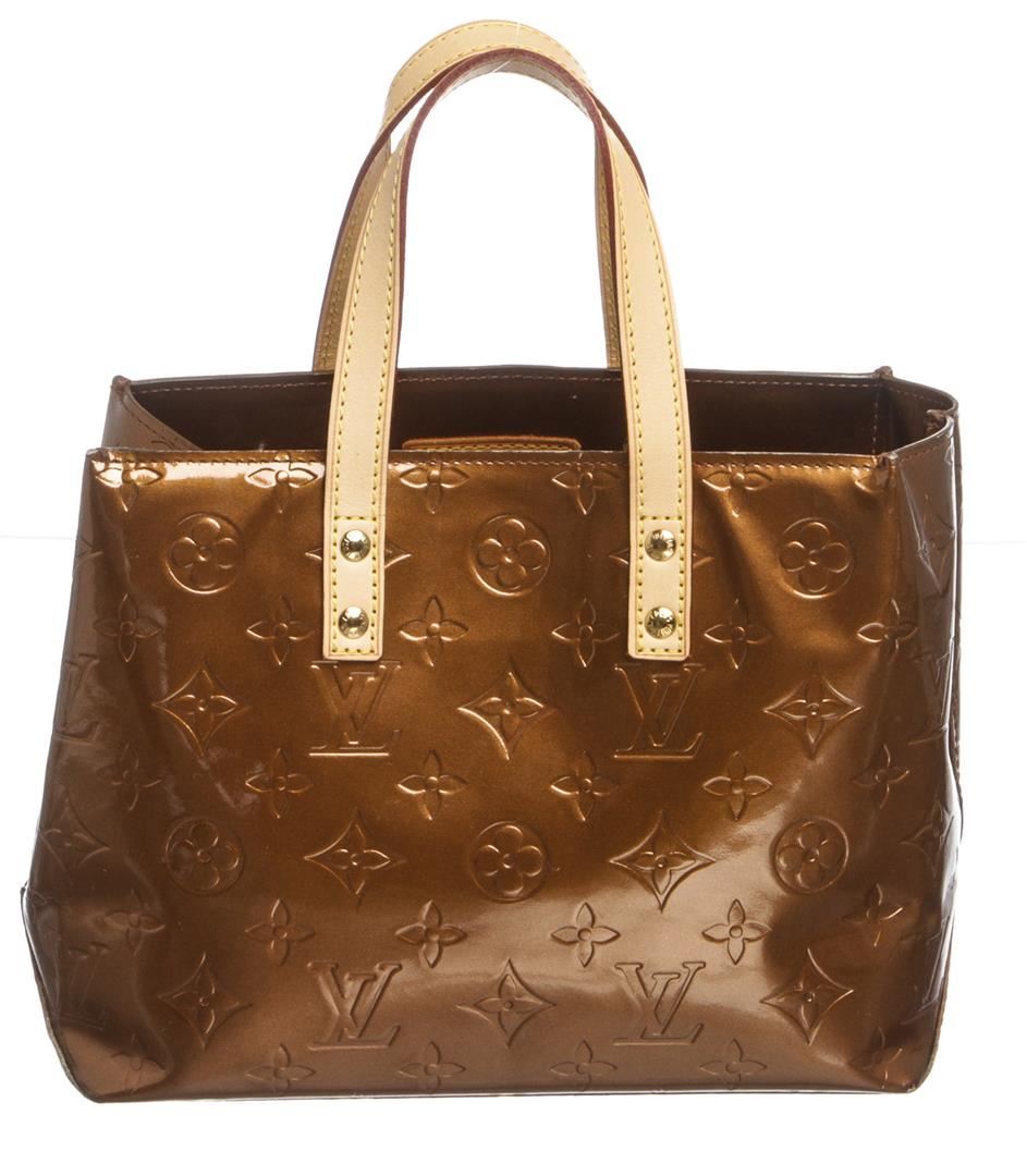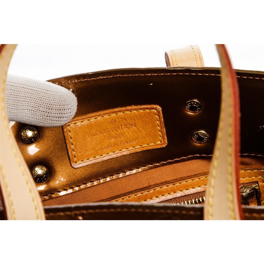 Monogram bronze Vernis leather Louis Vuitton Reade PM with brass hardware, tan vachetta leather trim, dual flat top handles, tonal canvas lining, single zip pocket at interior wall and open top. Authentic.