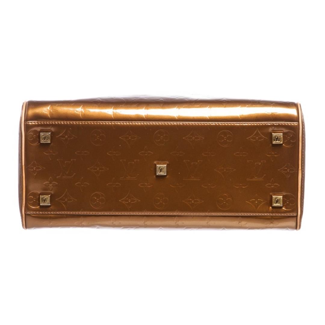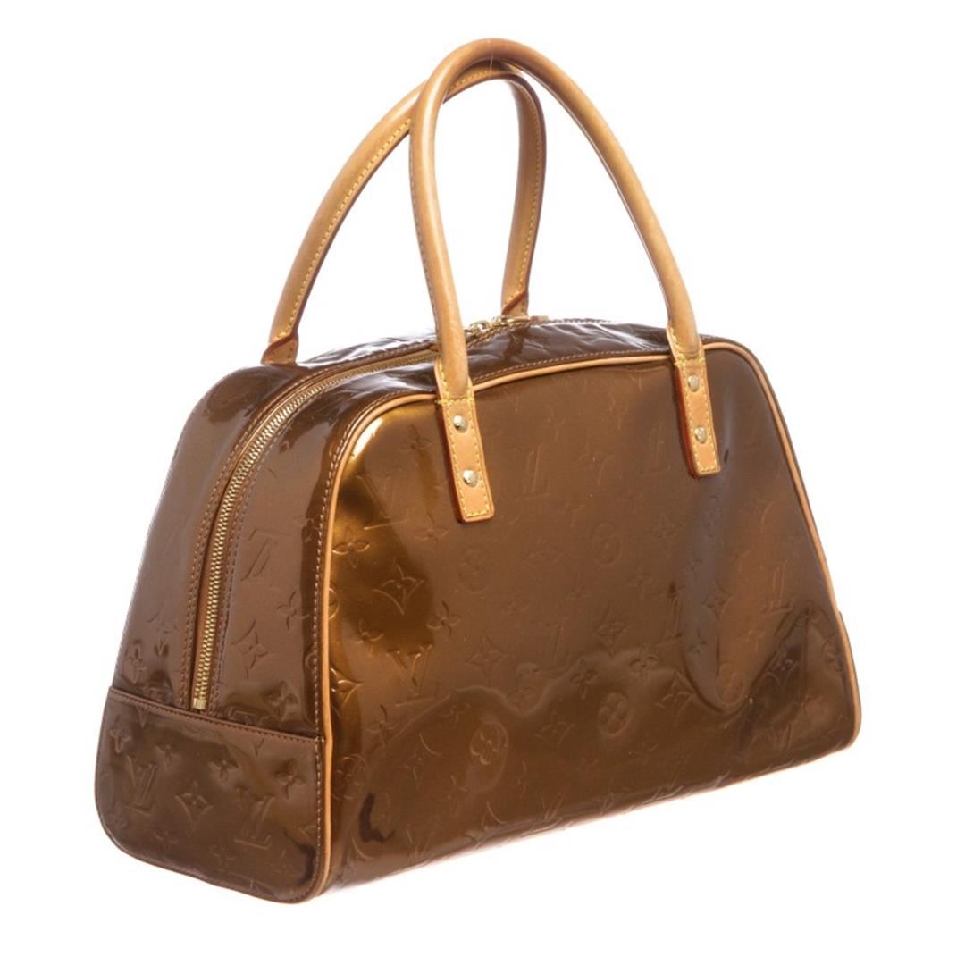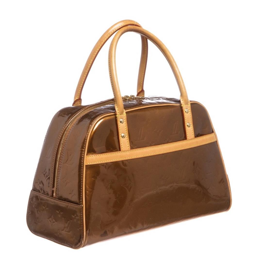 Monogram Vernis leather Louis Vuitton Tompkins Square handle bag with tan vachetta leather trim, brass hardware, dual rolled top handles, single exterior pocket, leather lining, dual pockets at interior wall and two-way zip closure at top. Item is pre-owned.