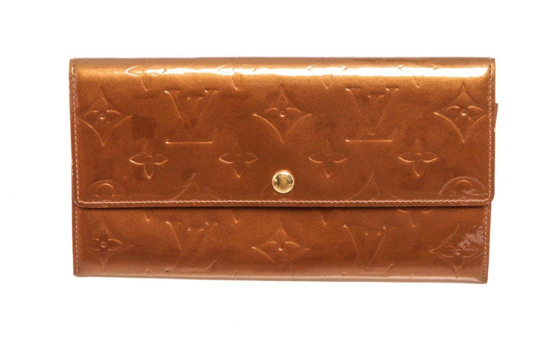 Louis Vuitton Bronze Vernis Leather Sarah Wallet with gold-tone hardware, trim tan vachetta leather, interior three compartments pocket and zip snap closure. Measurements: Length: 0.75 in / 2 cm Width: 7.25 in / 18 cm 4 in / 10 cmCONDITION: Pre-Owned Good overall, please see photographs for detail.