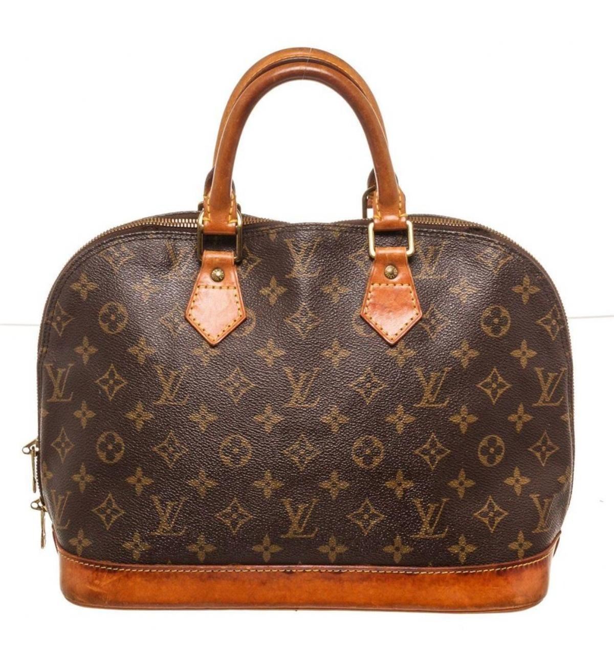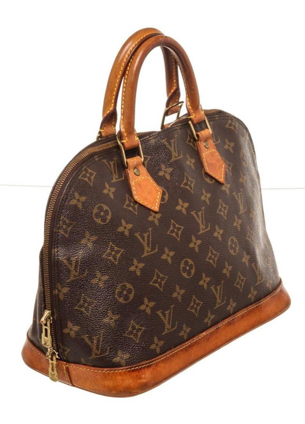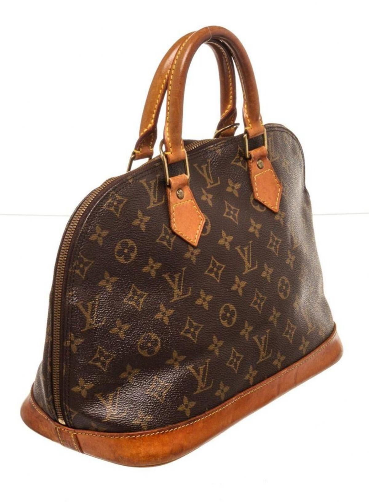Louis Vuitton Brown Alma MM Satchel Bag with material monogram canvas, gold-tone hardware, trim tan vachetta leather, interior slip pockets, dual top handle and zipper closure.
