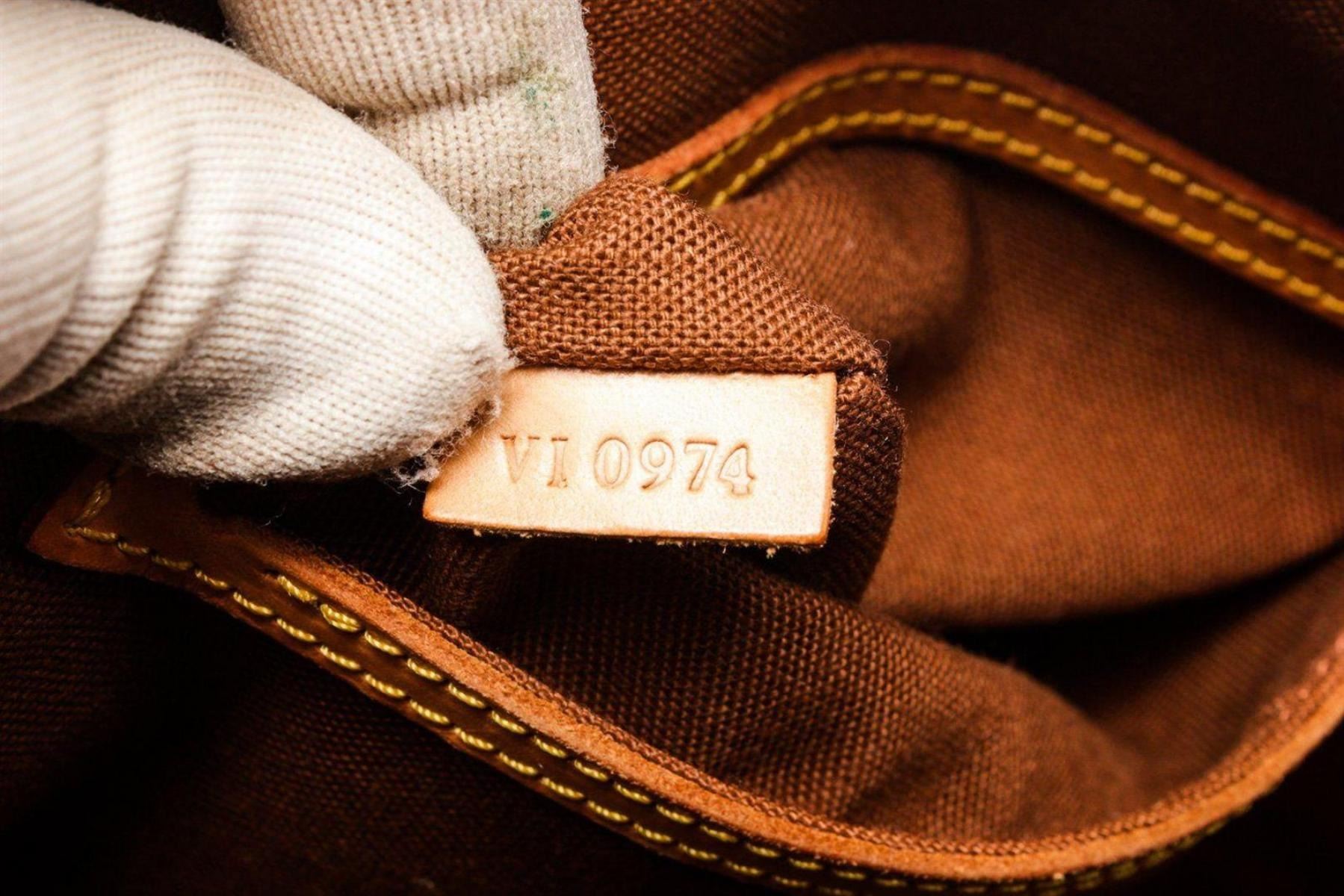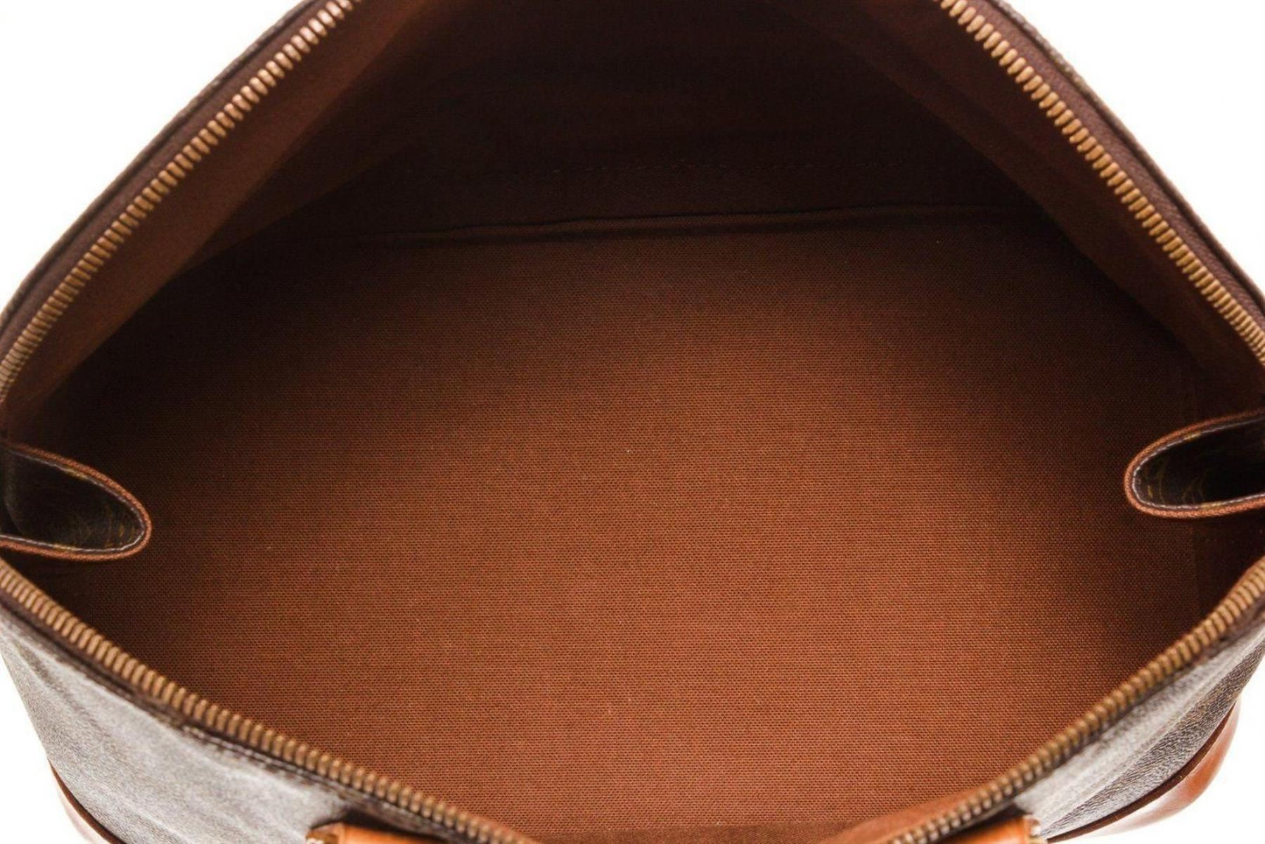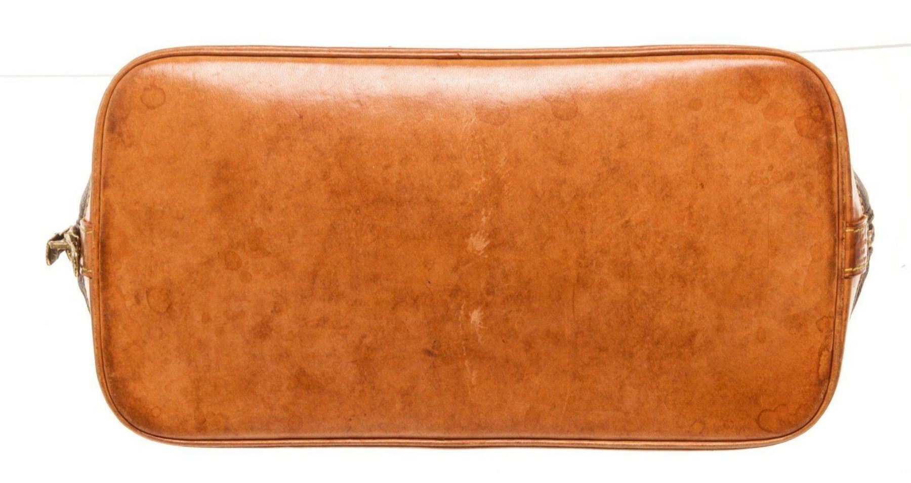 Louis Vuitton Brown Alma MM Satchel Bag with material monogram canvas, gold-tone hardware, trim tan vachetta leather, interior slip pockets, dual top handle and zipper closure.