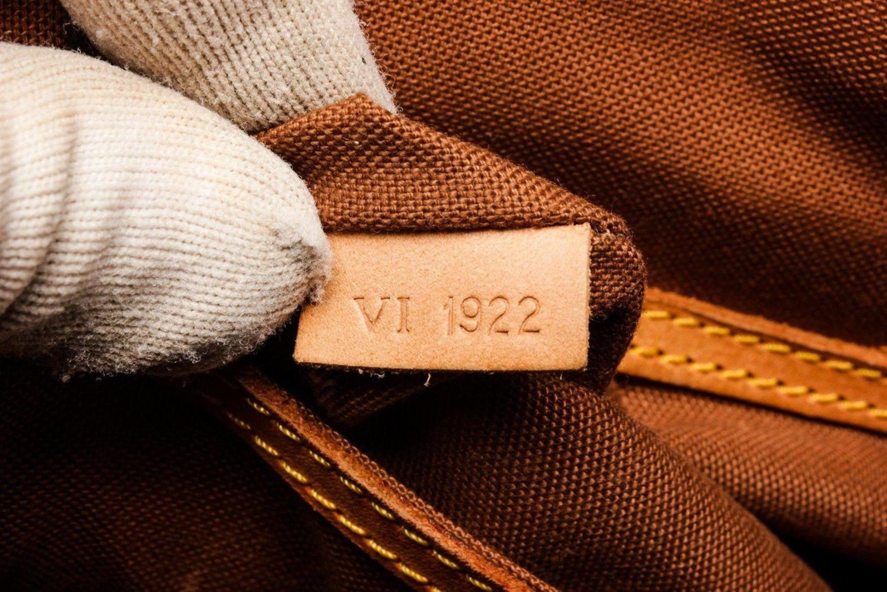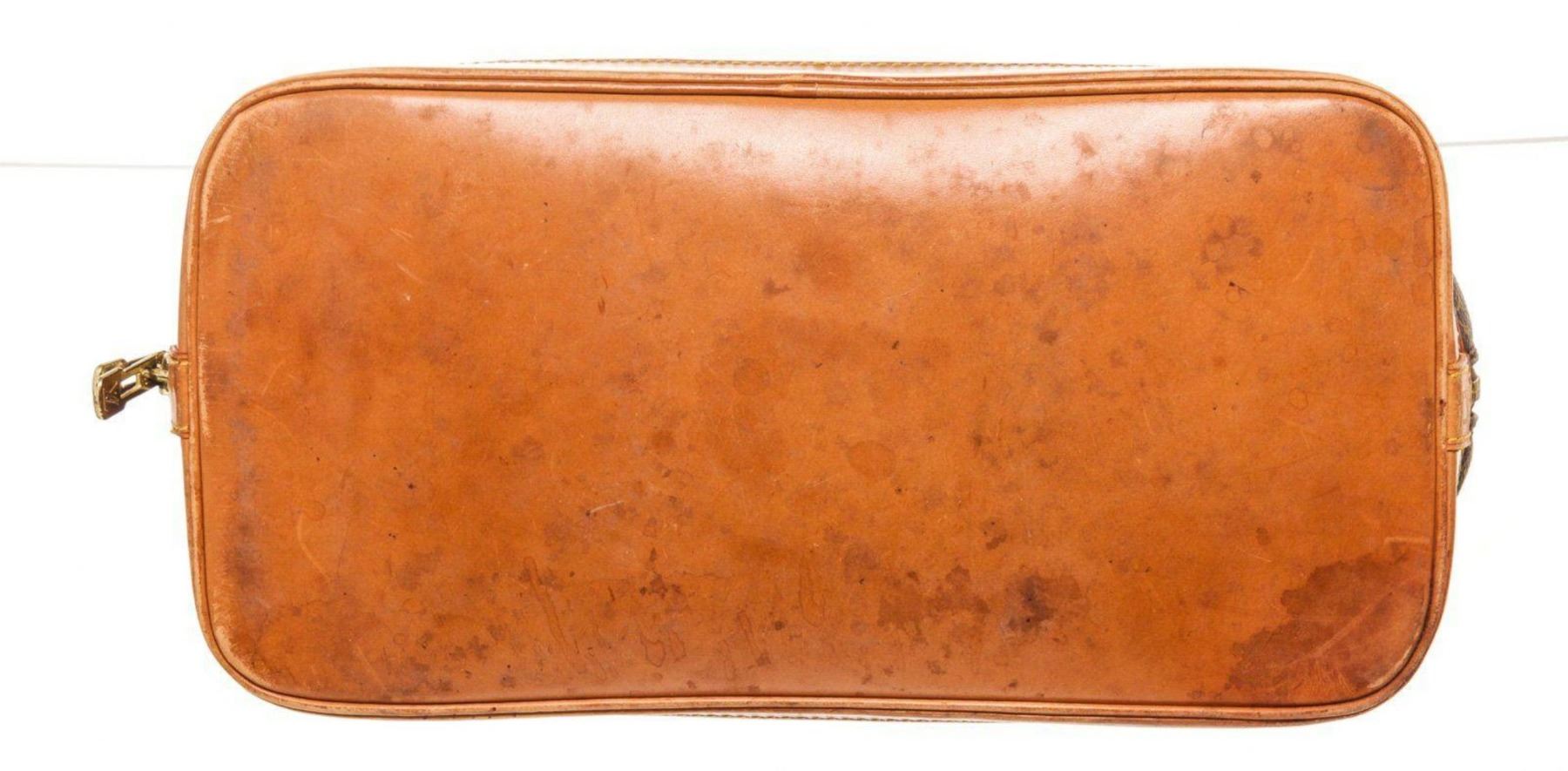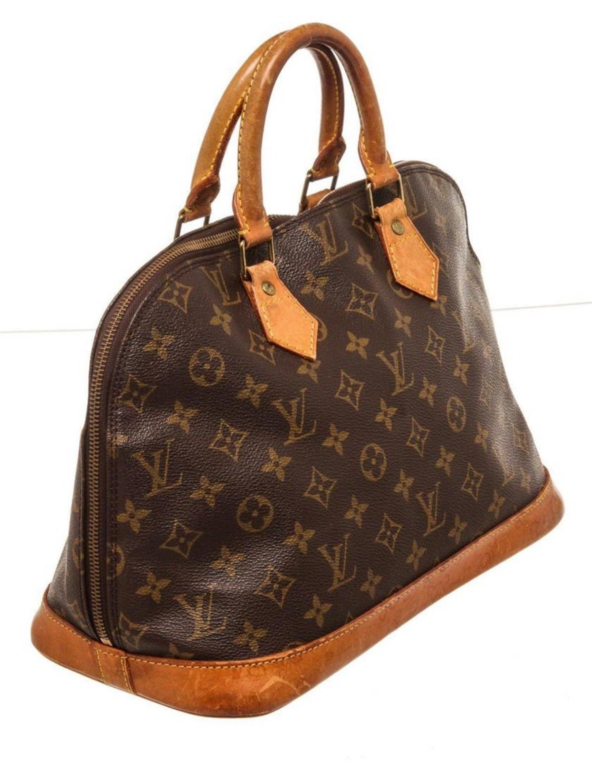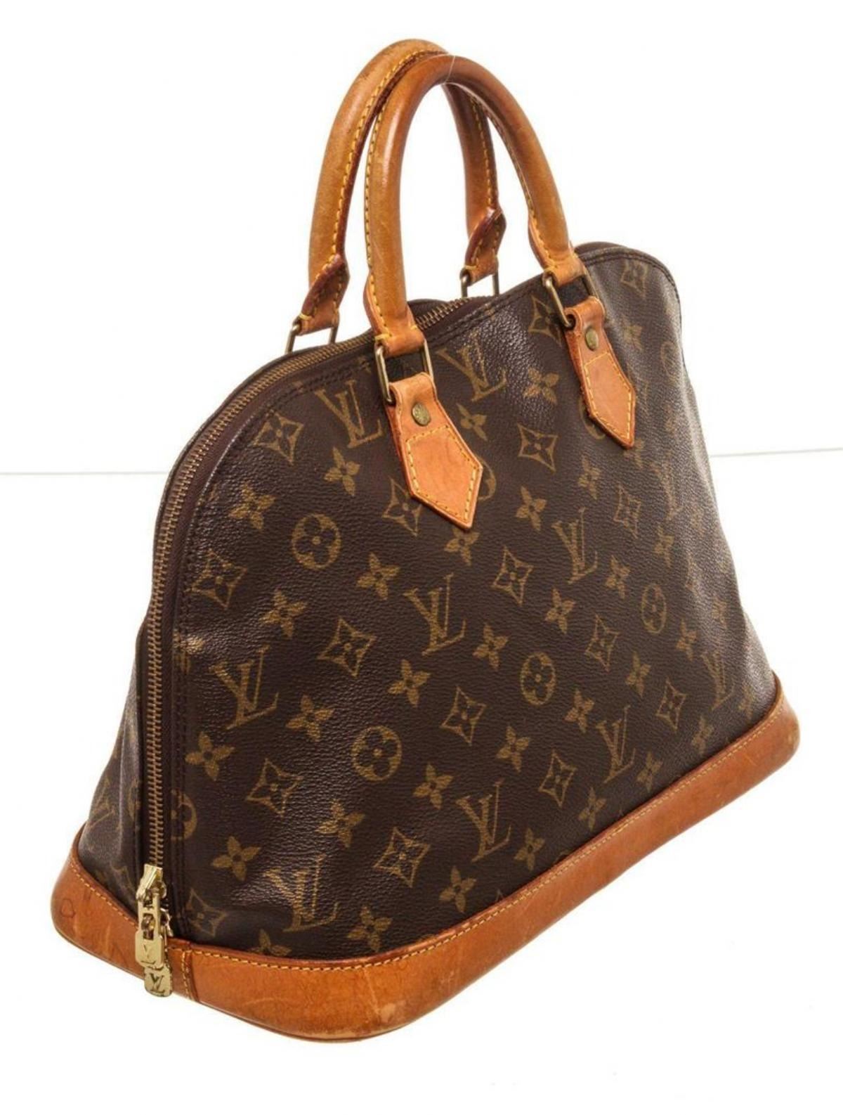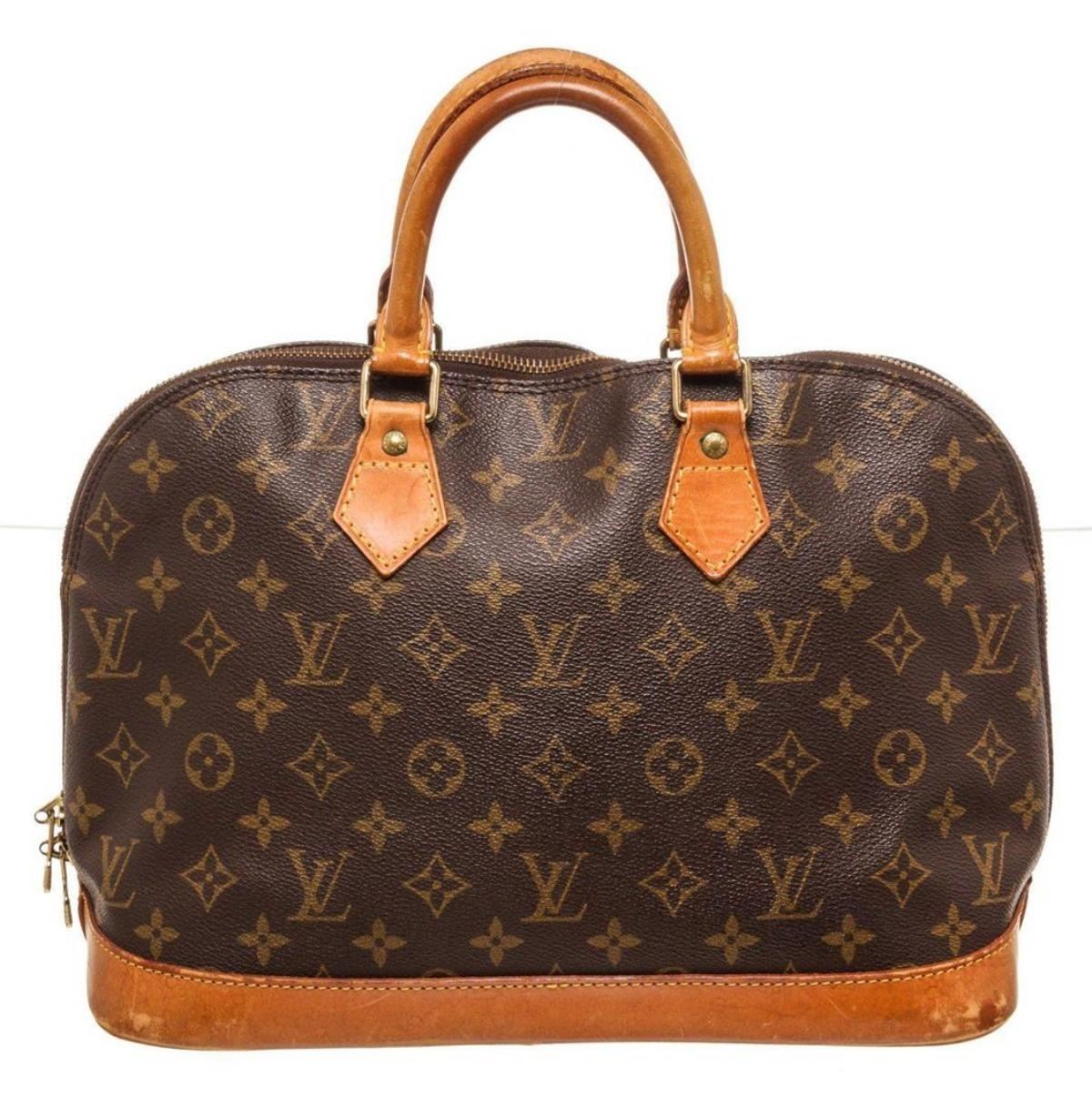 Louis Vuitton Brown Alma MM Satchel Bag with material monogram canvas, gold-tone hardware, trim tan vachetta leather, interior slip pockets, dual top handle and zipper closure.