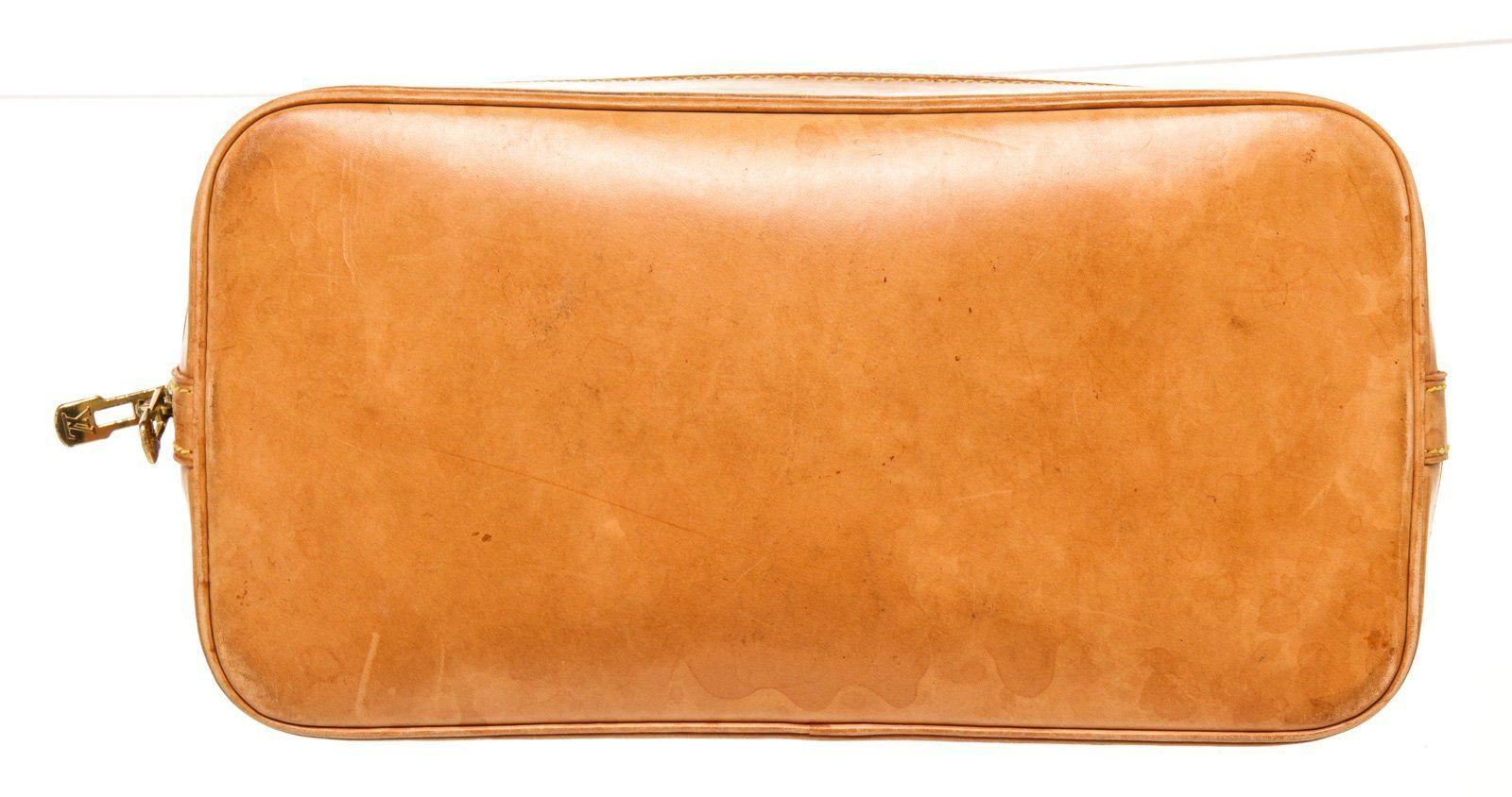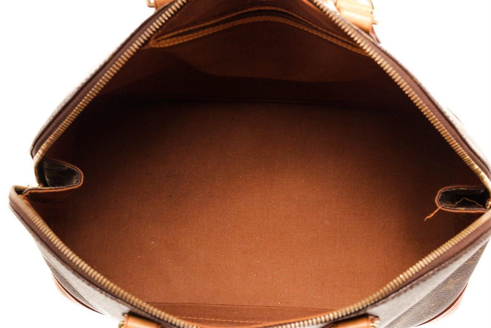 Louis Vuitton Brown Alma MM Satchel Bag with material monogram canvas, gold-tone hardware, trim tan vachetta leather, interior slip pockets, dual top handle and zipper closure.