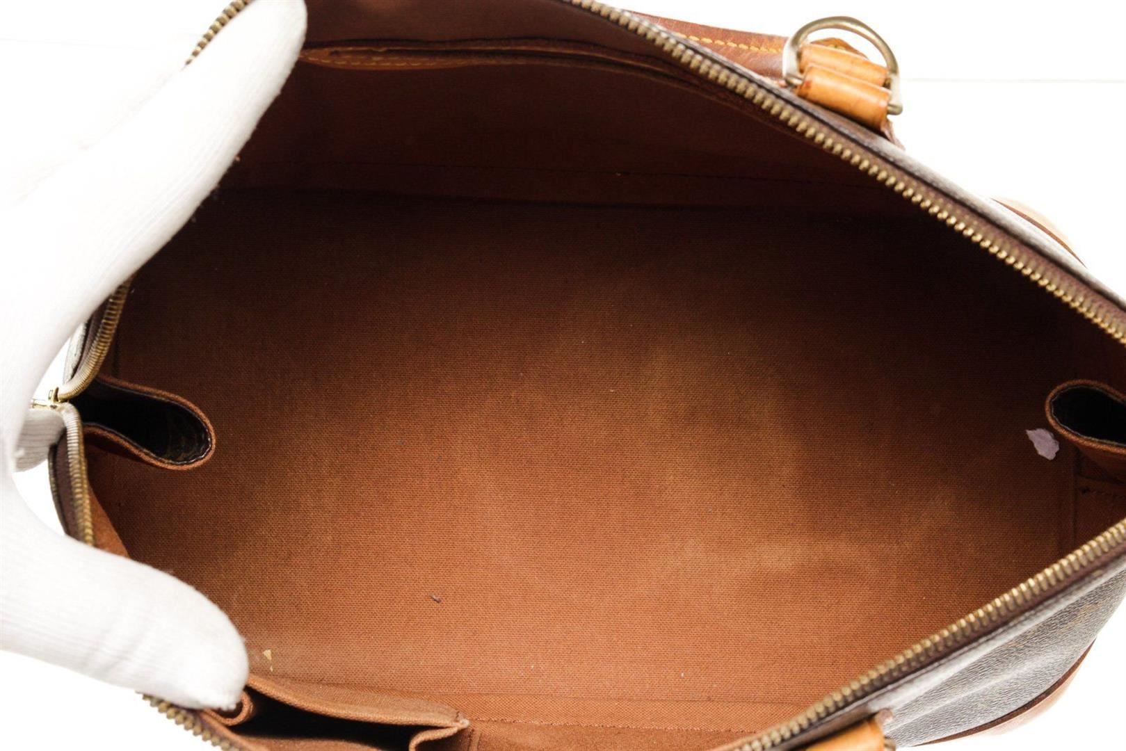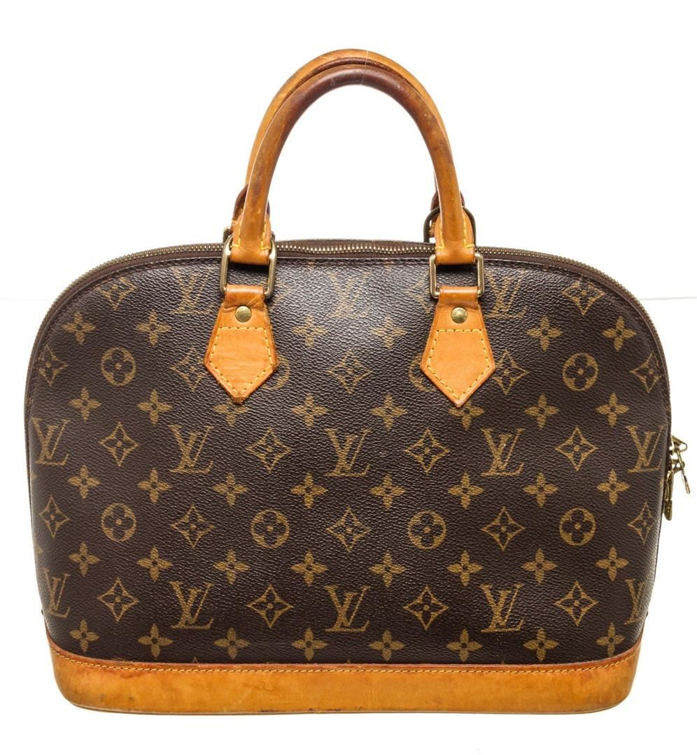 Louis Vuitton Brown Alma PM Satchel with monogram canvas, gold-tone hardware, trim tan vachetta leather, interior slip pockets, dual top handle and zipper closure.