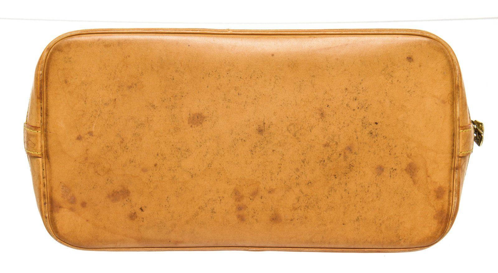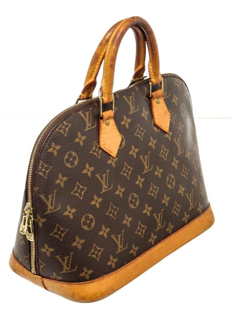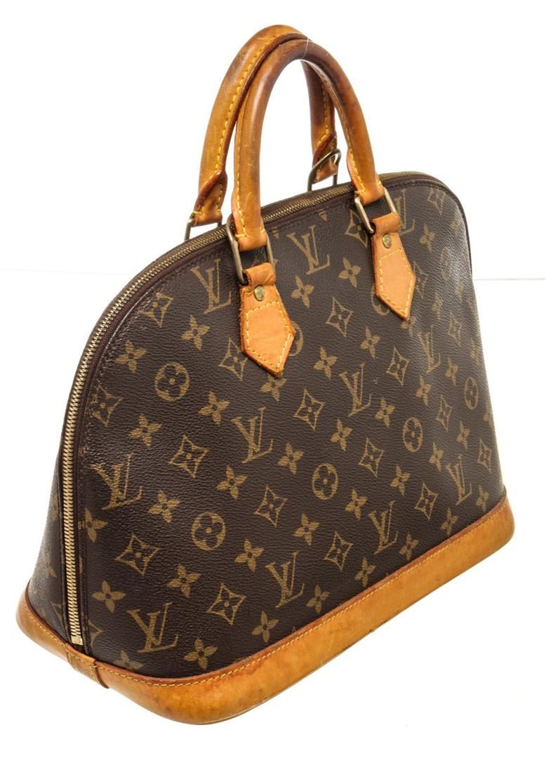 Louis Vuitton Brown Alma PM Satchel with monogram canvas, gold-tone hardware, trim tan vachetta leather, interior slip pockets, dual top handle and zipper closure.