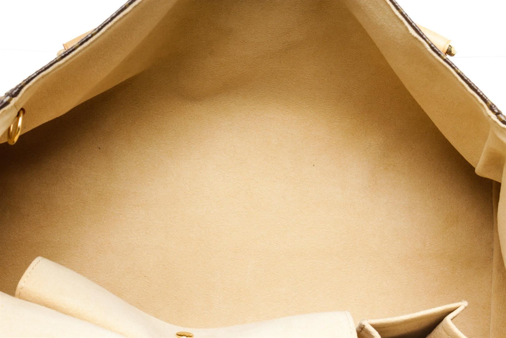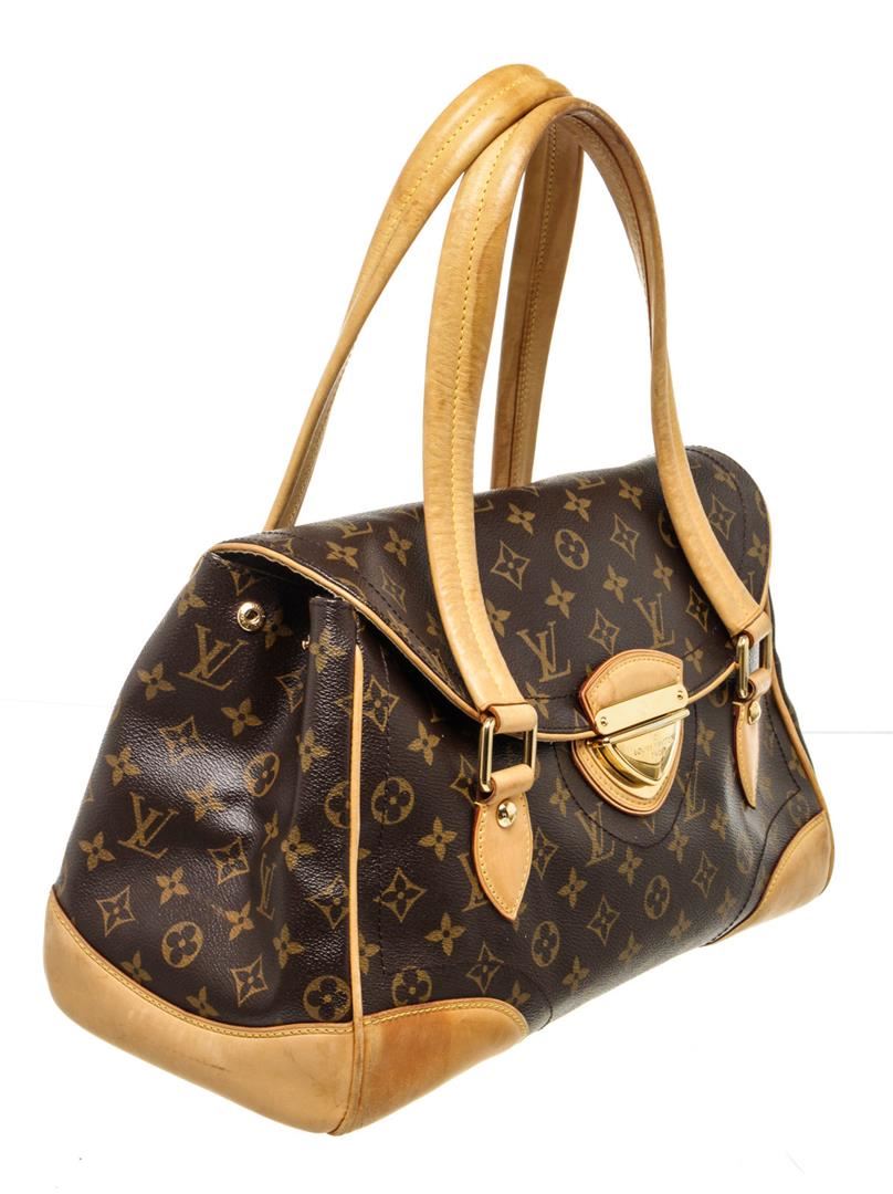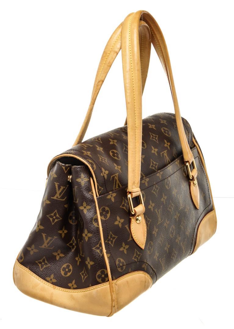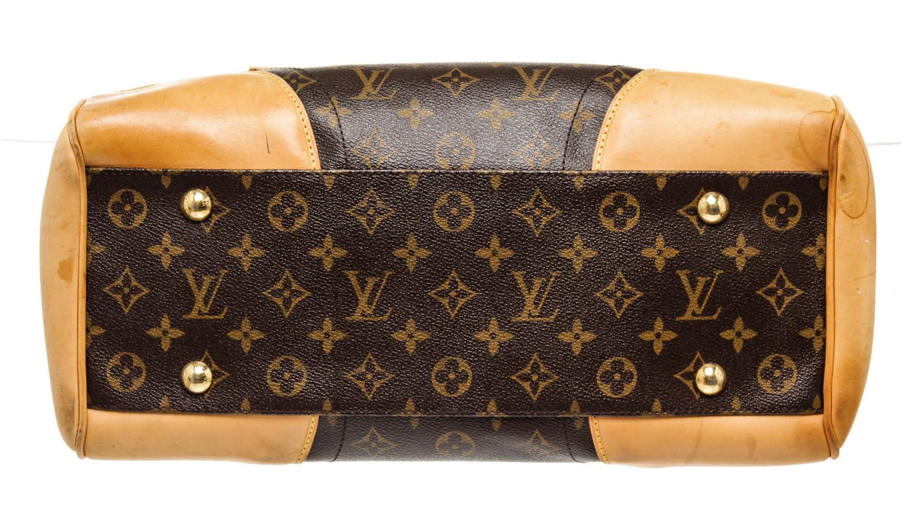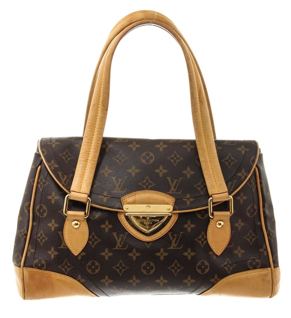 Louis Vuitton Brown Monogram Beverly GM Shoulder Bag with monogram canvas, gold-tone hardware, tan vachetta leather trim, top handle, leather shoulder strap, and zipper closure.