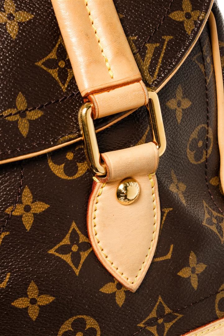 One Louis Vuitton Brown Beverly GM Shoulder Bag. Item is sold AS-IS. All available information is listed in the description and shown in the photo. Louis Vuitton Brown Monogram Beverly GM Shoulder Bag with material monogram canvas, gold-tone hardware, tan vachetta leather trim, top handle, leather shoulder strap, and zipper closure.