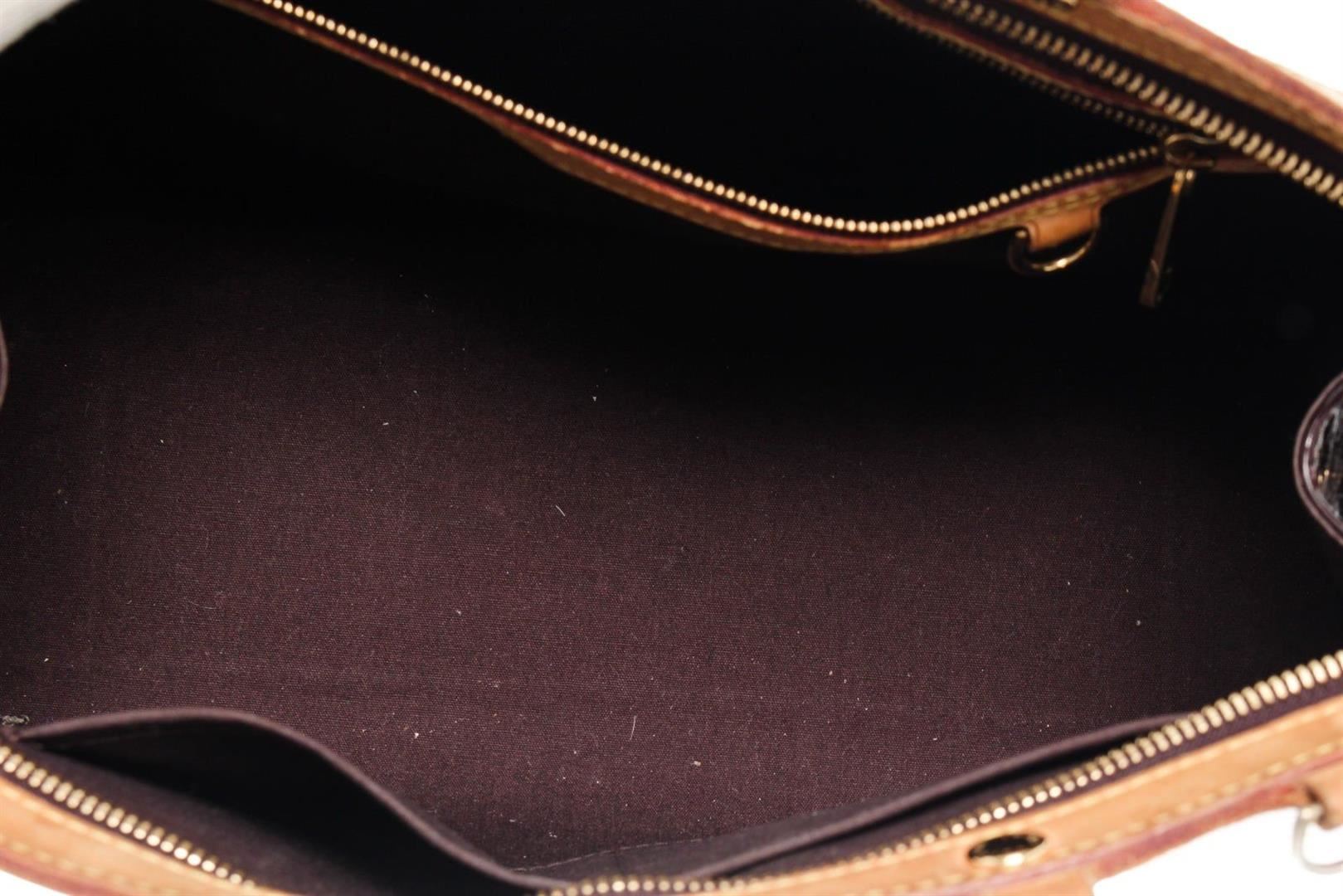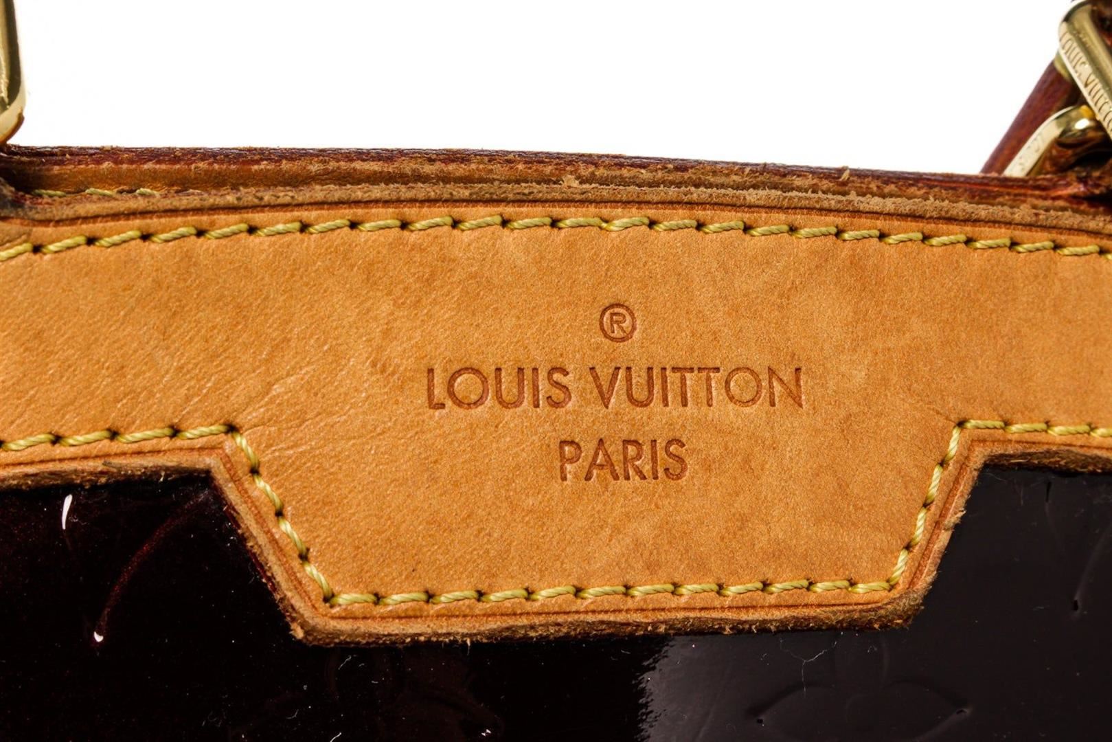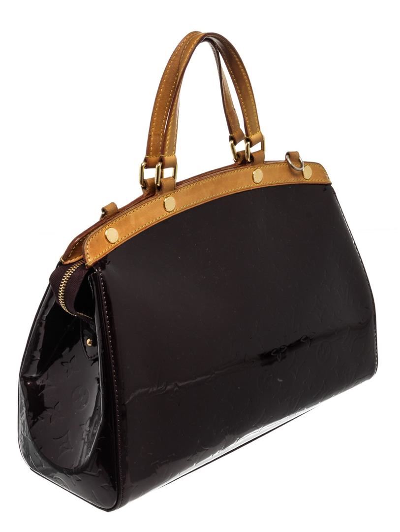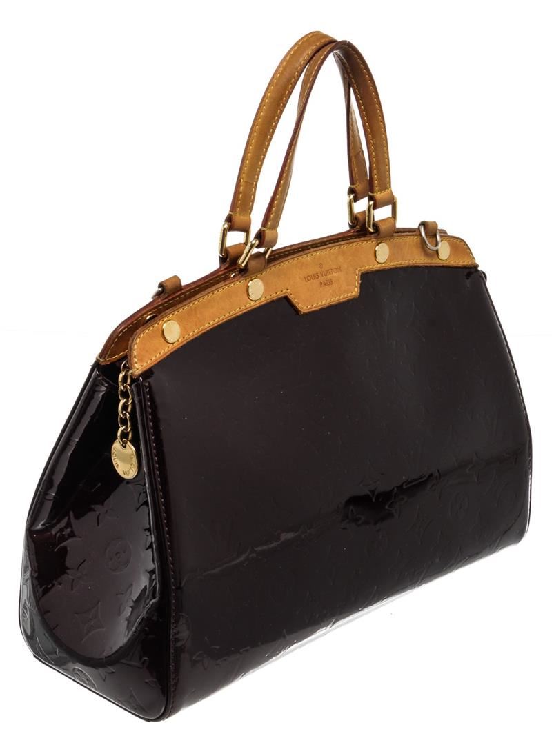 Louis Vuitton Brown Brea MM Shoulder Bag with vernis leather, gold-tone hardware, trim tan vachetta leather, interior three compartments pocket, dual top handle, and zipper closure.
