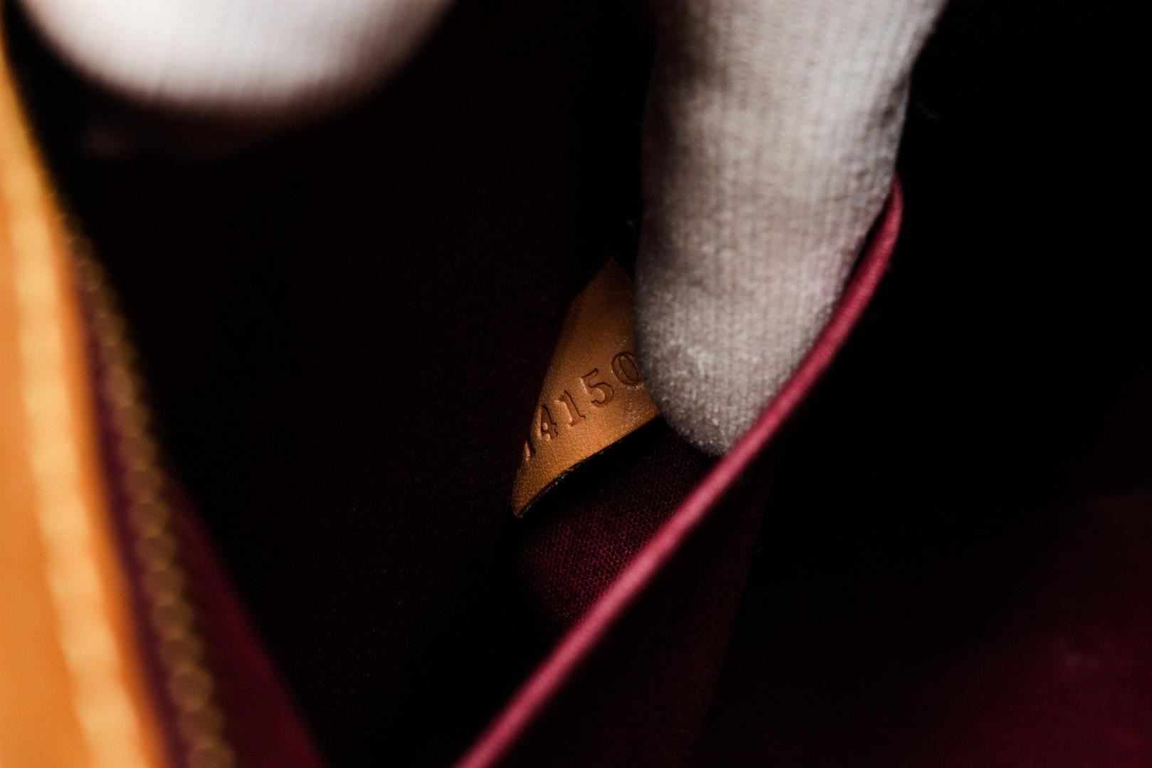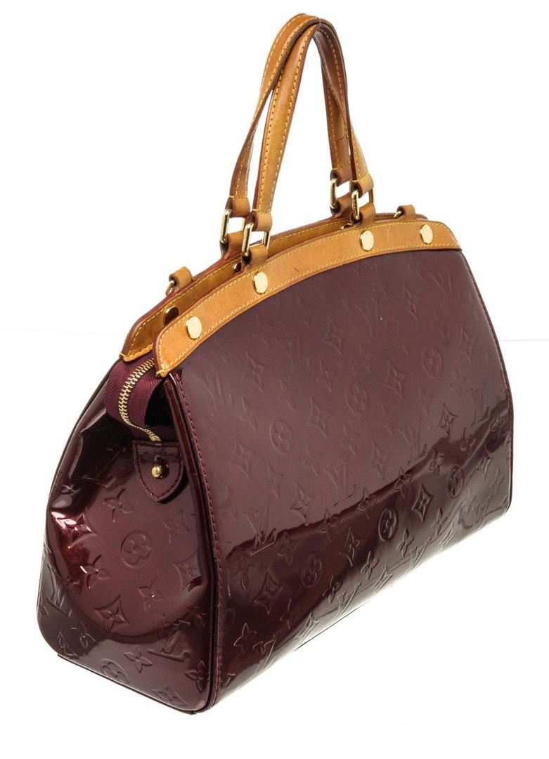 Louis Vuitton Brown Brea MM Shoulder Bag with vernis leather, gold-tone hardware, trim tan vachetta leather, interior three compartments pocket, dual top handle, and zip closure.