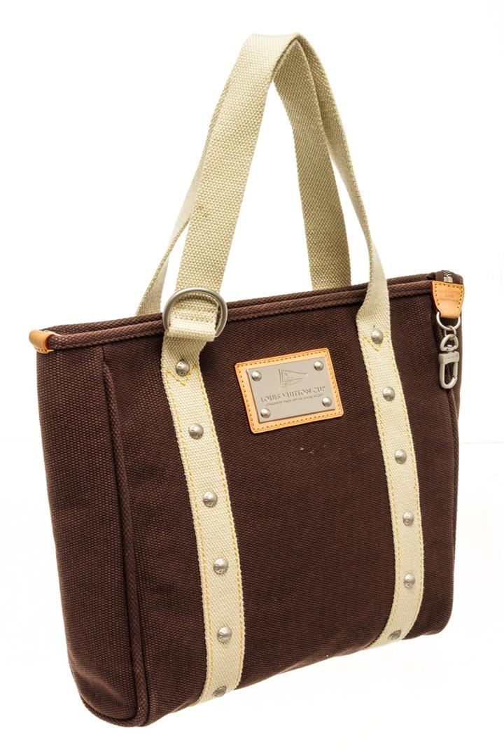 One Louis Vuitton Brown Canvas Antiqua Cabas GM Bag. Item is sold AS-IS. All available information is listed in the description and shown in the photo. Louis Vuitton brown canvas Antiqua Cabas GM bag features a canvas body, black striped fabric interior, flat shoulder straps, silver-tone hardware, a top zip closure, and an interior slip pocket. Height: 14" Width: 15.7" Depth: 2.8", Shoulder Drop: / 35.56 x 39.87 x 7.11 Cm