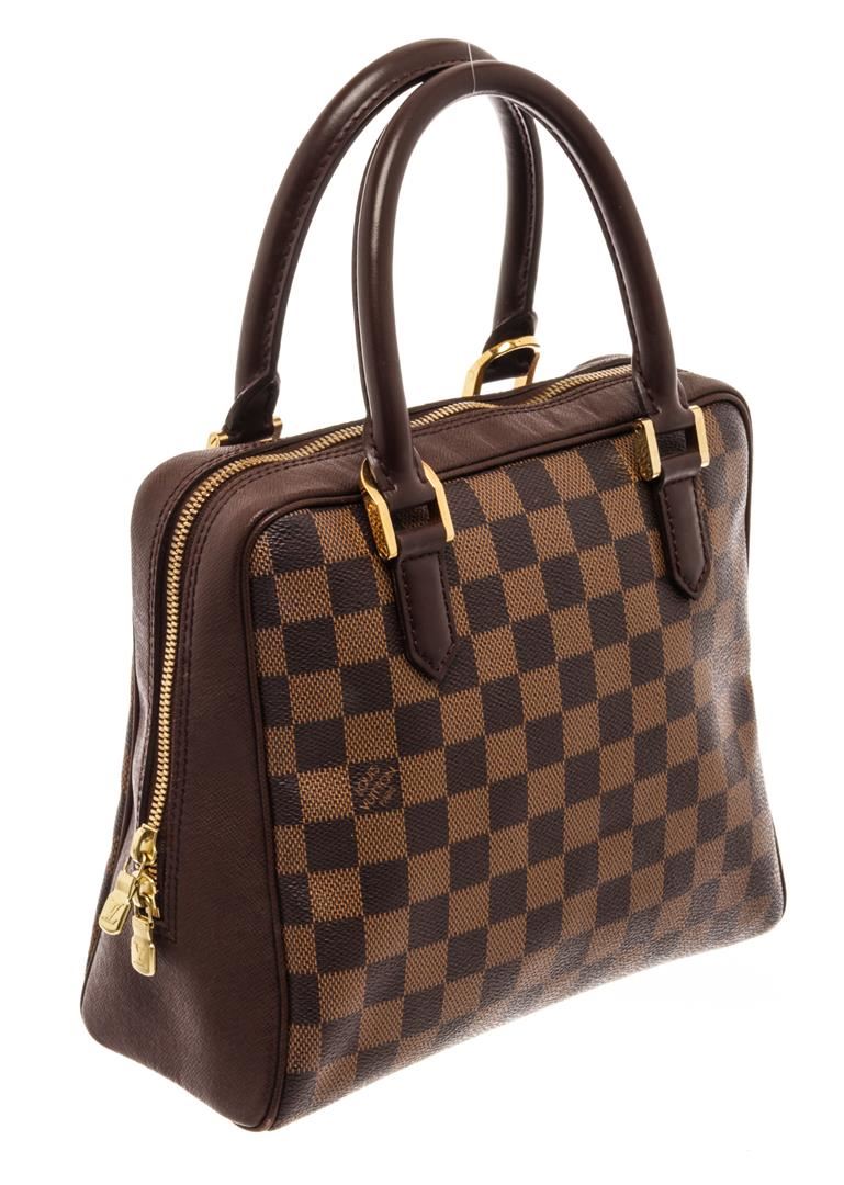 Louis Vuitton Brown Canvas Damier Ebene Brera Tote Bag. All available information is listed in the description and shown in the photos. Louis Vuitton Brown Canvas Damier Ebene Brera Tote Bag with brown coated canvas, damier ebene pattern, brass hardware, dual rolled handles, alcantara lining & single interior pocket, zipper closure at top. Height: 8.5" Width: 9.5" Depth: 4.25", Handle Drop: 5" / 21.59 x 24.13 x 10.79 Cm