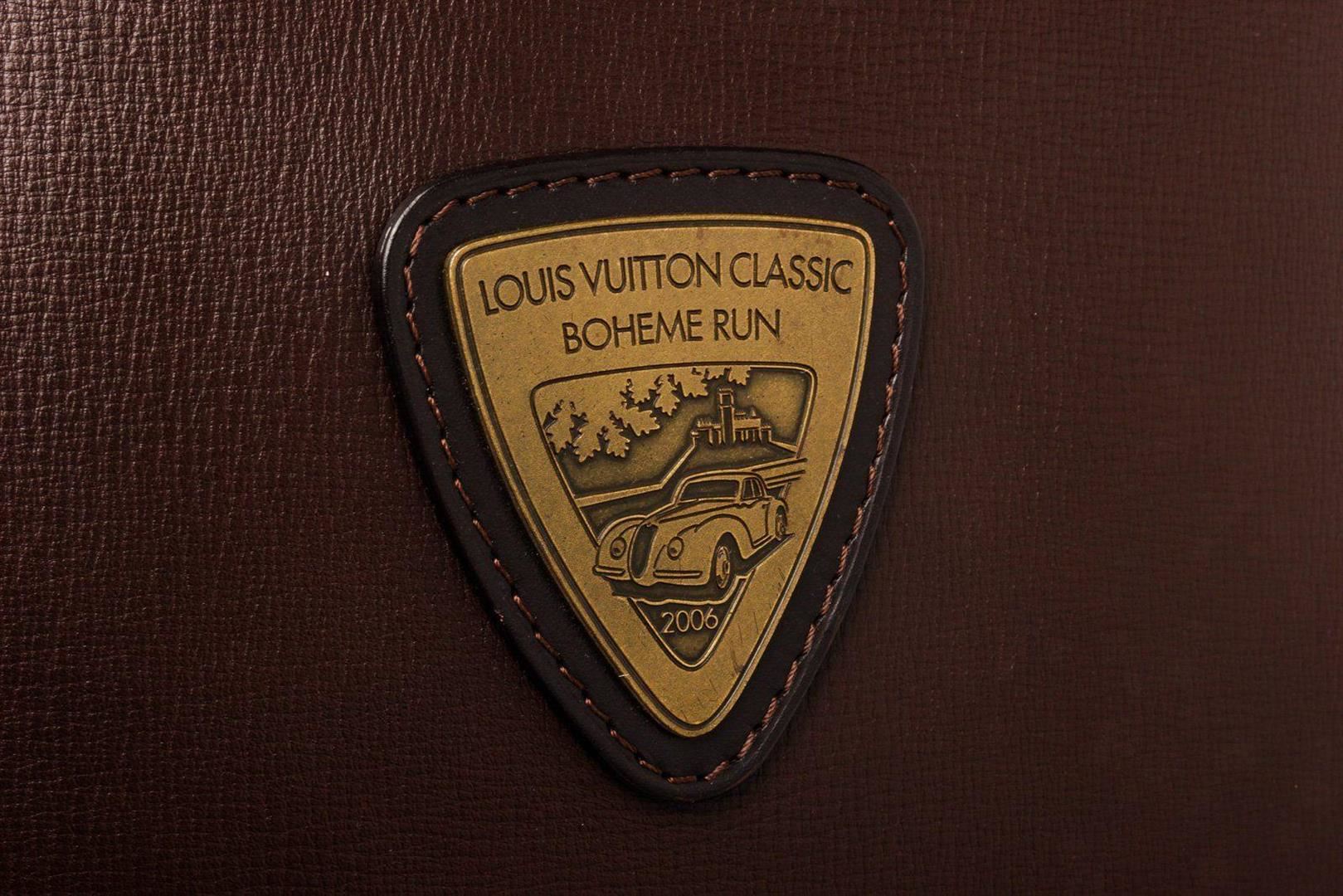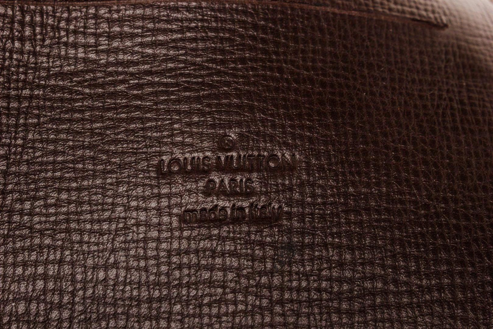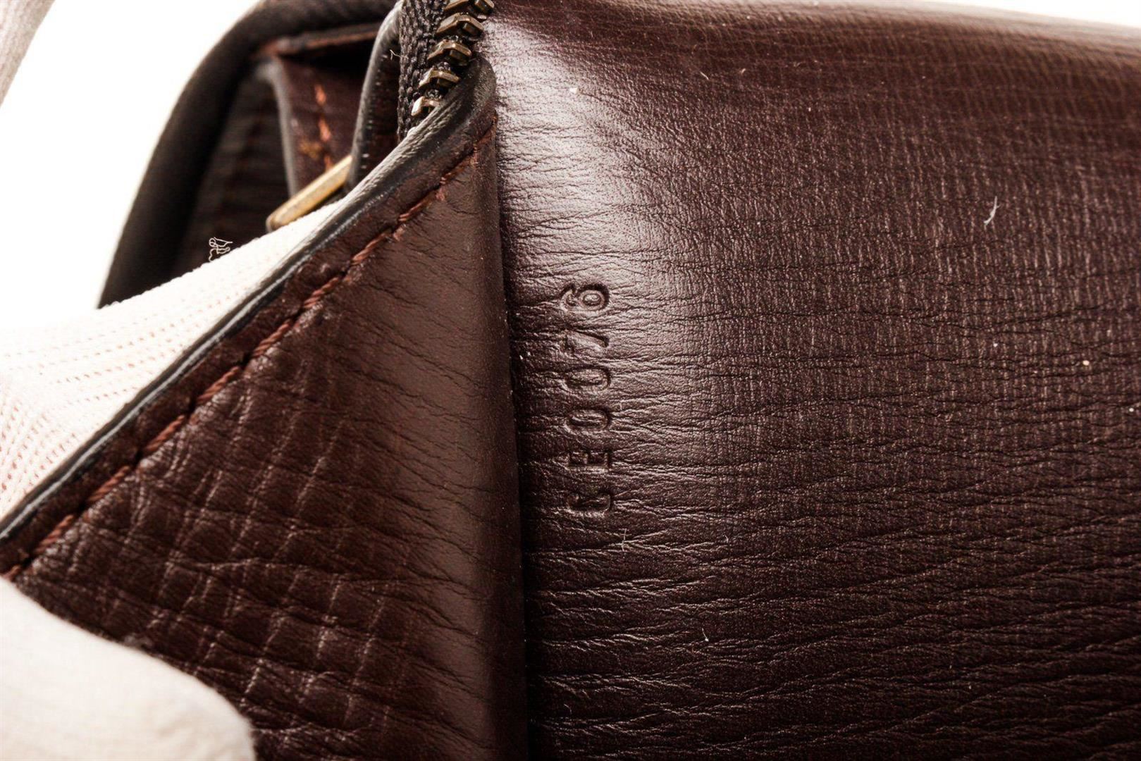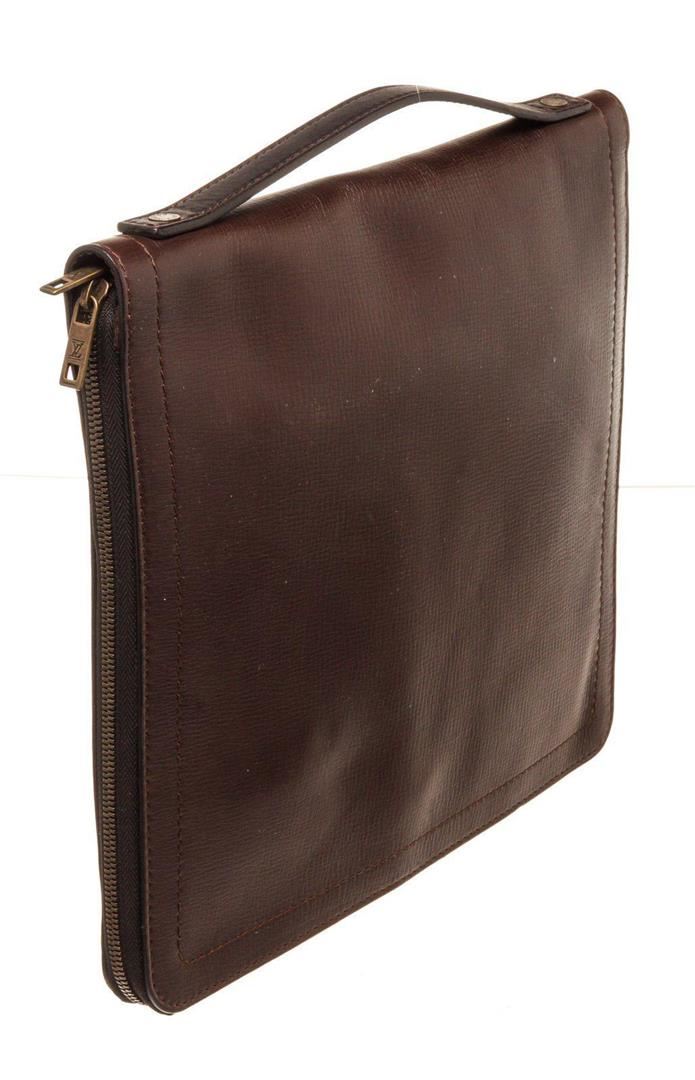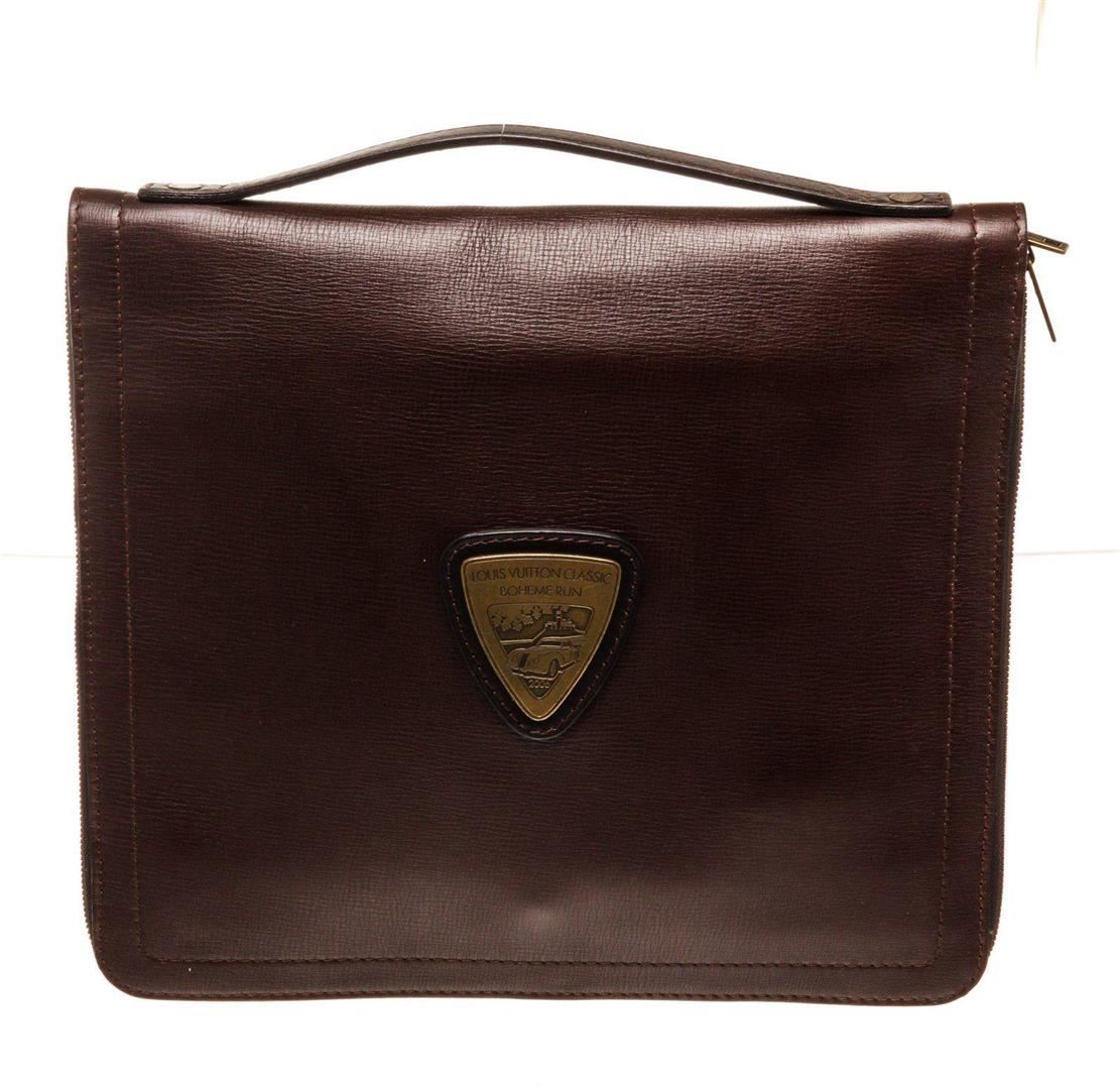 Brown Loewe leather document holder portfolio bag with material canvas leather, gold-tone hardware, tan suede interior lining, two slip pockets at interior wall and overall flap with key lock closure.