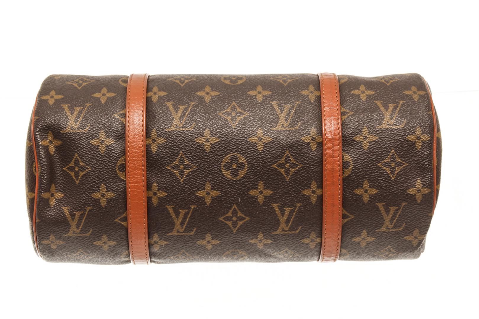 One Louis Vuitton Brown Canvas Papillon 30 Shoulder Bag. Item is sold AS-IS. All available information is listed in the description and shown in the photo. louis vuitton brown canvas papillon 30 shoulder bag with material monogram canvas, gold-tone hardware, brown vintage leather trim, dual top handles, brown leather interior lining, and zipper closure at top.