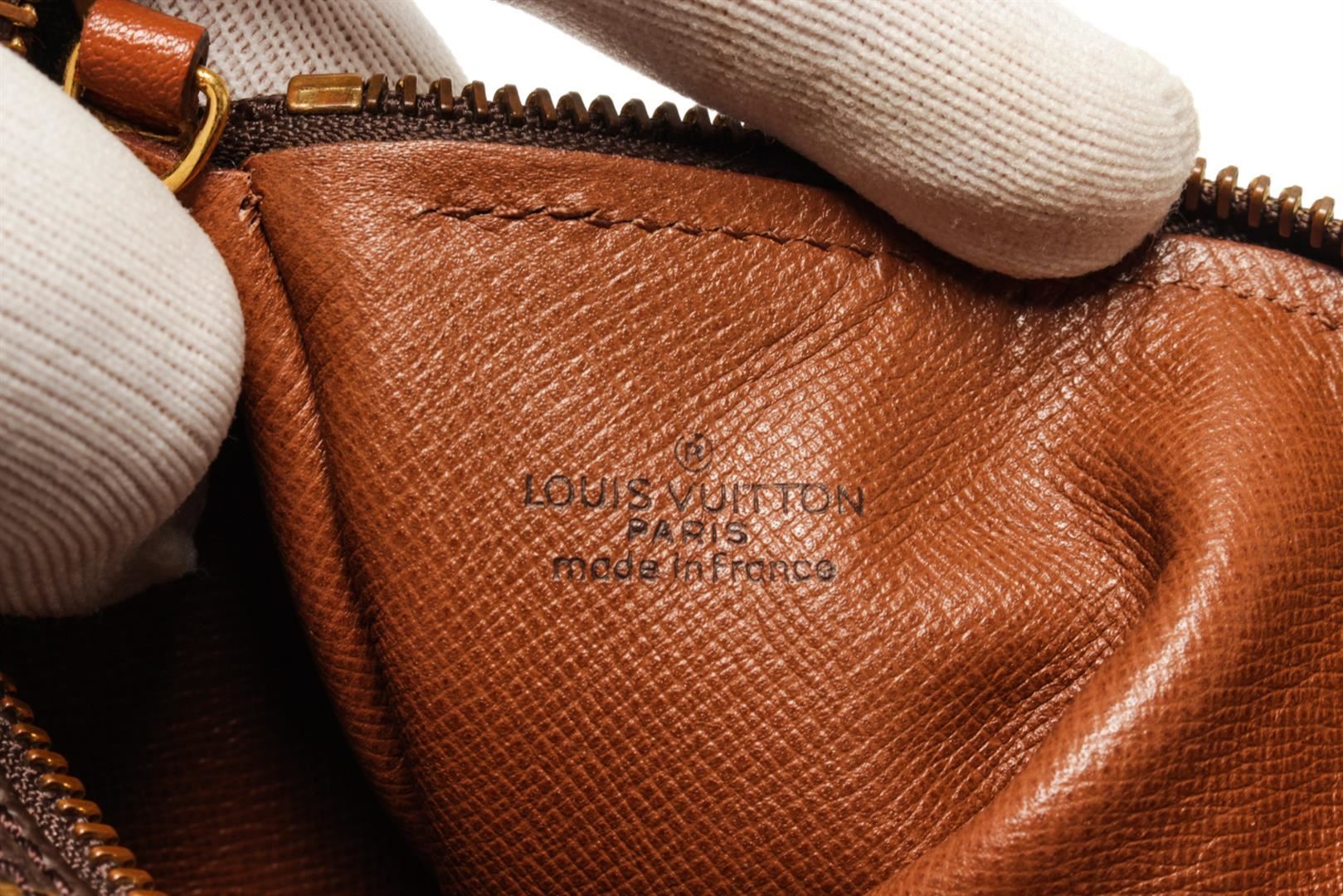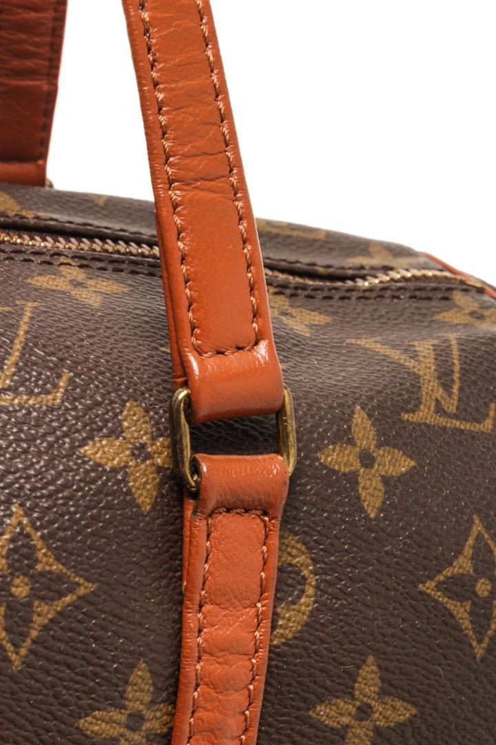 One Louis Vuitton Brown Canvas Papillon 30 Shoulder Bag. Item is sold AS-IS. All available information is listed in the description and shown in the photo. louis vuitton brown canvas papillon 30 shoulder bag with material monogram canvas, gold-tone hardware, brown vintage leather trim, dual top handles, brown leather interior lining, and zipper closure at top.