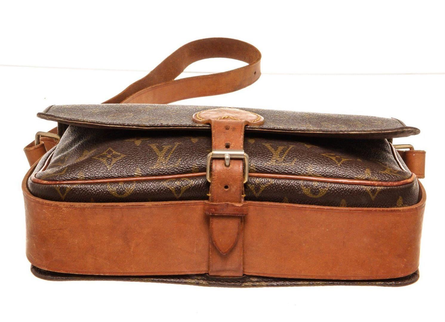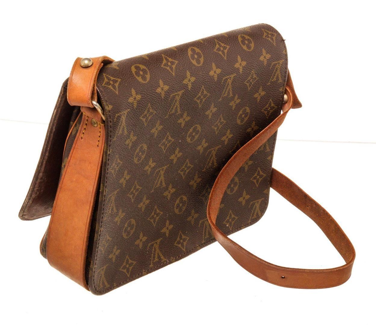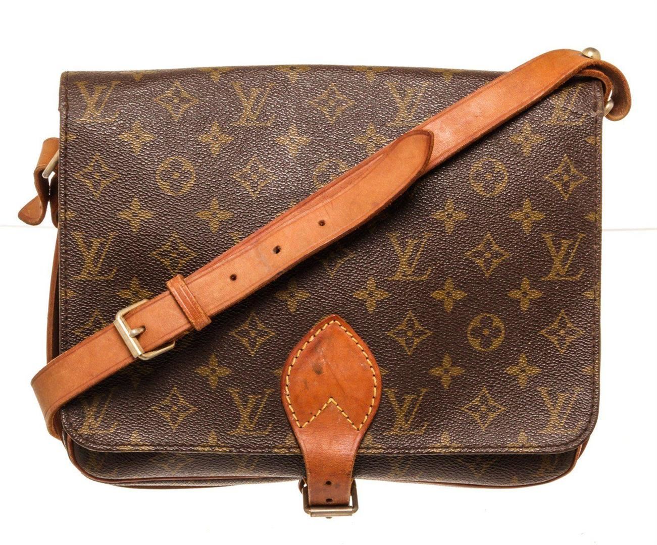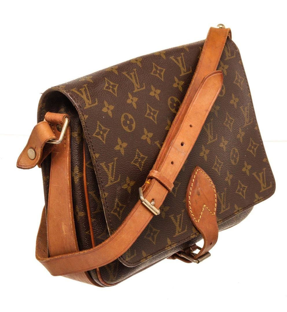 Louis Vuitton Brown Cartouchiere GM Crossbody Bag with monogram canvas, gold-tone hardware, trim tan vachetta leather, interior compartments pocket, shoulder strap and flap closure.
