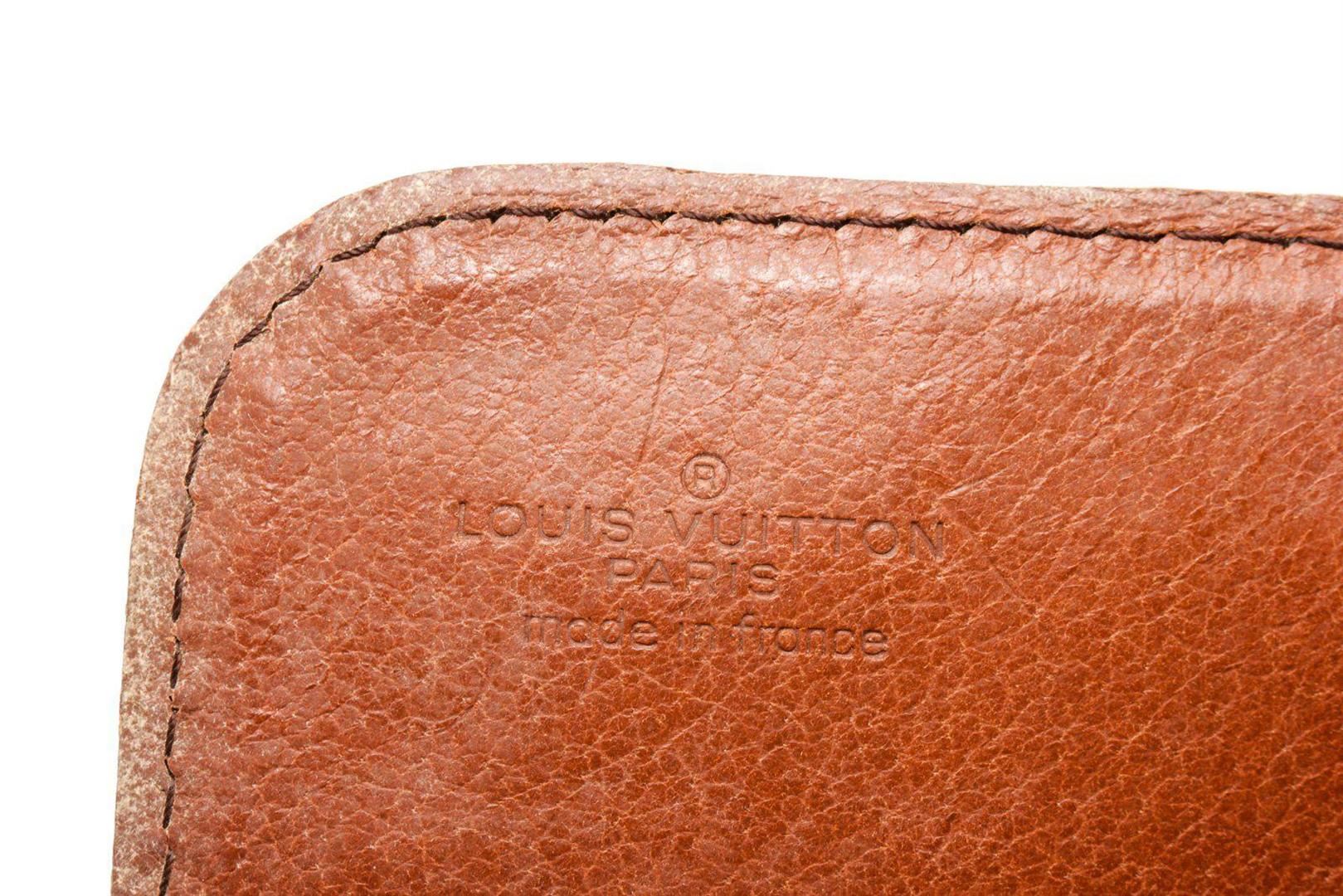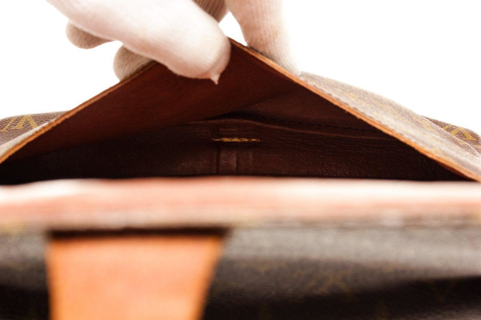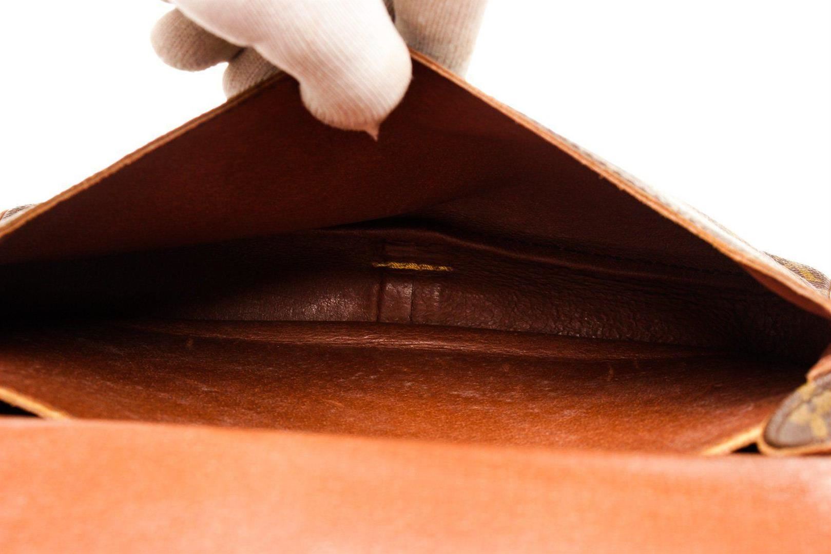 Louis Vuitton Brown Cartouchiere GM Crossbody Bag with monogram canvas, gold-tone hardware, trim tan vachetta leather, interior compartments pocket, shoulder strap and flap closure.