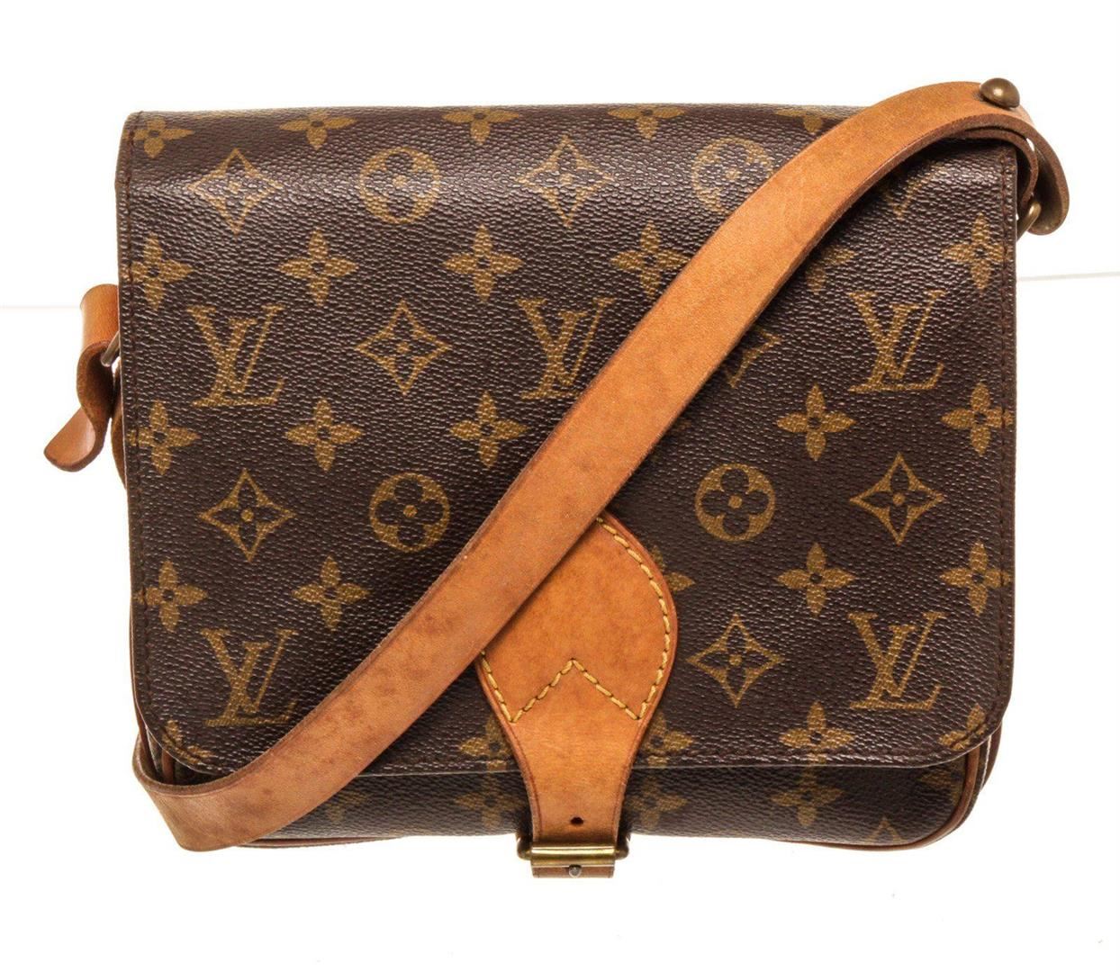 Louis Vuitton Brown Cartouchiere MM Crossbody Bags with monogram canvas, gold-tone hardware, trim tan vachetta leather, interior compartments pocket, shoulder strap and flap closure.