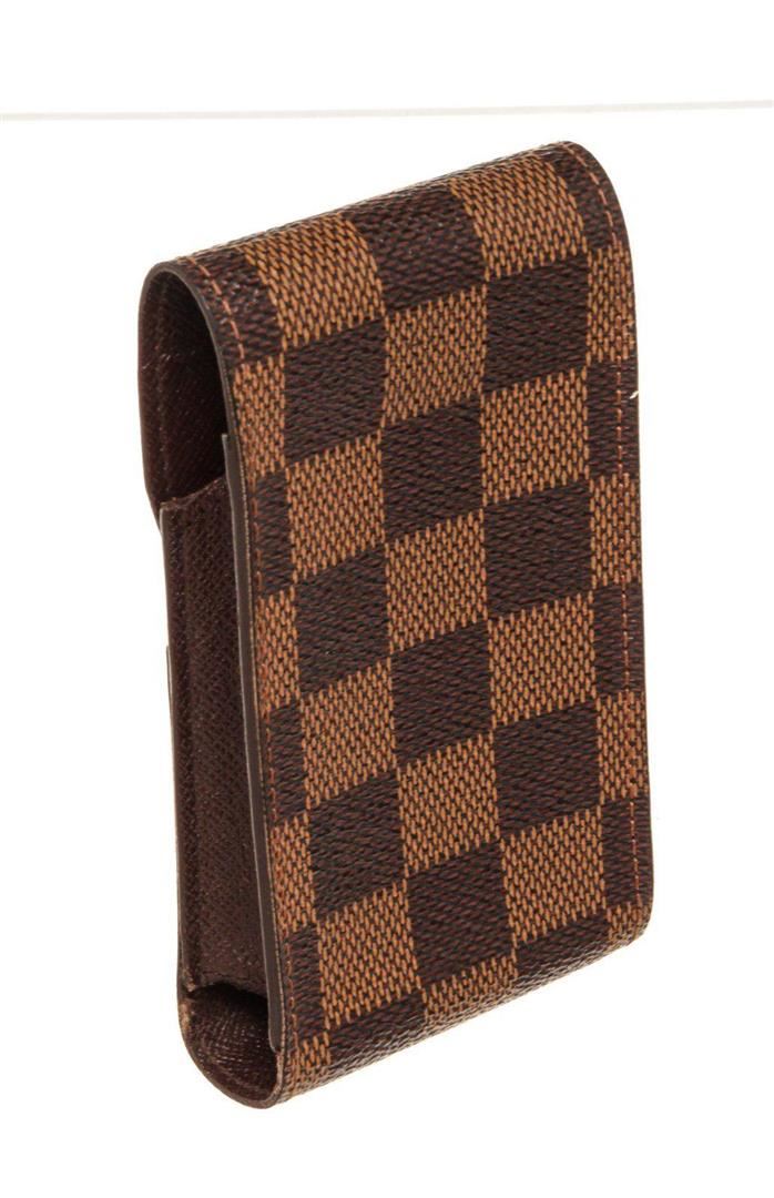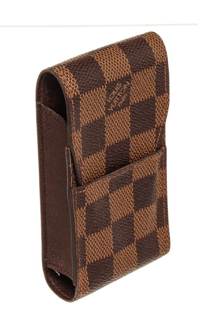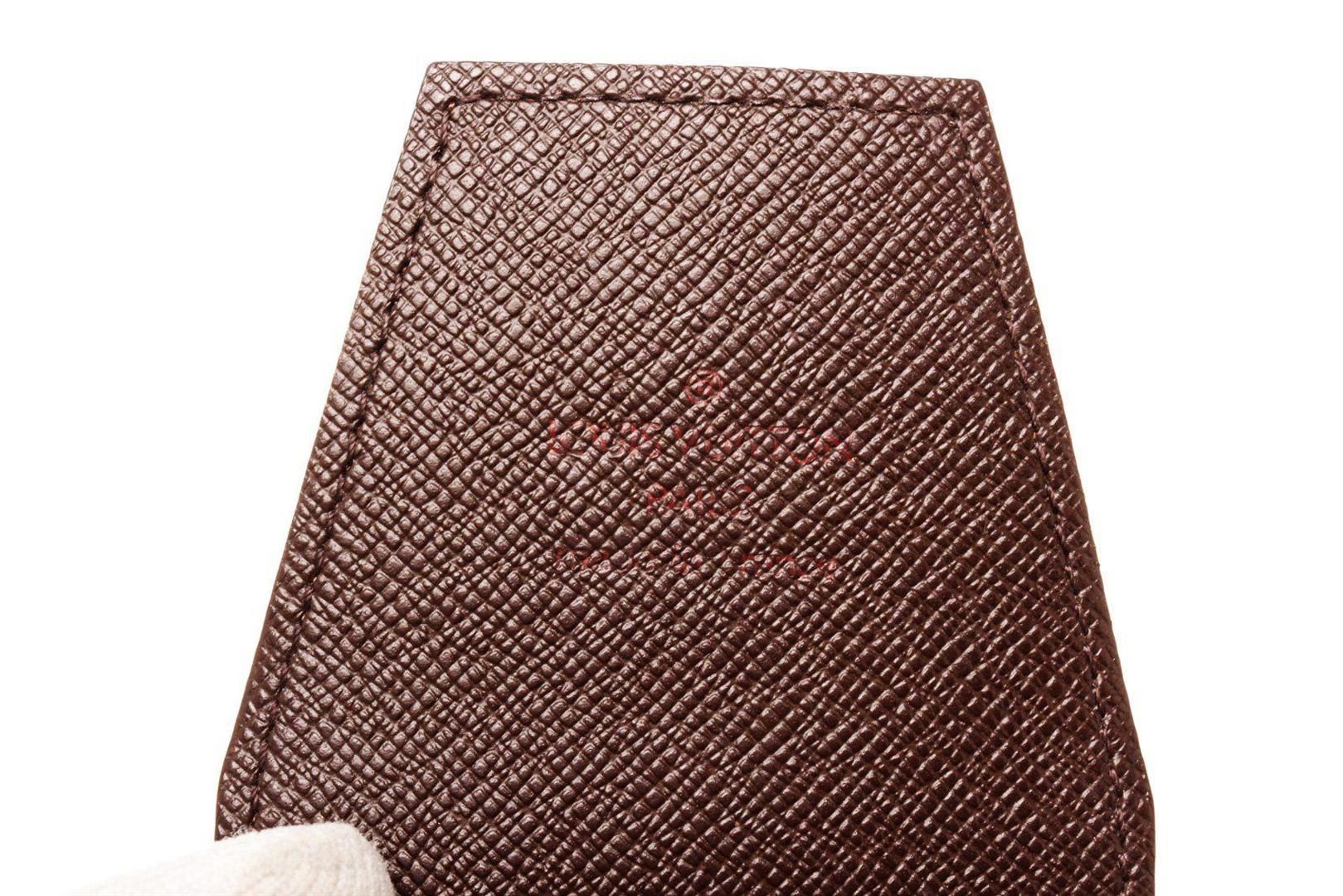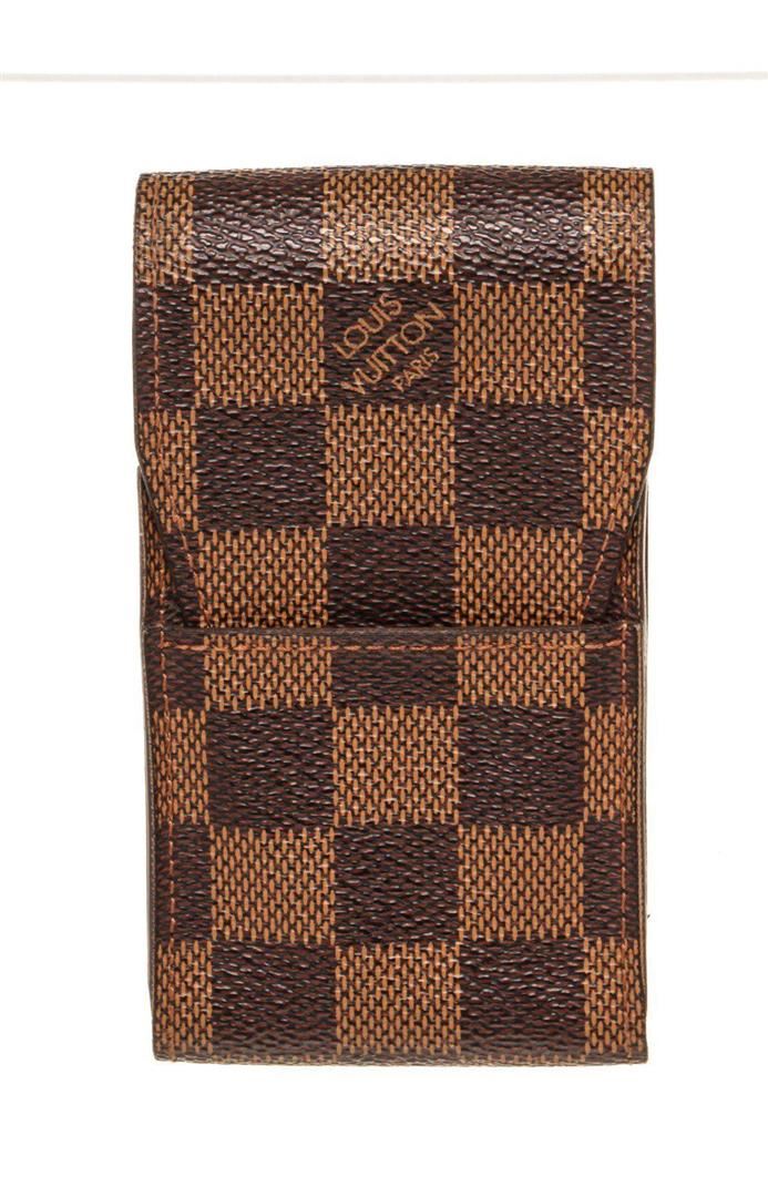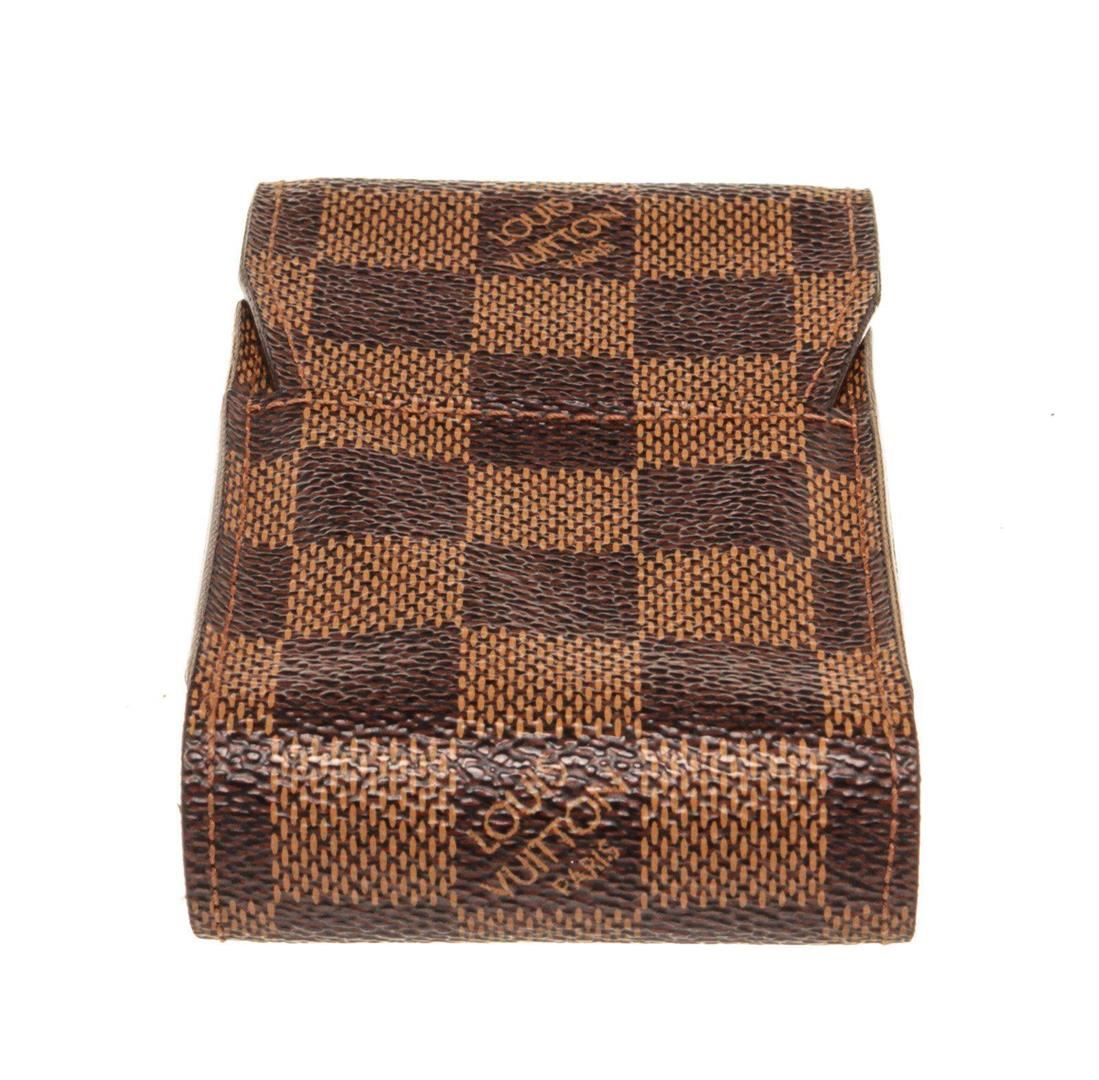 Louis Vuitton Brown Damier Canvas Cigarette Case Wallet with brown leather trim, exterior flap pockets, interior flap pockets, and flap closure.