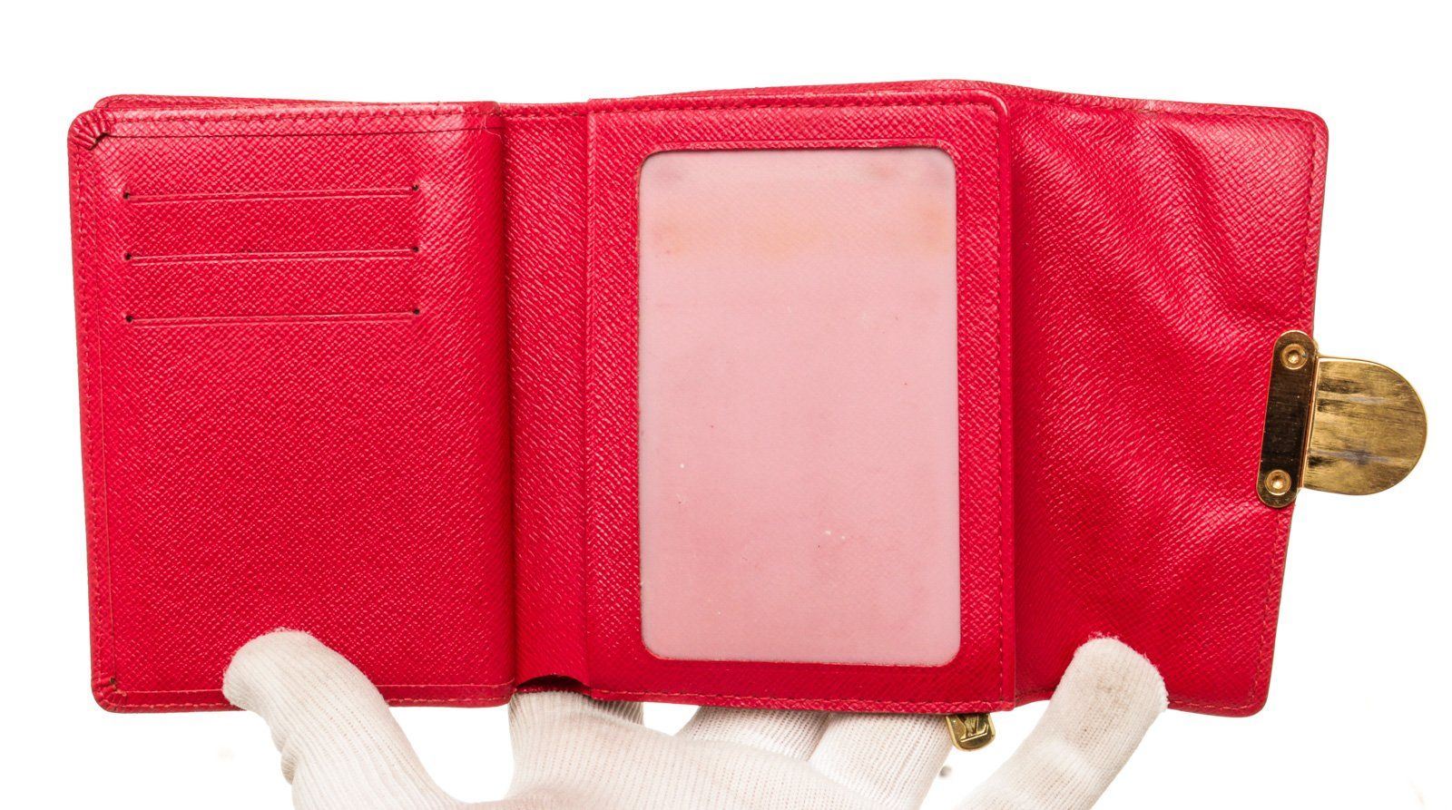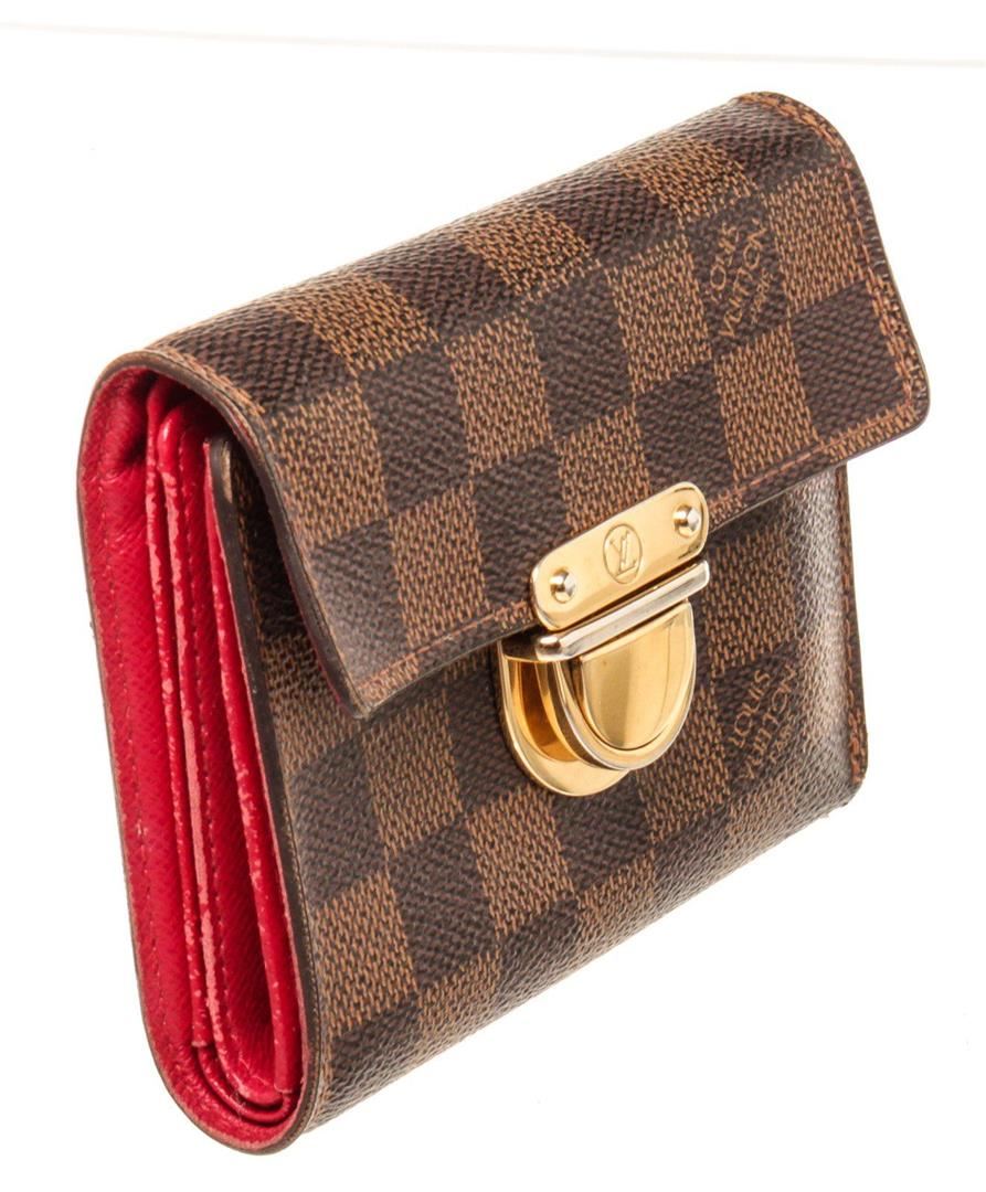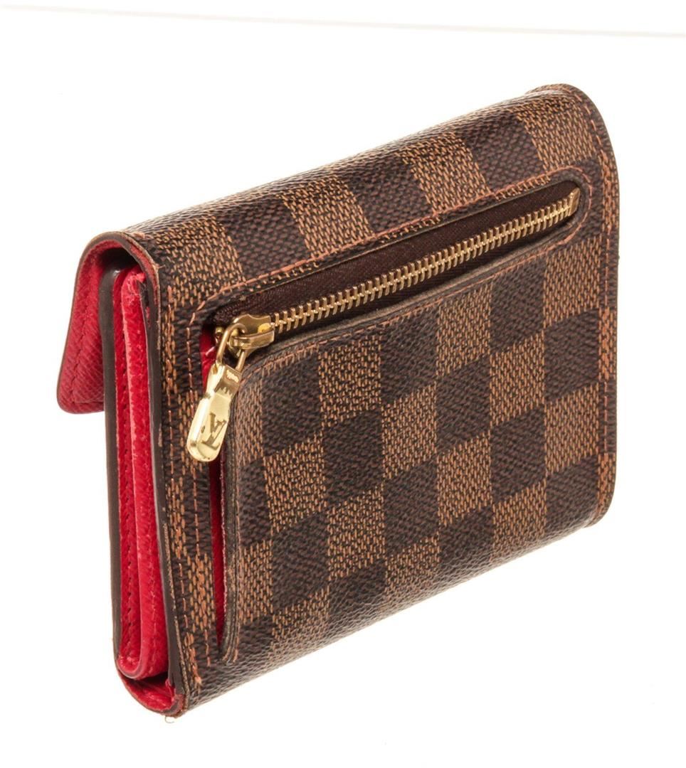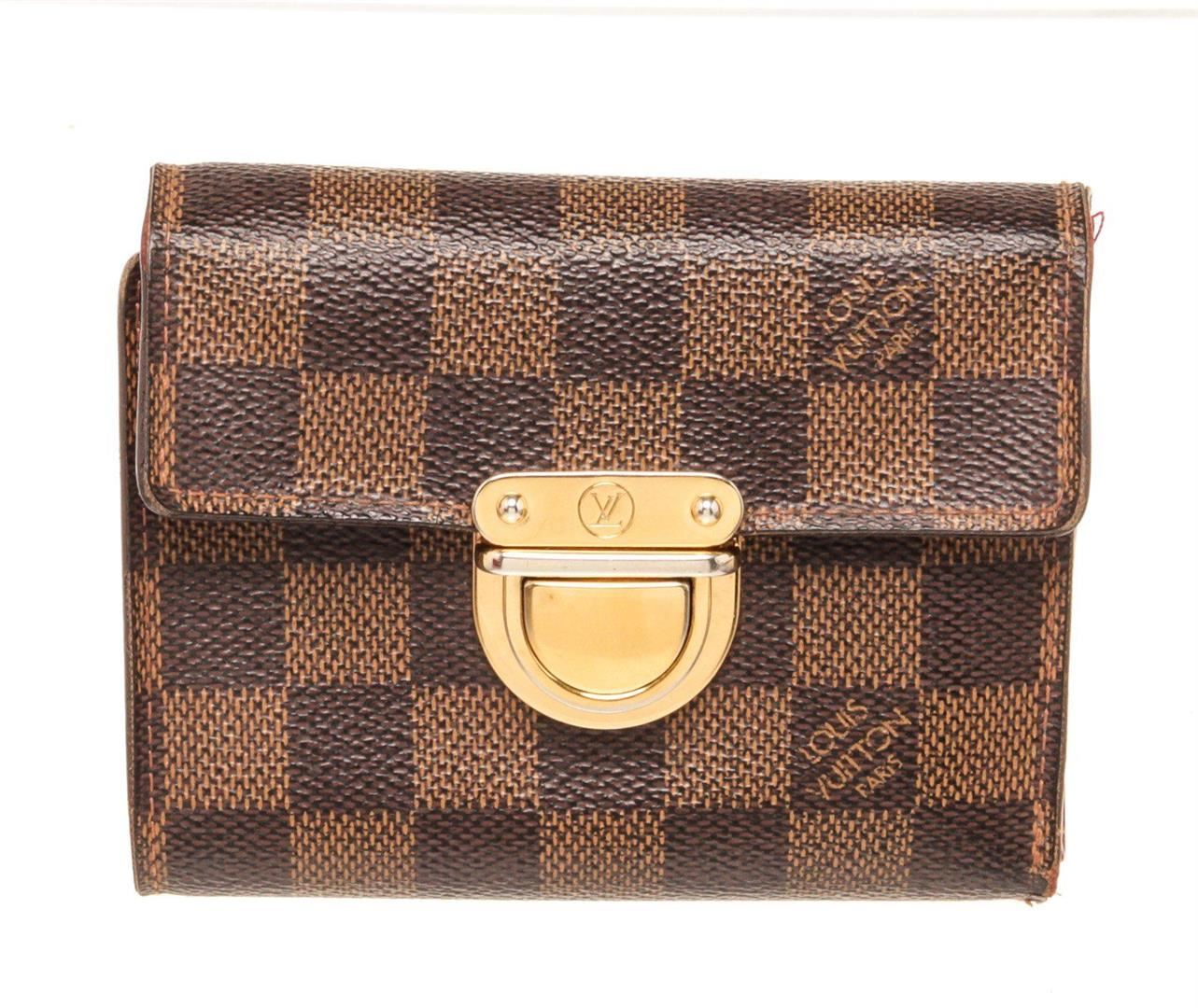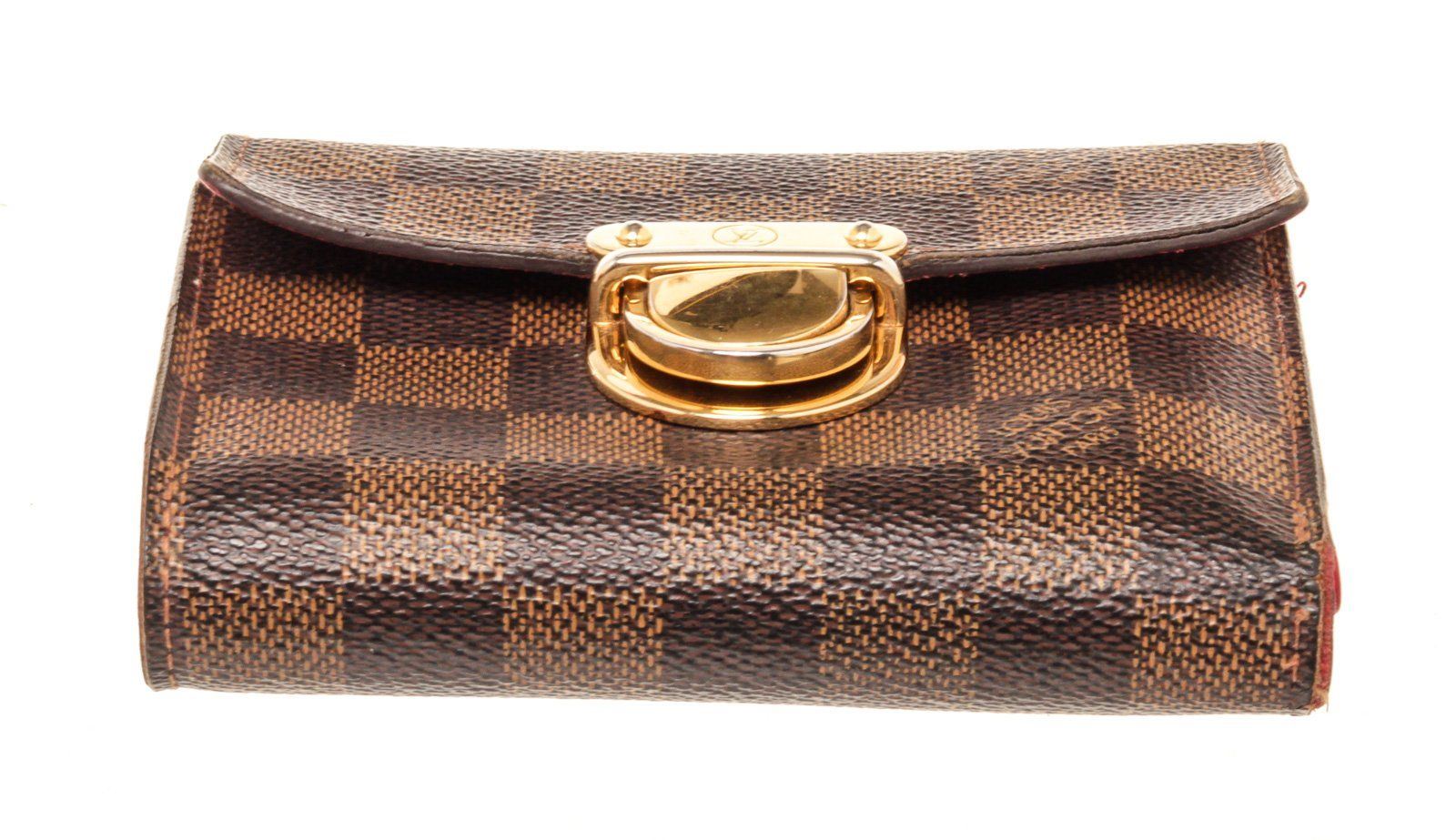 Louis Vuitton Brown Damier Canvas Joey Wallet with damier canvas, gold-tone hardware, embossed logo at front corner, interior zip pocket featuring dual slit pockets, single interior bill compartment, multiple slit pockets at interior walls and push-lock closure at front flap.