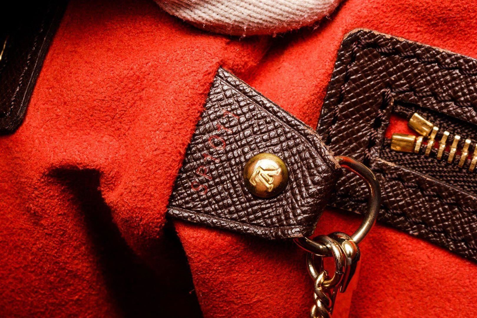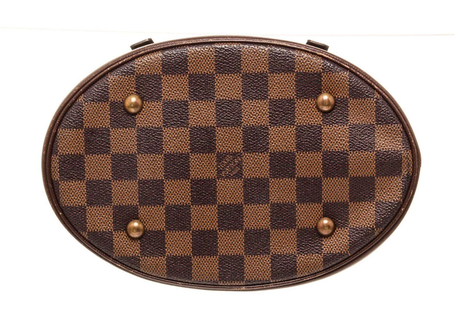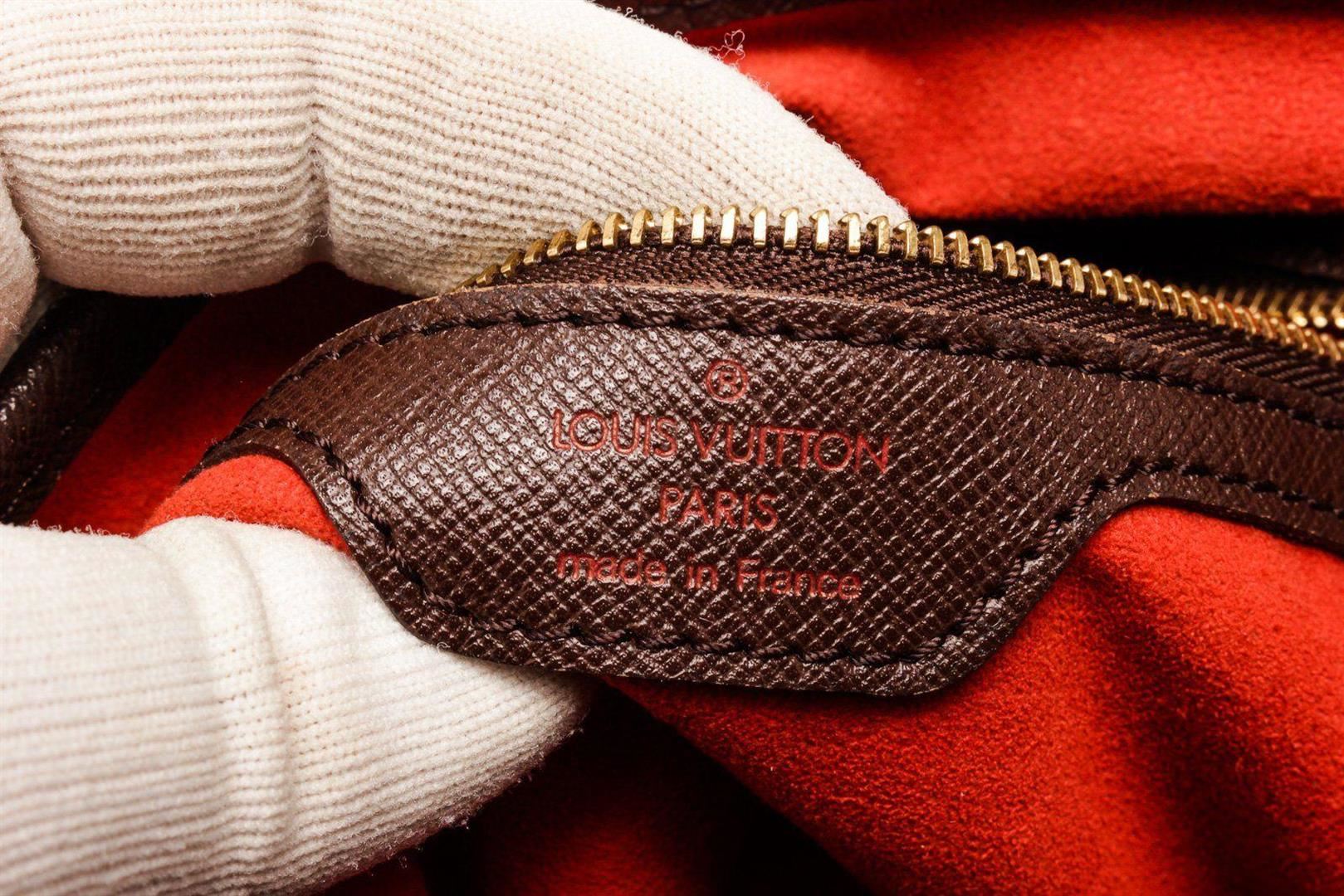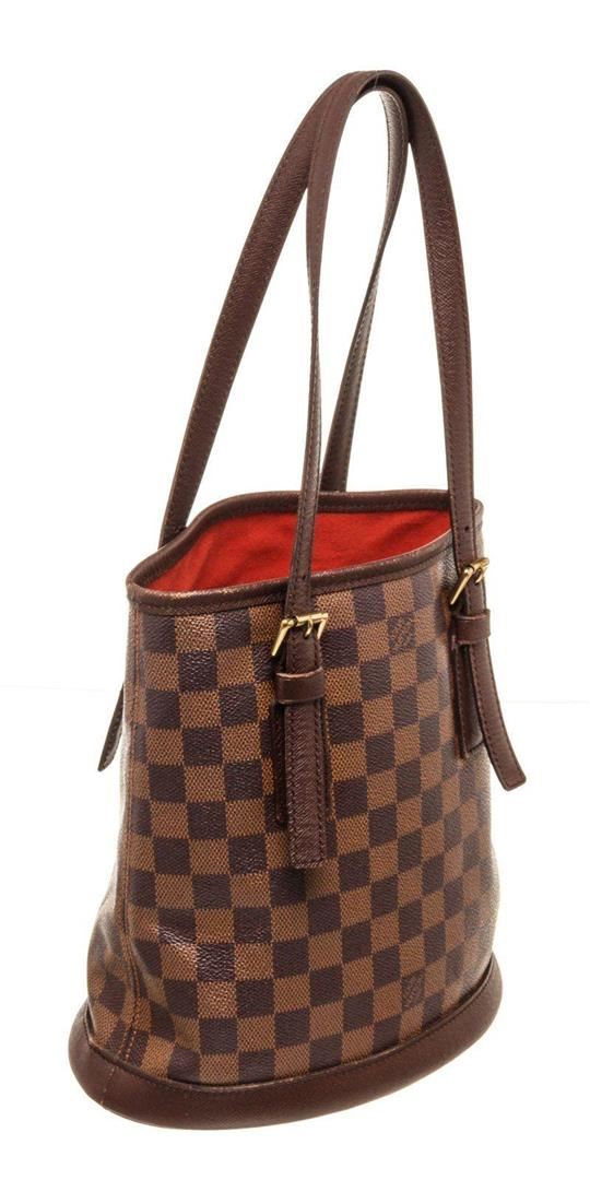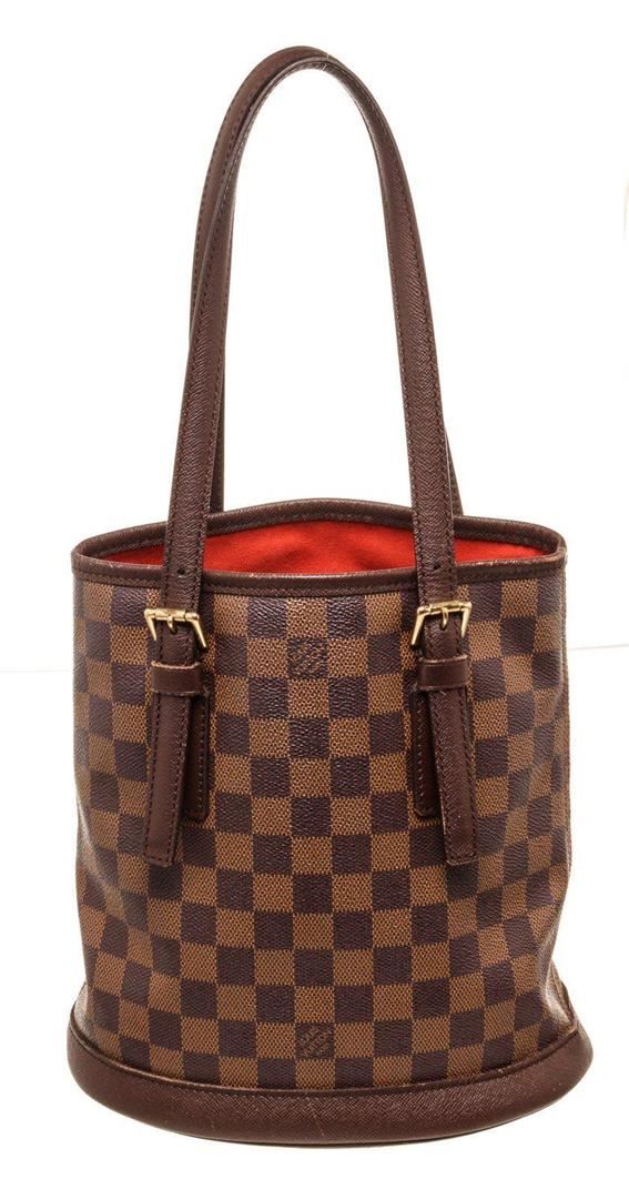Louis Vuitton Brown Damier Canvas Marais Bucket Bag with material damier canvas gold-tone hardware, trim tan vachetta leather, interior zip pocket, canvas lining, shoulder strap and flap closure.