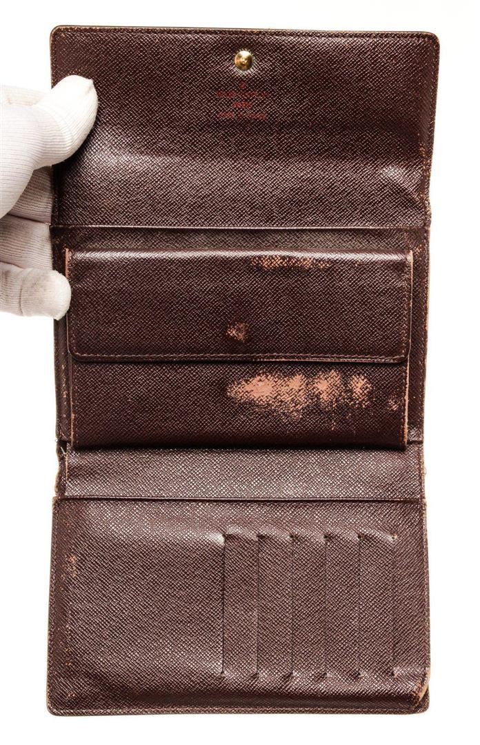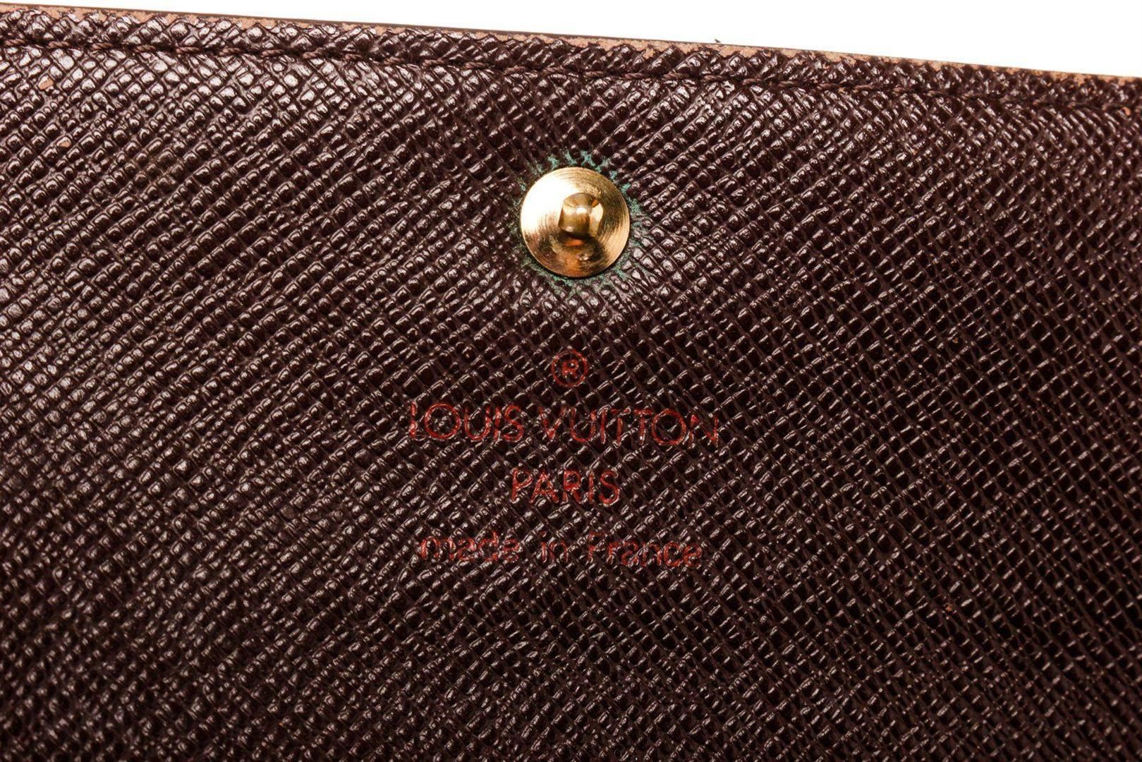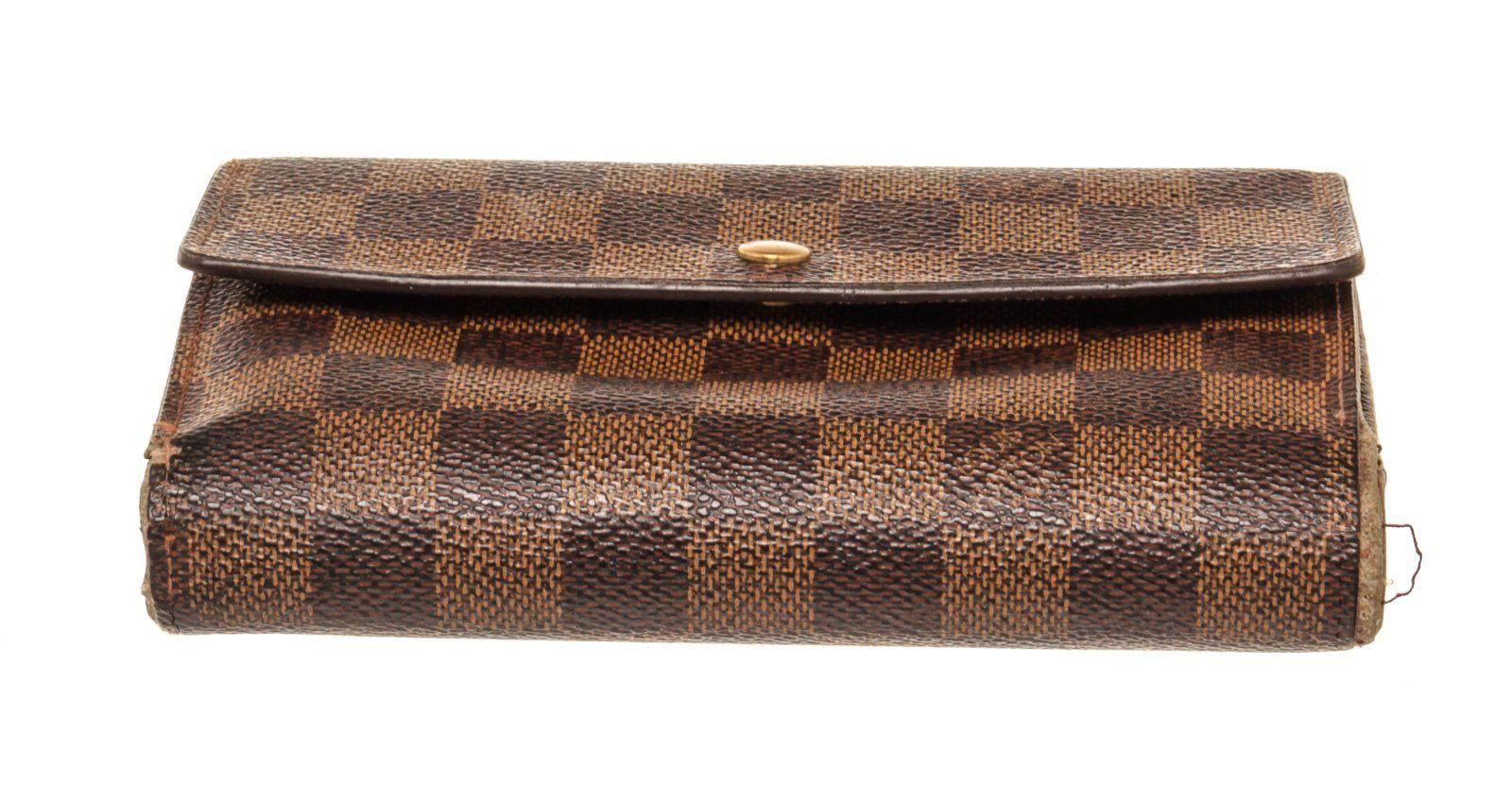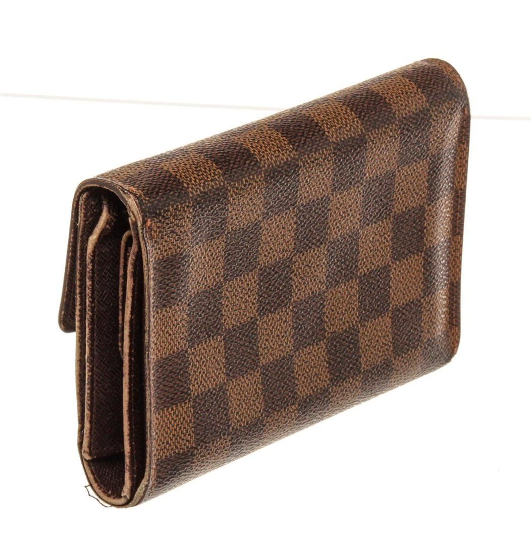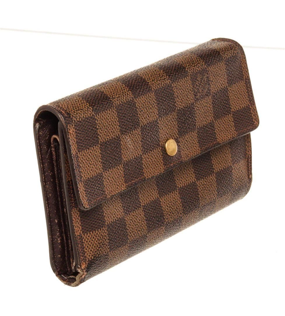 Louis Vuitton Brown Damier Canvas Porte Tresor Etui Pap Wallet with gold hardware, material, tan vachetta leather trim, and snap closure.