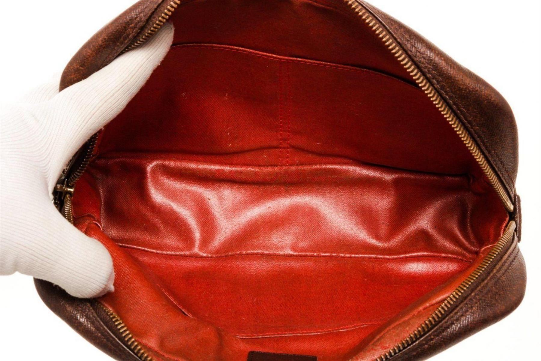 Louis Vuitton Brown Damier Canvas Toiletry Pouch Cosmetic Bag with material damier canvas, gold-tone hardware, trim tan vachetta leather, interior slip pocket and zipper closure.