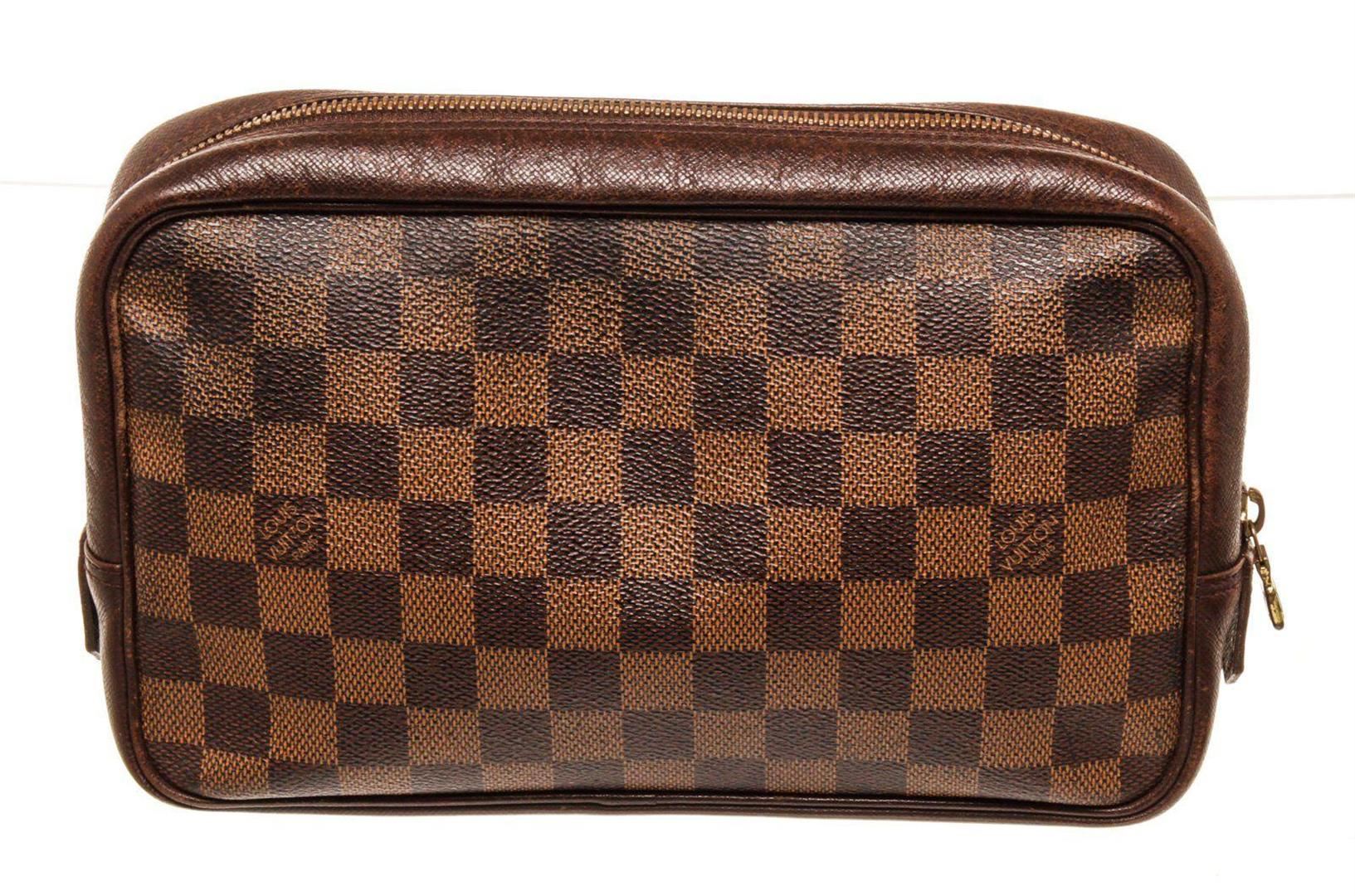 Louis Vuitton Brown Damier Canvas Toiletry Pouch Cosmetic Bag. All available information is listed in the description and shown in the photos. Louis Vuitton Brown Damier Canvas Toiletry Pouch Cosmetic Bag with material damier canvas, gold-tone hardware, trim tan vachetta leather, interior slip pocket and zipper closure.