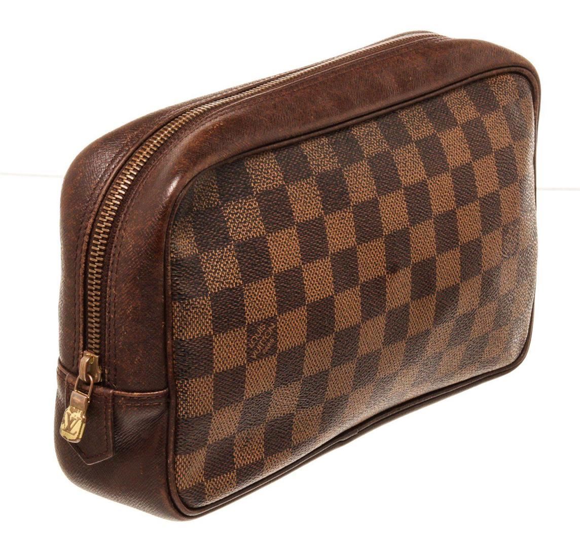 Louis Vuitton Brown Damier Canvas Toiletry Pouch Cosmetic Bag. All available information is listed in the description and shown in the photos. Louis Vuitton Brown Damier Canvas Toiletry Pouch Cosmetic Bag with material damier canvas, gold-tone hardware, trim tan vachetta leather, interior slip pocket and zipper closure.