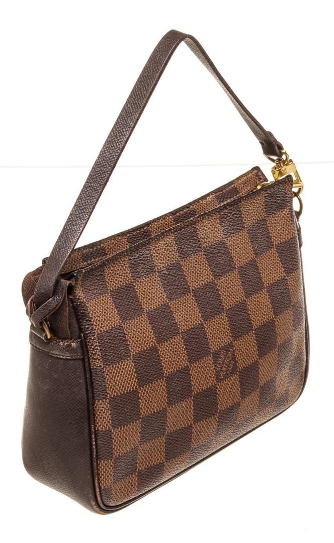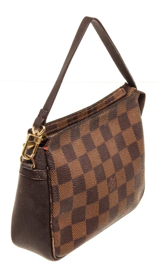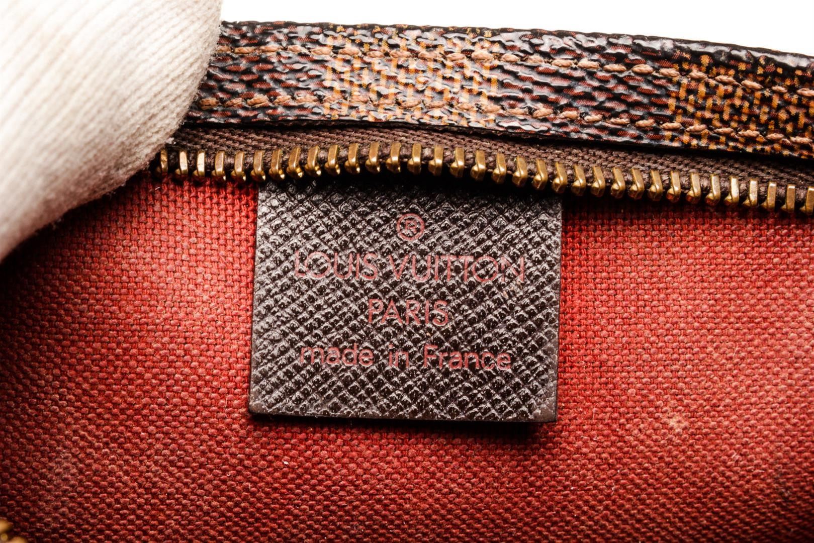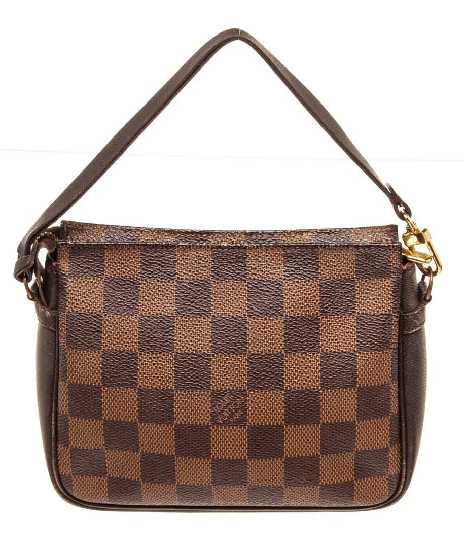 Louis Vuitton Brown Damier Canvas Trousse Toiletry Shoulder Bag with material damier canvas, brass hardware, creme coated canvas lining, single slit pocket, three elasticized compartments and zip-around closure at top.