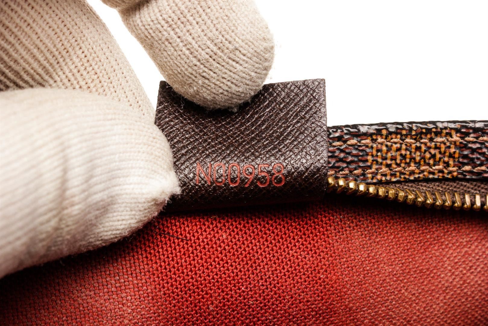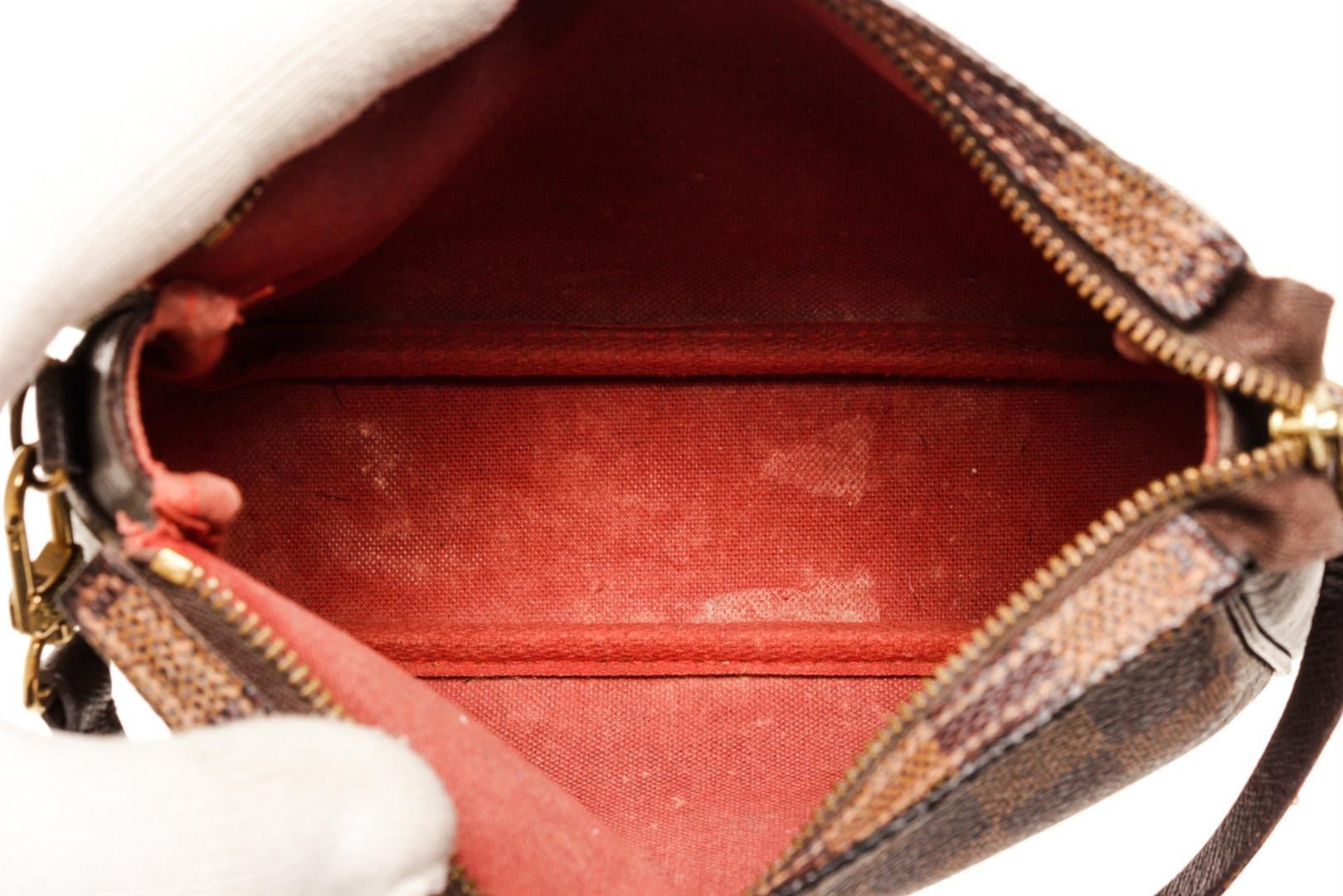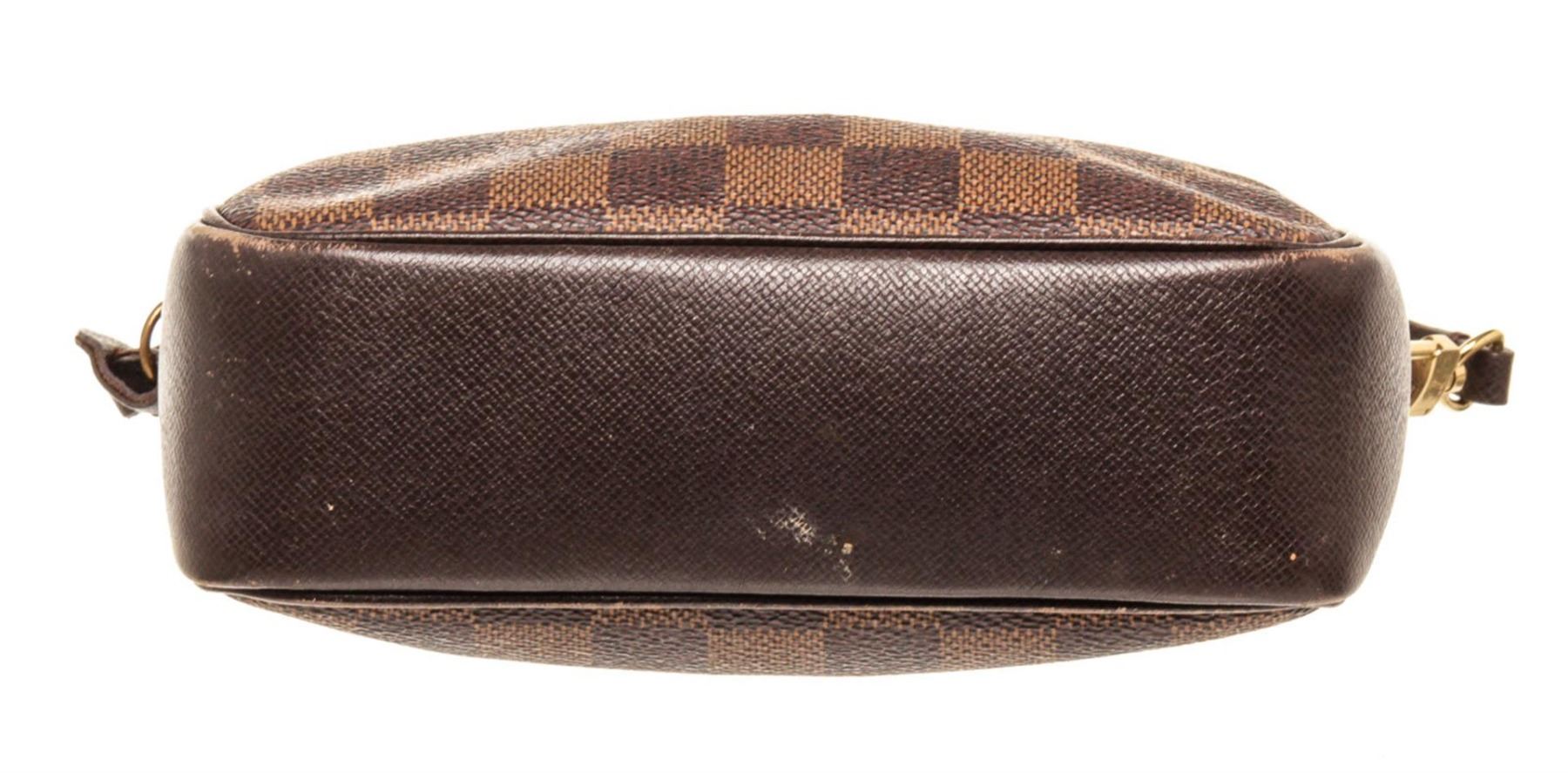 Louis Vuitton Brown Damier Canvas Trousse Toiletry Shoulder Bag with material damier canvas, brass hardware, creme coated canvas lining, single slit pocket, three elasticized compartments and zip-around closure at top.