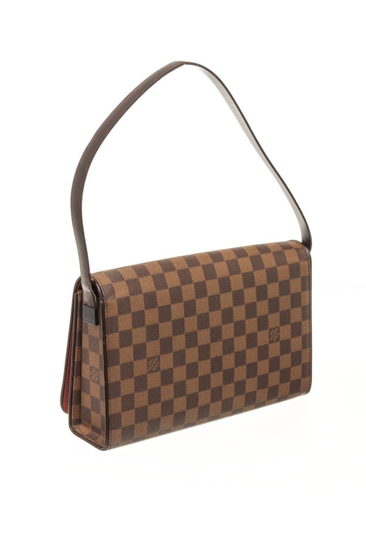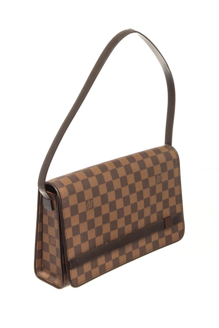 Louis Vuitton Brown Damier Ebène Canvas Tribeca Ron Shoulder Bag. All available information is listed in the description and shown in the photos. louis vuitton brown damier ebène canvas tribeca ron shoulder bag with gold-tone hardware, internal logo stamp internal zip-fastening pocket, main compartment, single shoulder strap leather trim. Depth 2.8 in, Handle 8.3 in, Height 6.7 in, Width 11.2 in / Depth 7 cm, Handle 21 cm, Height 17 cm, Width 28.5 cm