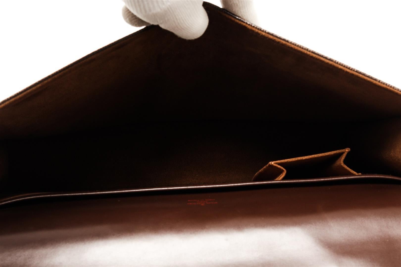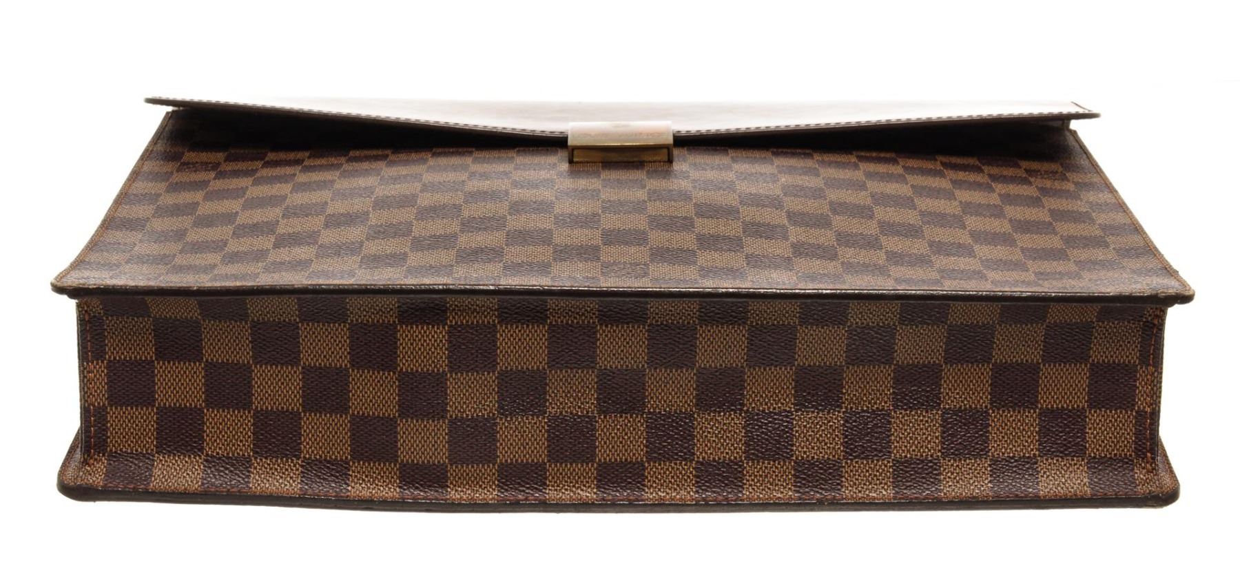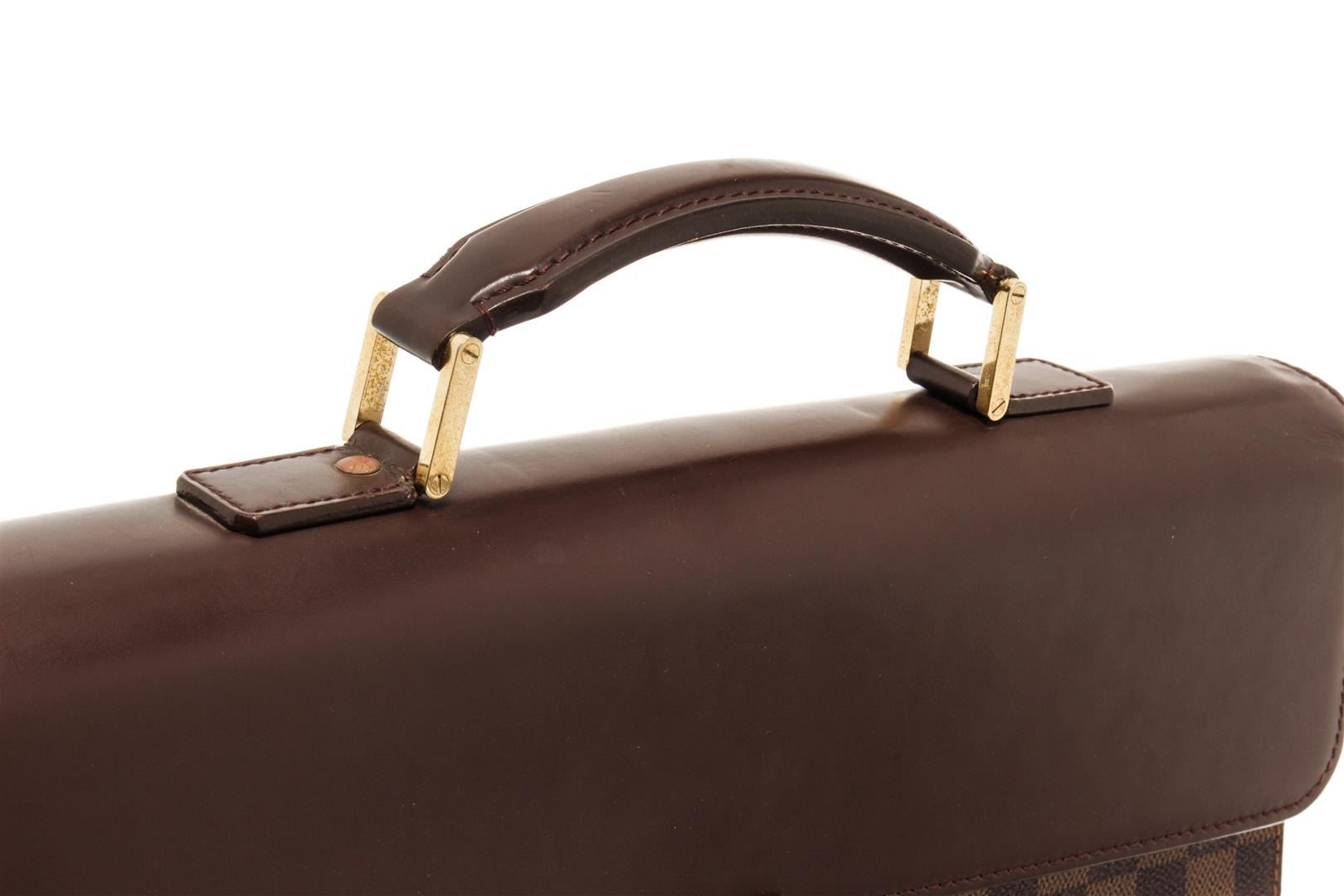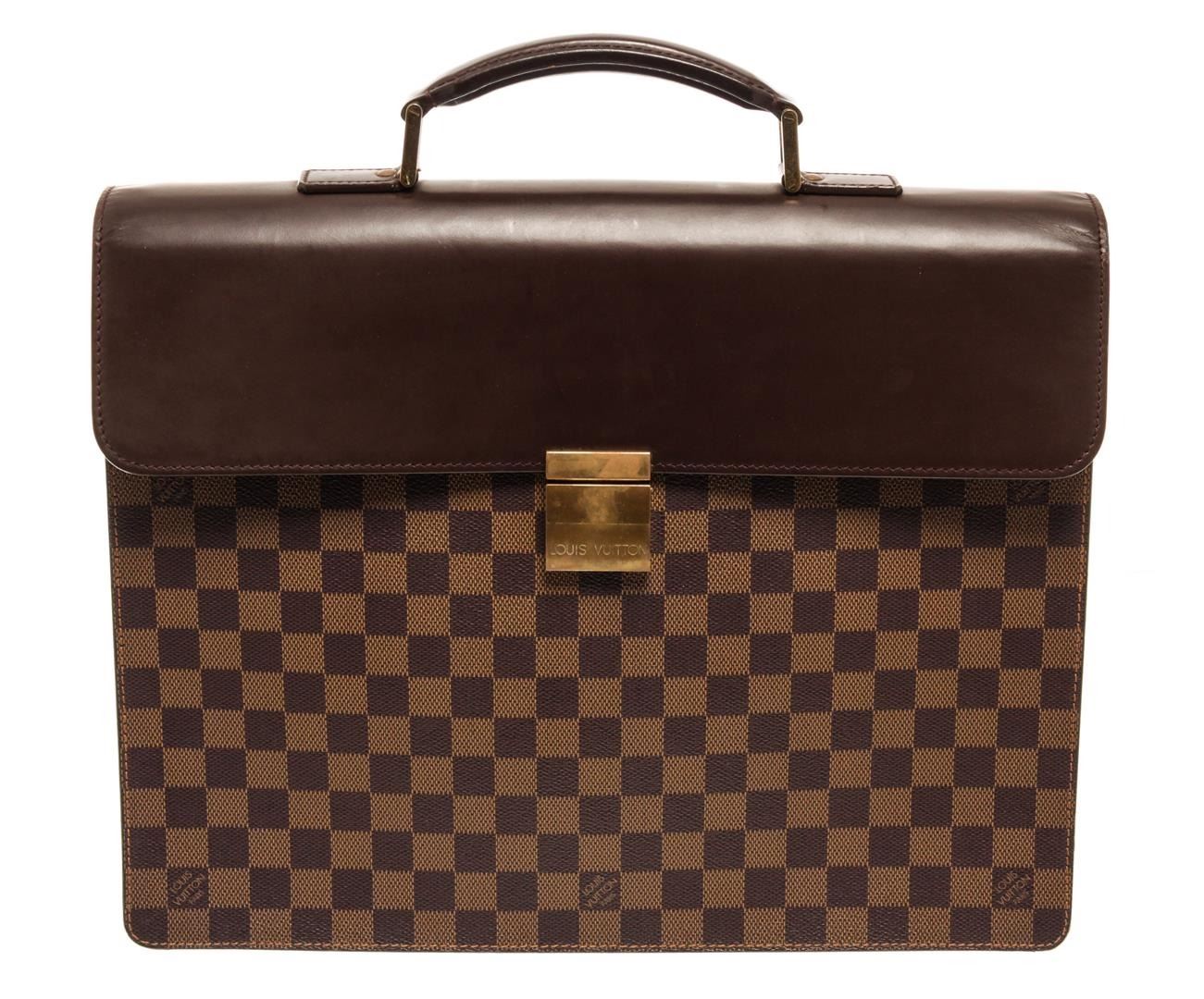 One Louis Vuitton Brown Damier Ebene Altona PM Briefcase. Item is sold AS-IS. All available information is listed in the description and shown in the photo. Louis Vuitton Brown Damier Ebene Altona PM Briefcase with gold tone hardware, with brown leather trim, brown suede lining, interior open pockets, with a buckle closure.