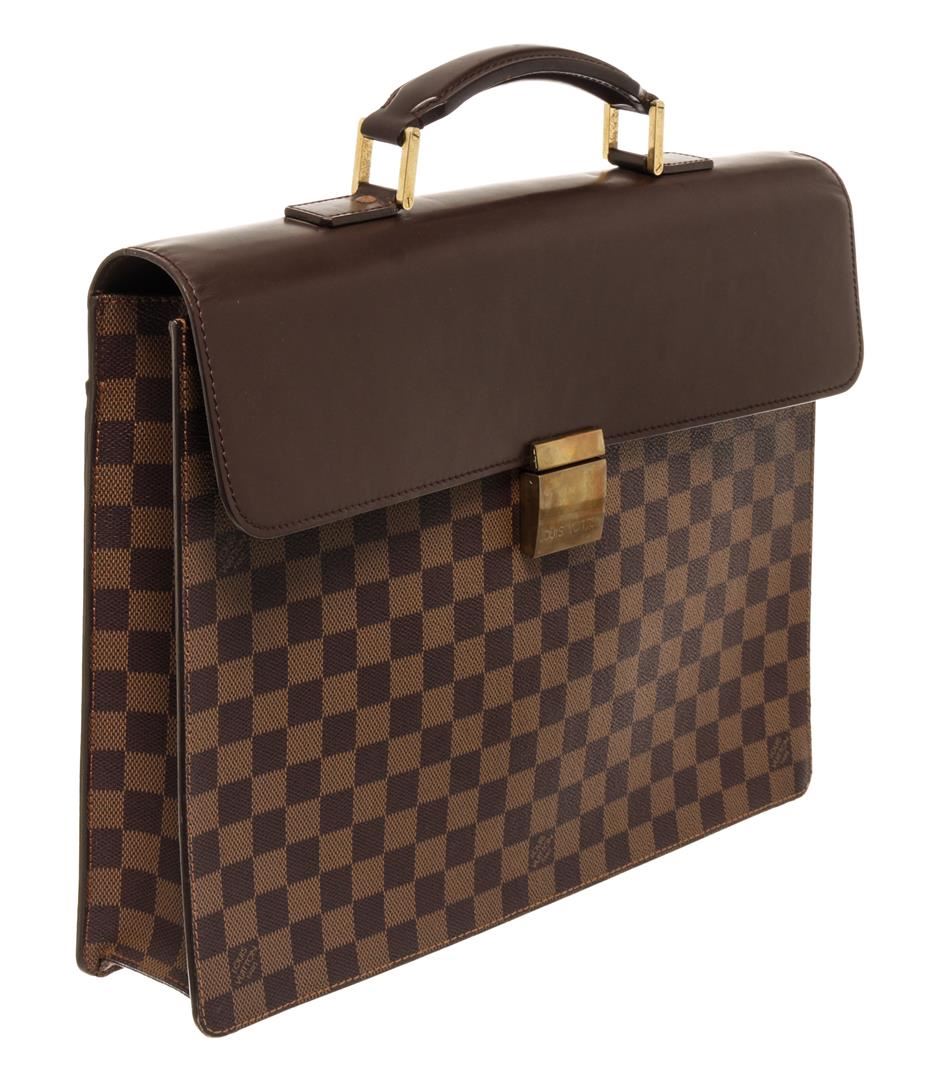 One Louis Vuitton Brown Damier Ebene Altona PM Briefcase. Item is sold AS-IS. All available information is listed in the description and shown in the photo. Louis Vuitton Brown Damier Ebene Altona PM Briefcase with gold tone hardware, with brown leather trim, brown suede lining, interior open pockets, with a buckle closure.