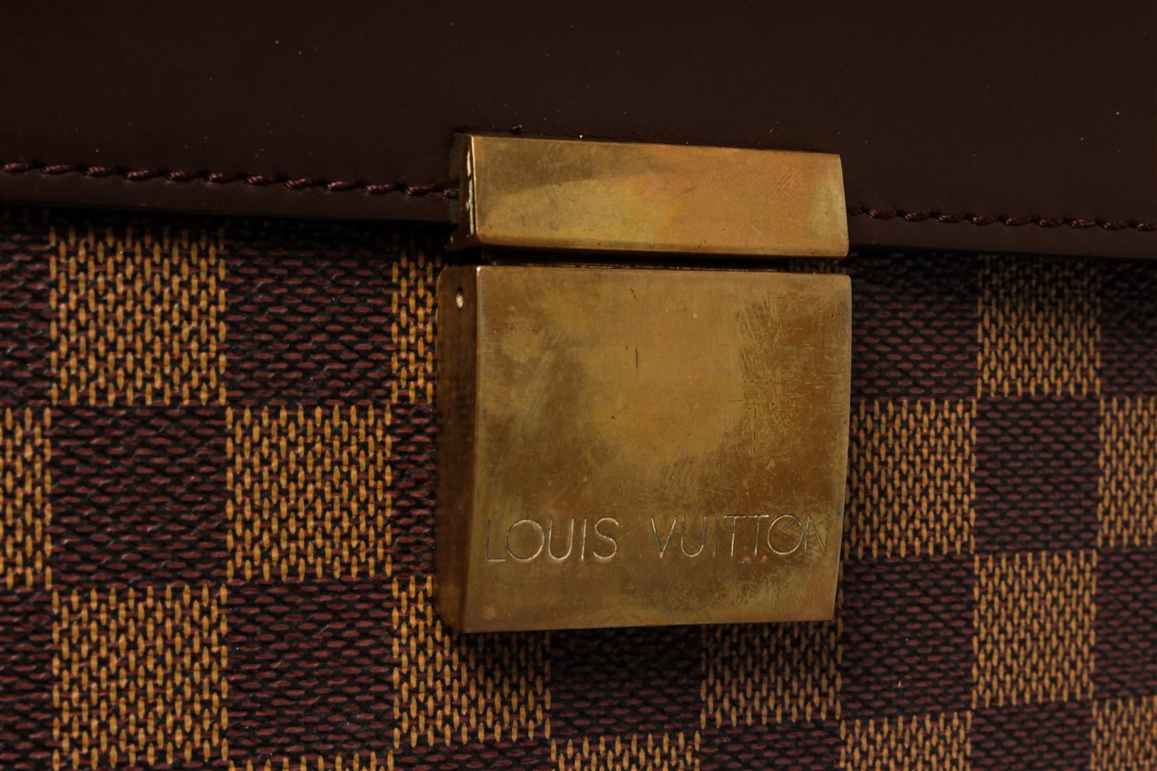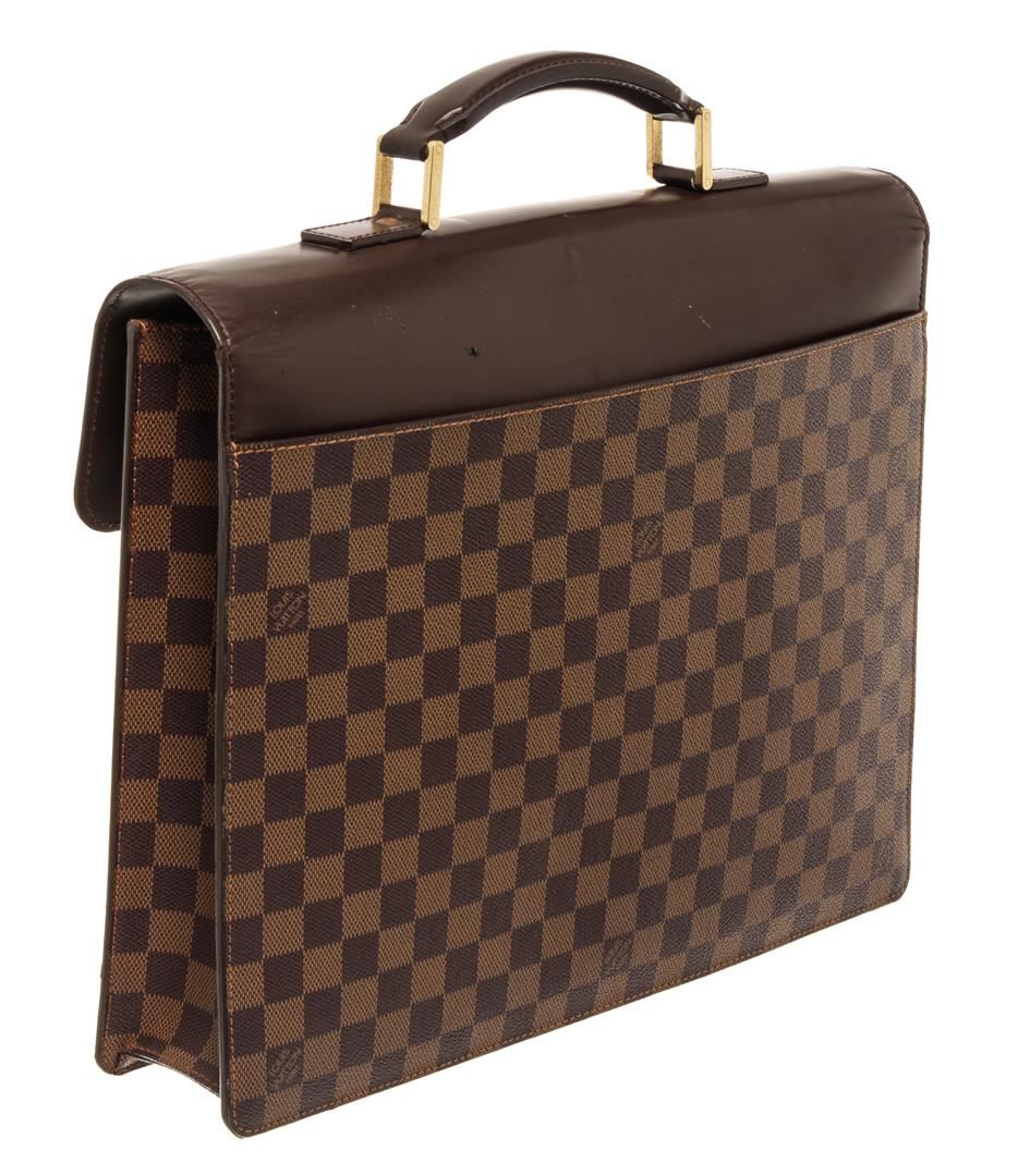 One Louis Vuitton Brown Damier Ebene Altona PM Briefcase. Item is sold AS-IS. All available information is listed in the description and shown in the photo. Louis Vuitton Brown Damier Ebene Altona PM Briefcase with gold tone hardware, with brown leather trim, brown suede lining, interior open pockets, with a buckle closure.