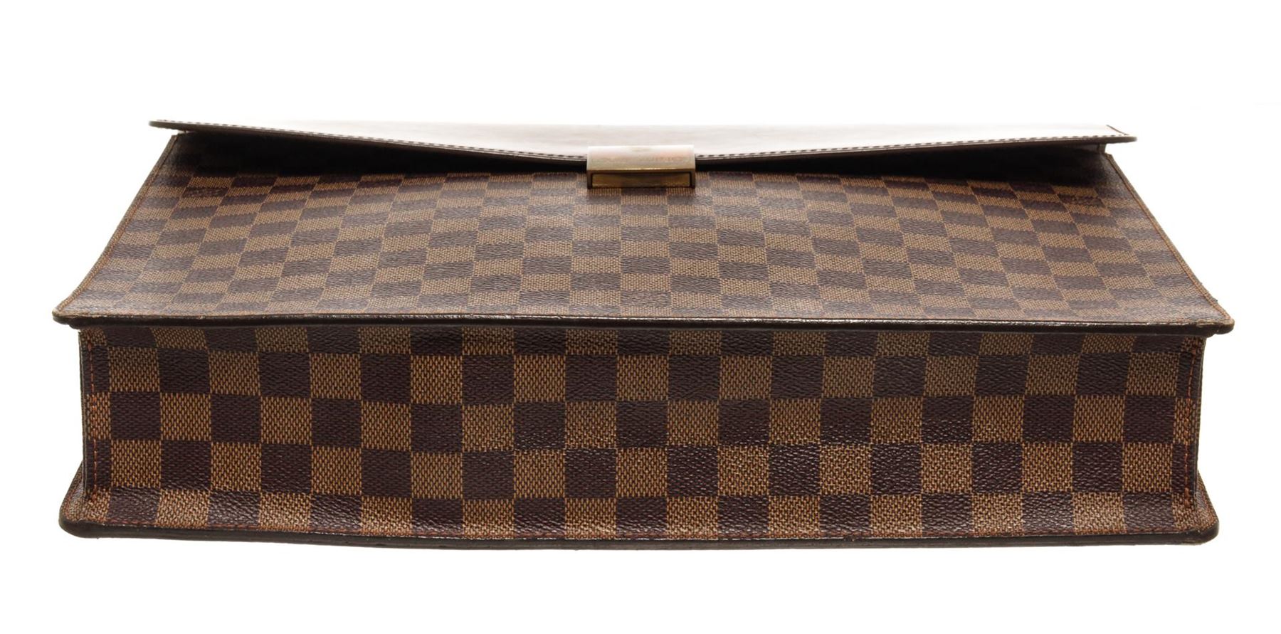 One Louis Vuitton Brown Damier Ebene Altona PM Briefcase. Item is sold AS-IS. All available information is listed in the description and shown in the photo. Louis Vuitton Brown Damier Ebene Altona PM Briefcase with gold tone hardware, with brown leather trim, brown suede lining, interior open pockets, with a buckle closure.