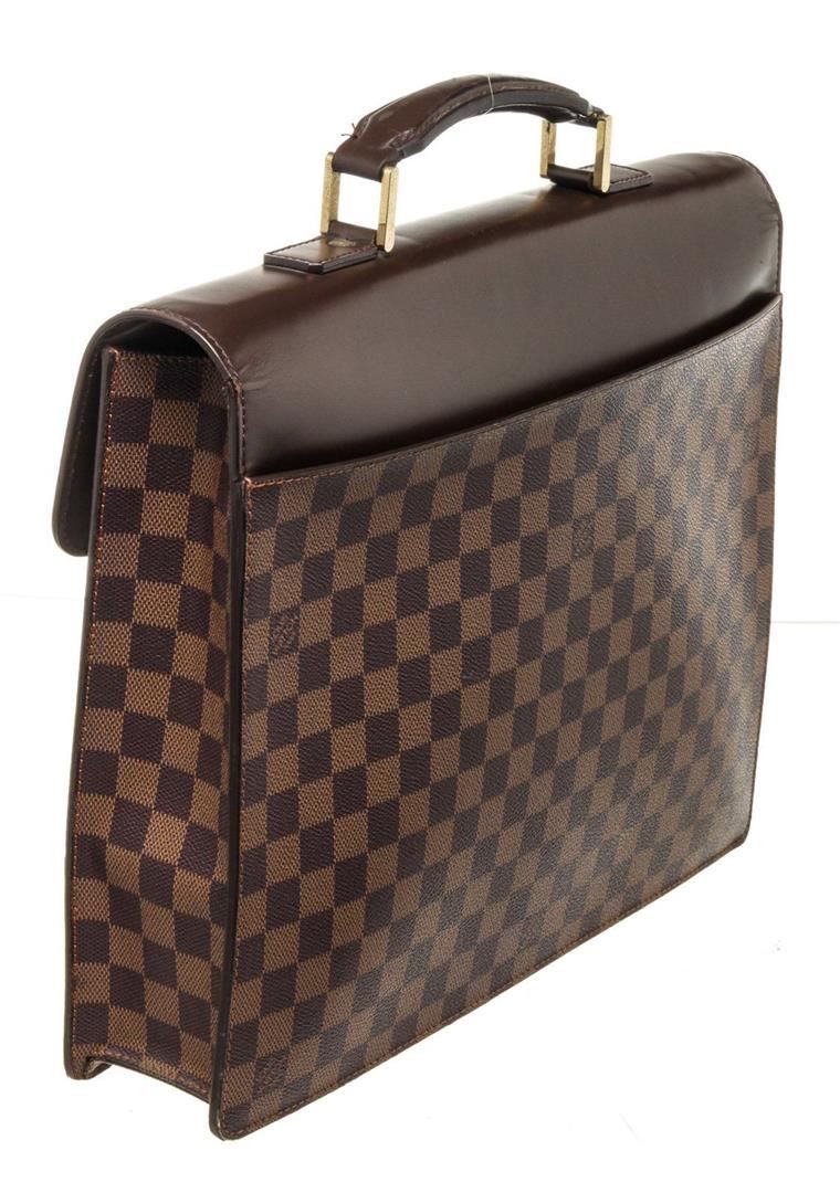 Louis Vuitton Brown Damier Ebene Altona PM Briefcases Bag with damier ebene, gold-tone hardware, damier ebene material, tan vachetta leather trim, top handle, leather shoulder strap, and zipper closure.
