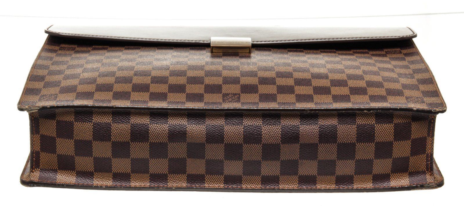 Louis Vuitton Brown Damier Ebene Altona PM Briefcases Bag with damier ebene, gold-tone hardware, damier ebene material, tan vachetta leather trim, top handle, leather shoulder strap, and zipper closure.