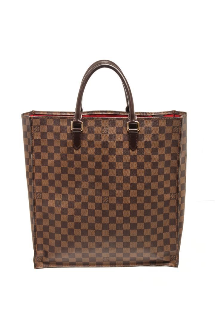 One Louis Vuitton Brown Damier Ebene Canvas Sac Plat Tote Bag. Item is sold AS-IS. All available information is listed in the description and shown in the photo. Louis Vuitton Brown Damier Ebene Canvas Sac Plat Tote Bag with gold-tone hardware, internal logo patch internal patch pockets main compartment, two rounded top handles leather trim, open top, red suede lining. Depth 3.9 in, Handle 4.7 in, Height 15 in, Width 14.2 in/ Depth 10 cm, Handle 12 cm, Height 38 cm, Width 36 cm