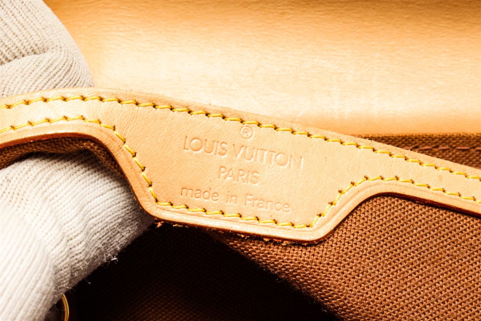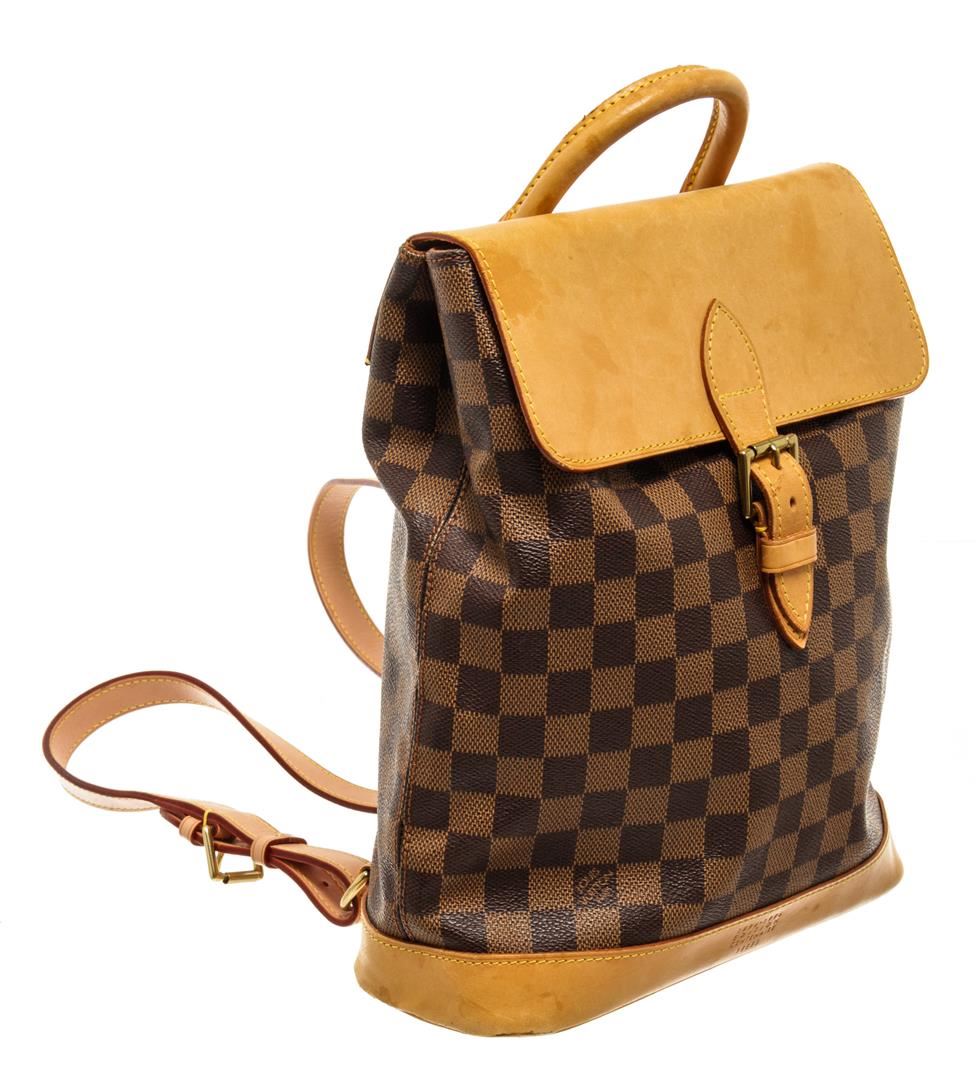 One Louis Vuitton Brown Damier Ebene Soho Backpack. Item is sold AS-IS. All available information is listed in the description and shown in the photo. Louis Vuitton Brown Damier Ebene Soho Backpack with top handle, gold hardware, brown fabric lining, interior pocket, buckle closure.