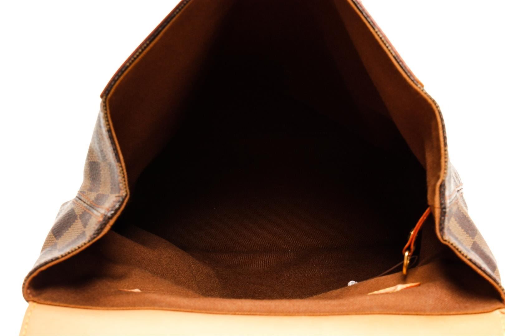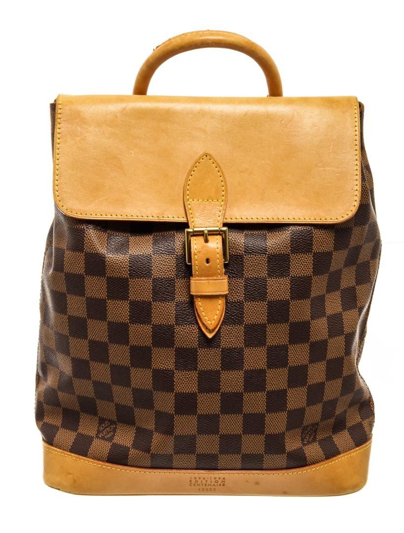 One Louis Vuitton Brown Damier Ebene Soho Backpack. Item is sold AS-IS. All available information is listed in the description and shown in the photo. Louis Vuitton Brown Damier Ebene Soho Backpack with top handle, gold hardware, brown fabric lining, interior pocket, buckle closure.